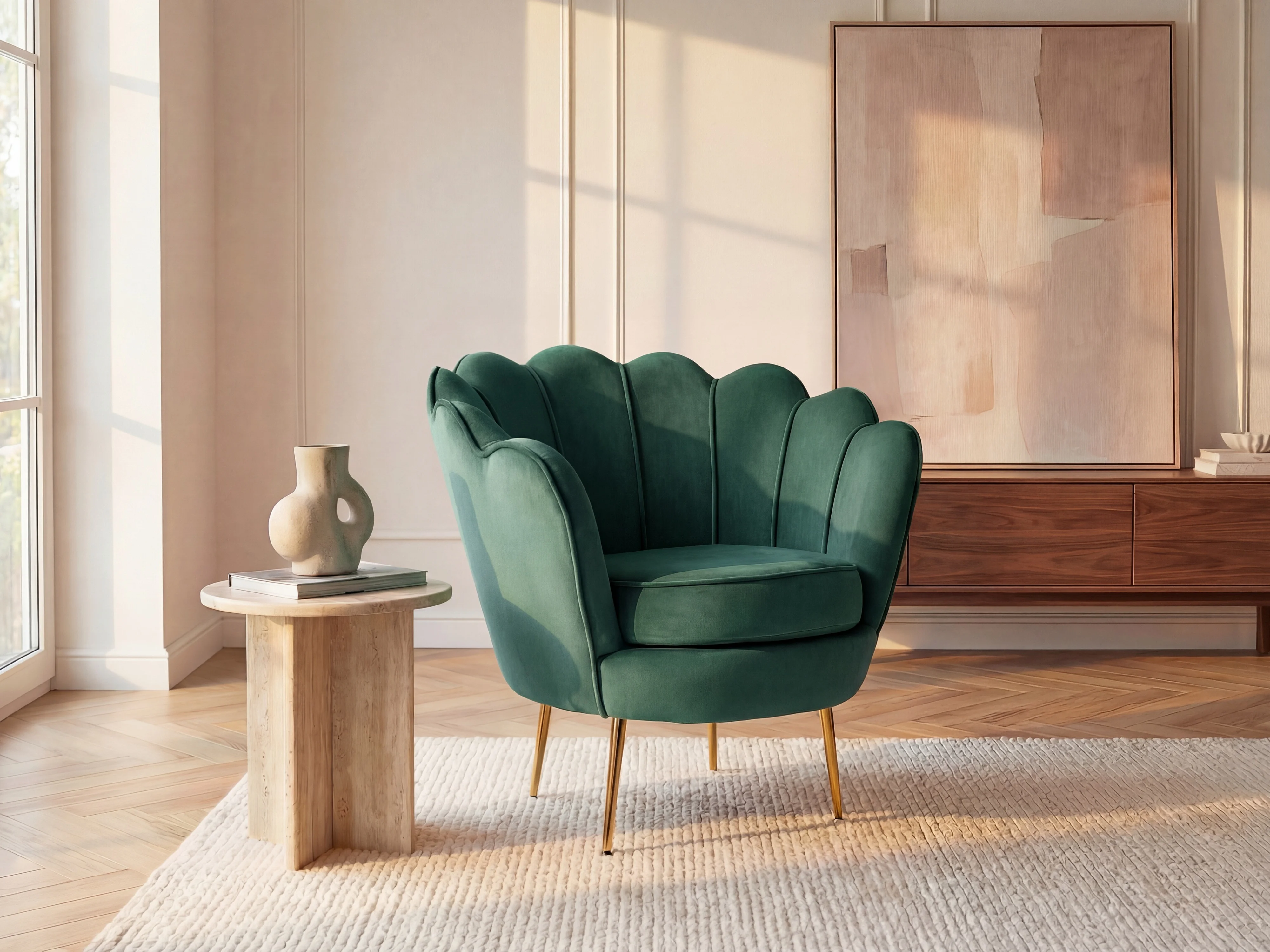 Schelpvormige fauteuil van spargroen velours DANDELION - van Pascal Morabito