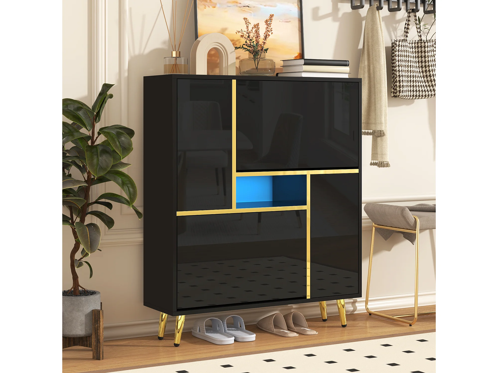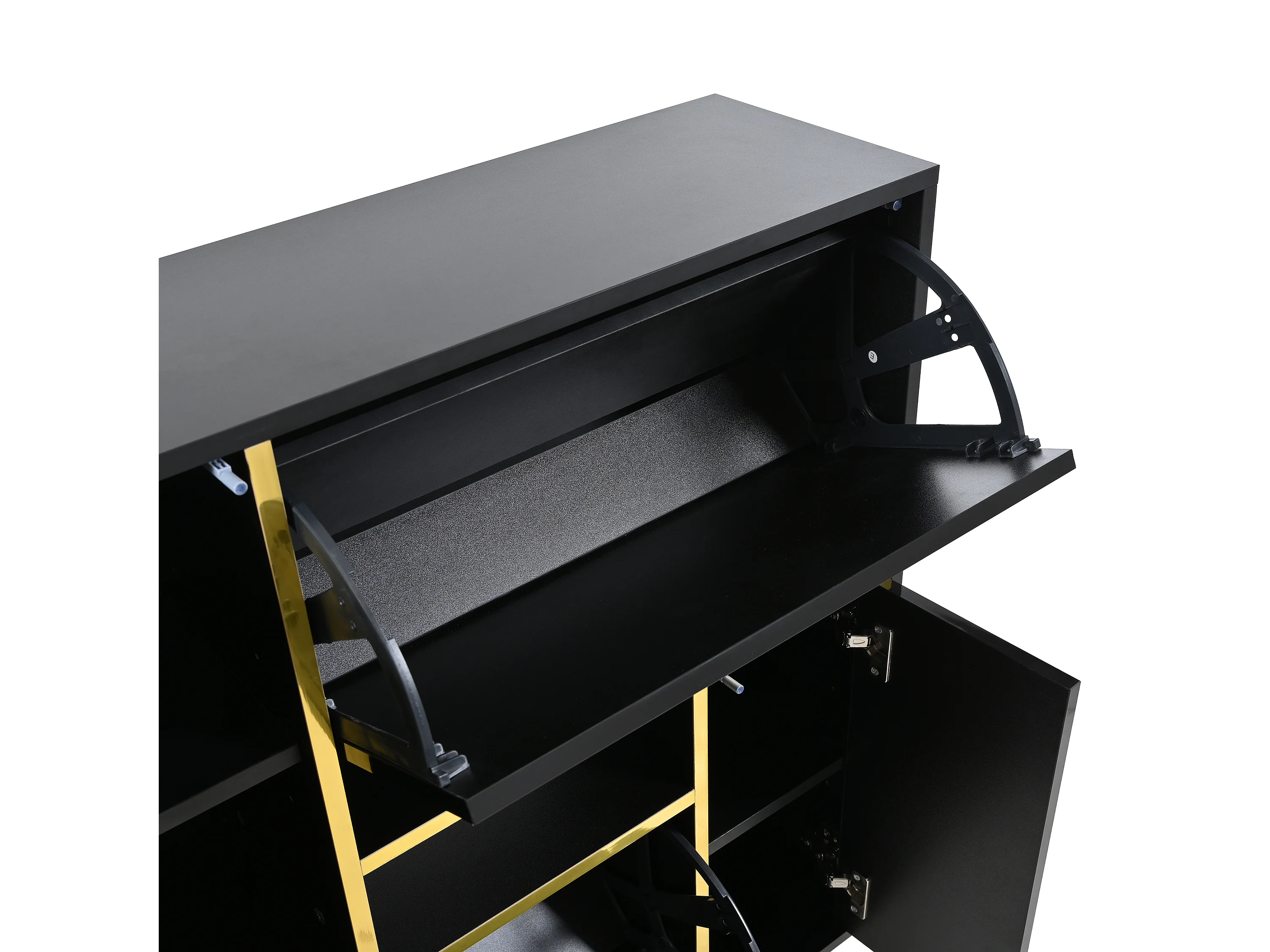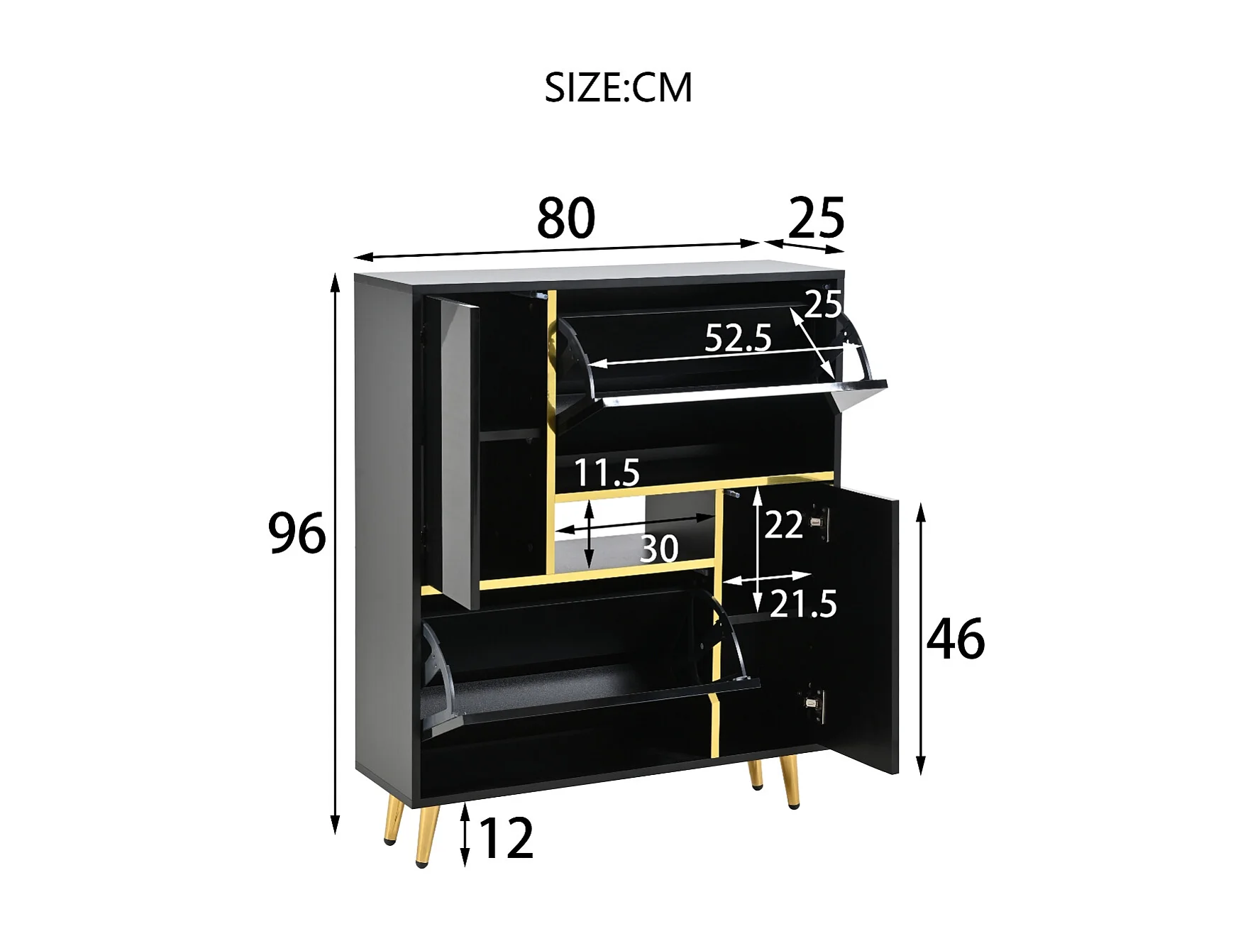 Zwarte schoenenkast met 2 opberglades en 4 deuren, gouden handgrepen en poten