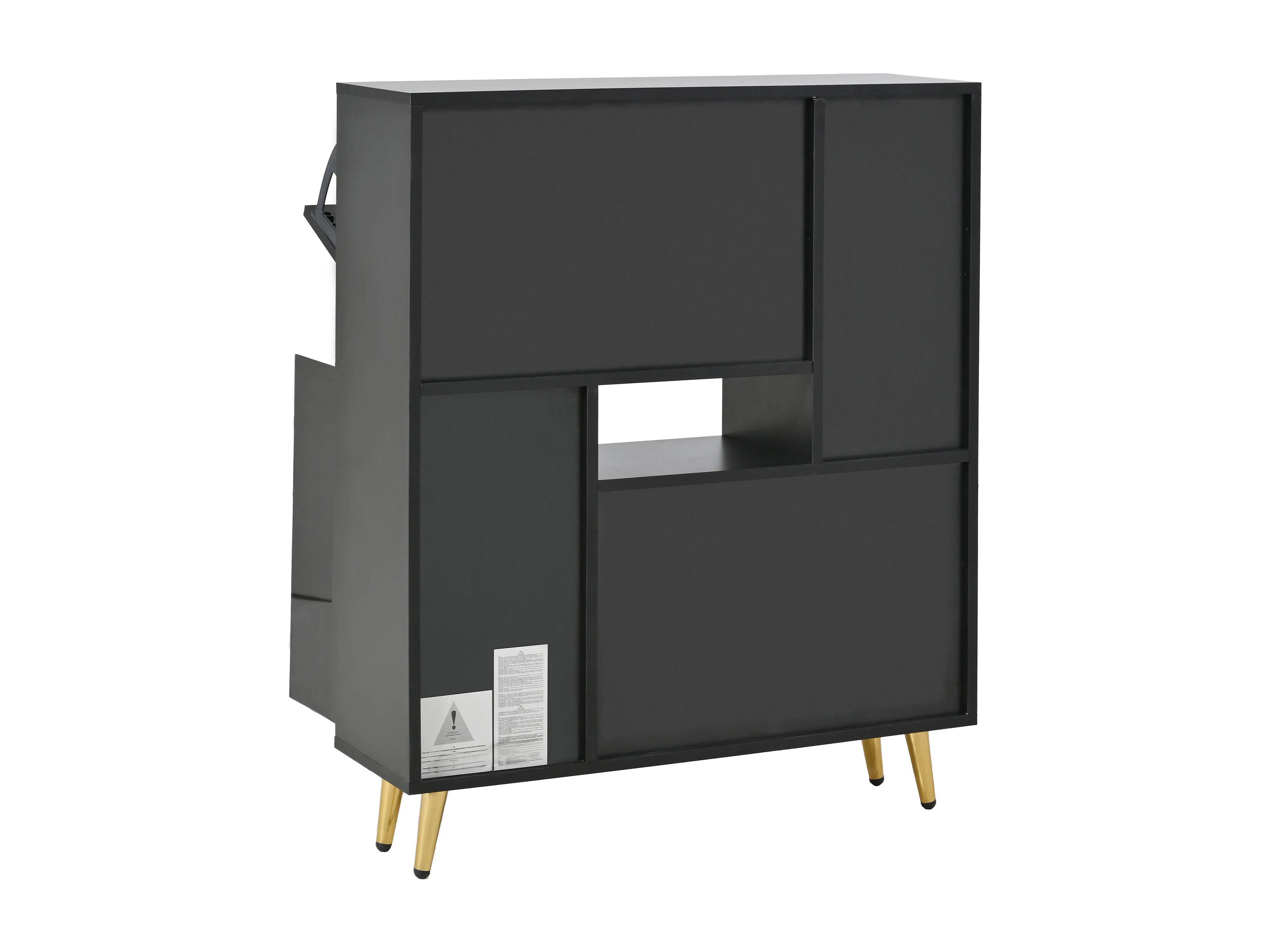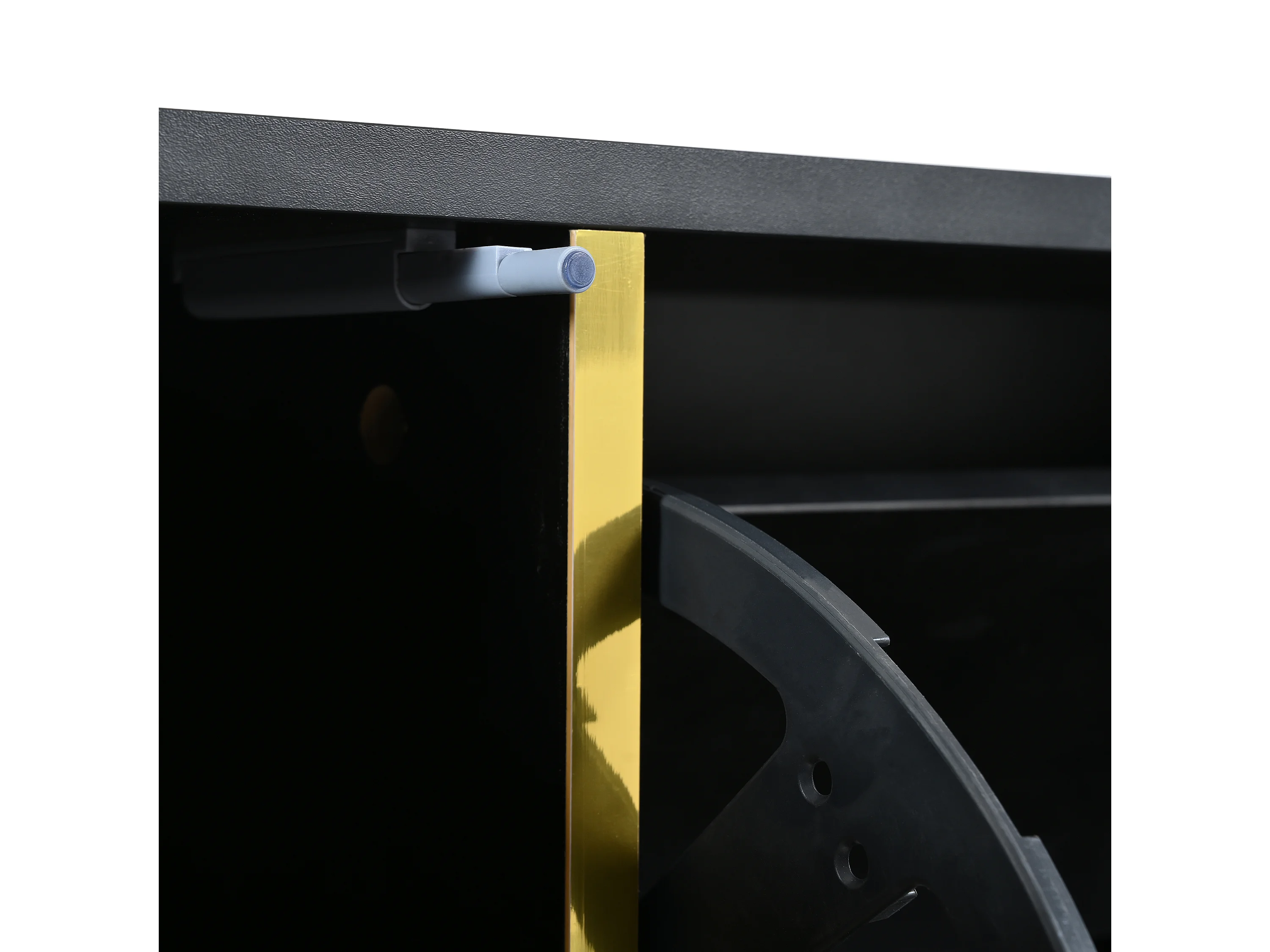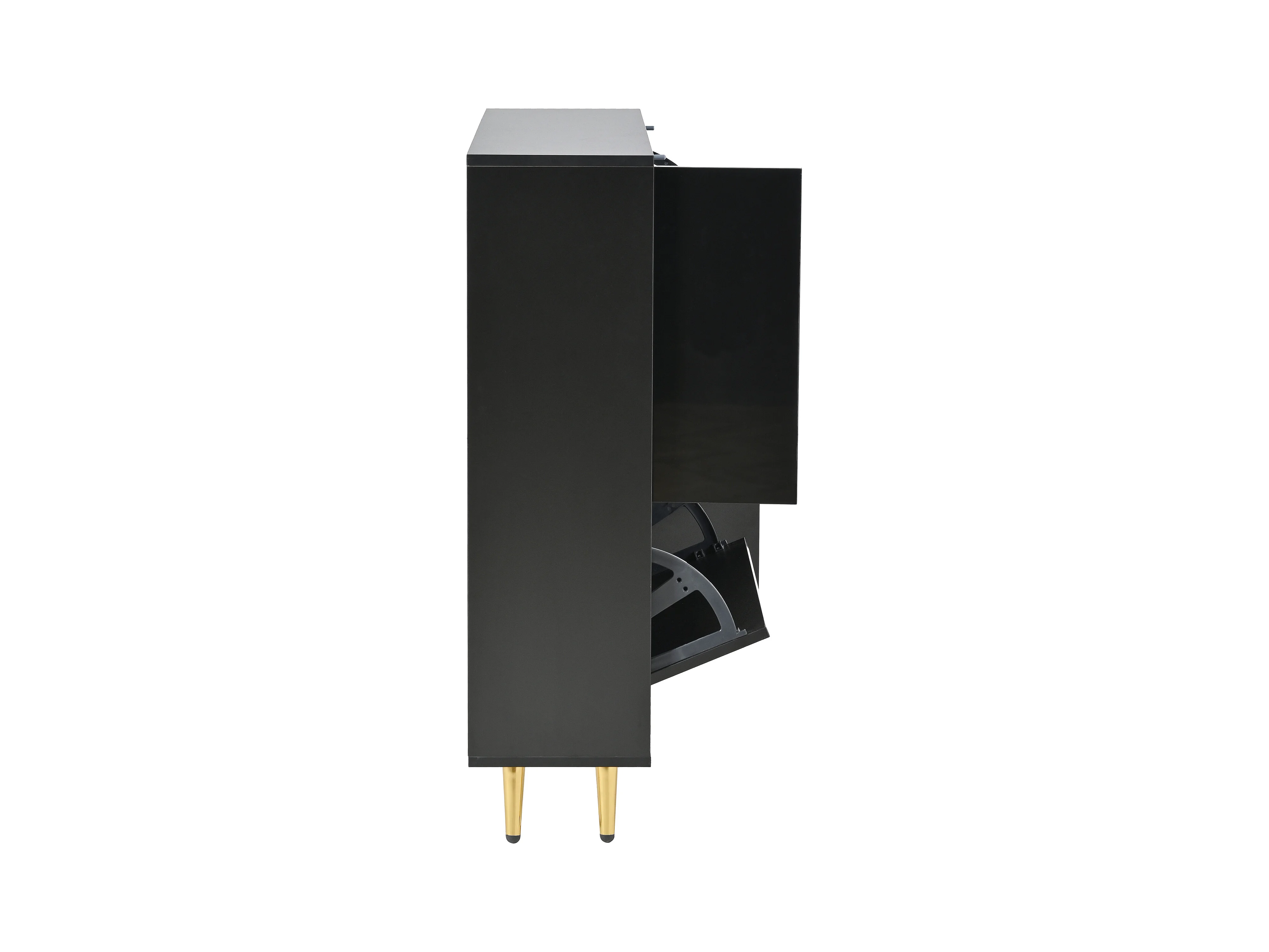 Zwarte schoenenkast met 2 opberglades en 4 deuren, gouden handgrepen en poten