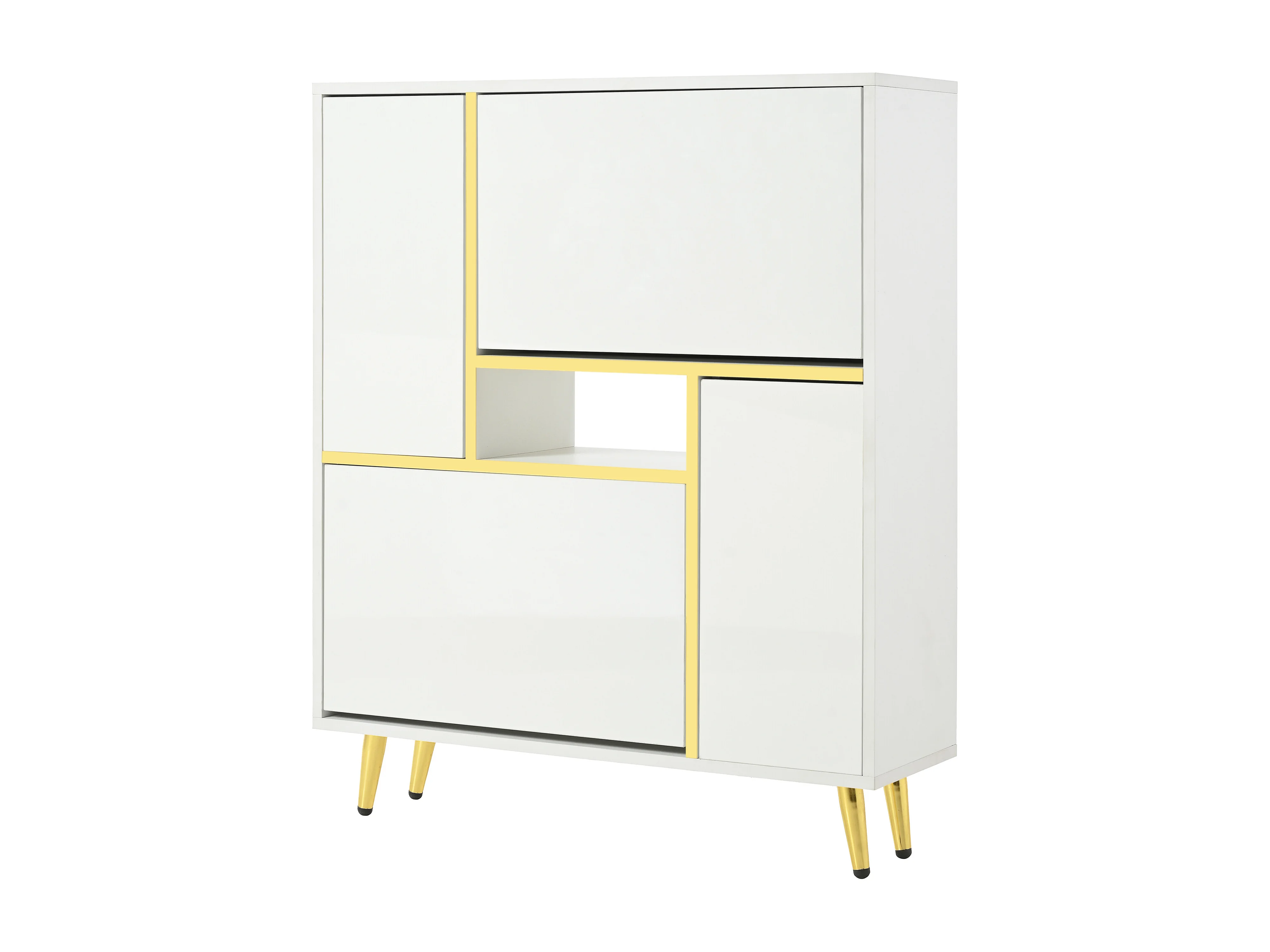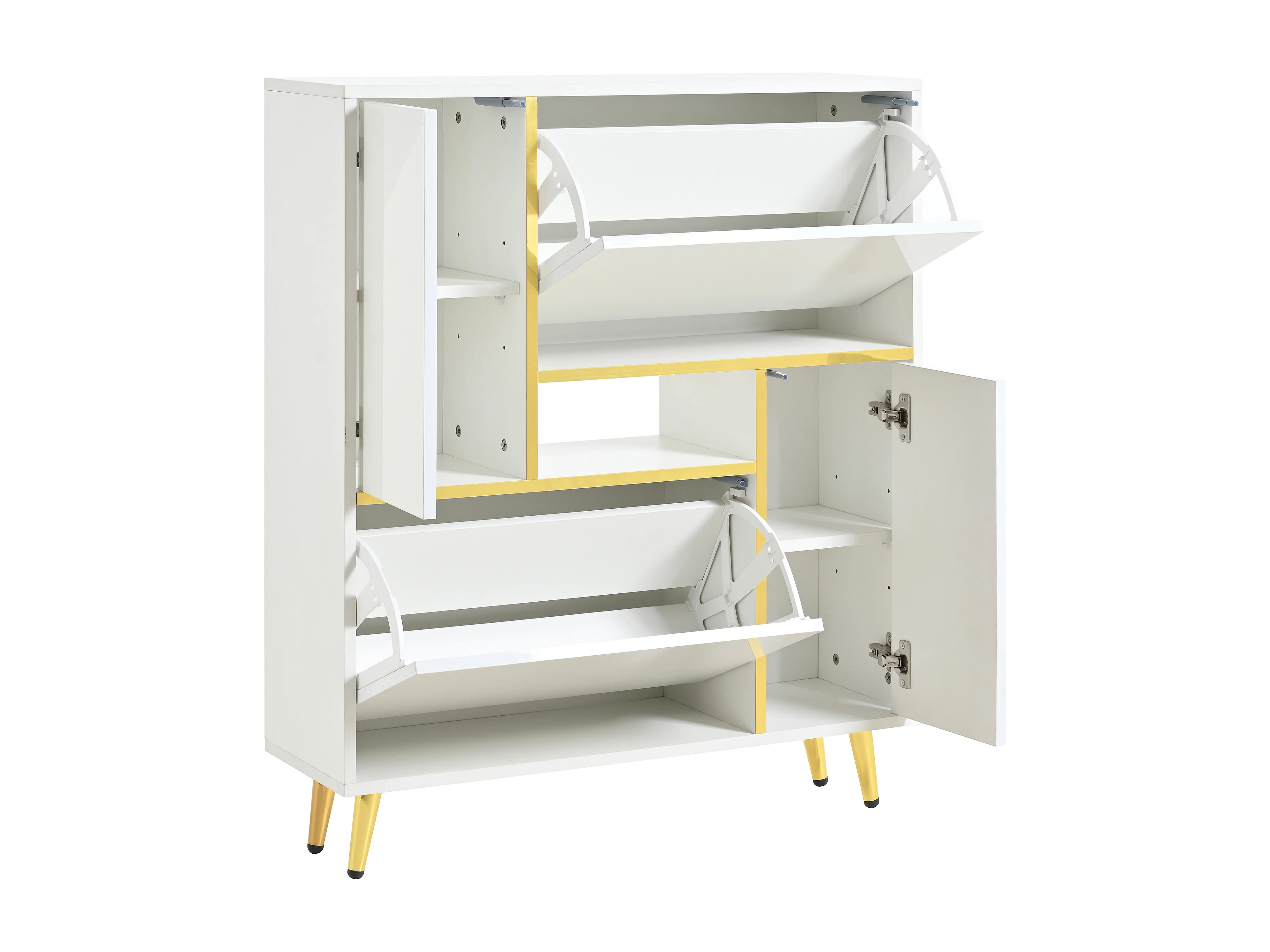 Witte schoenenkast met 2 opberglades en 4 deuren, gouden handgrepen en poten