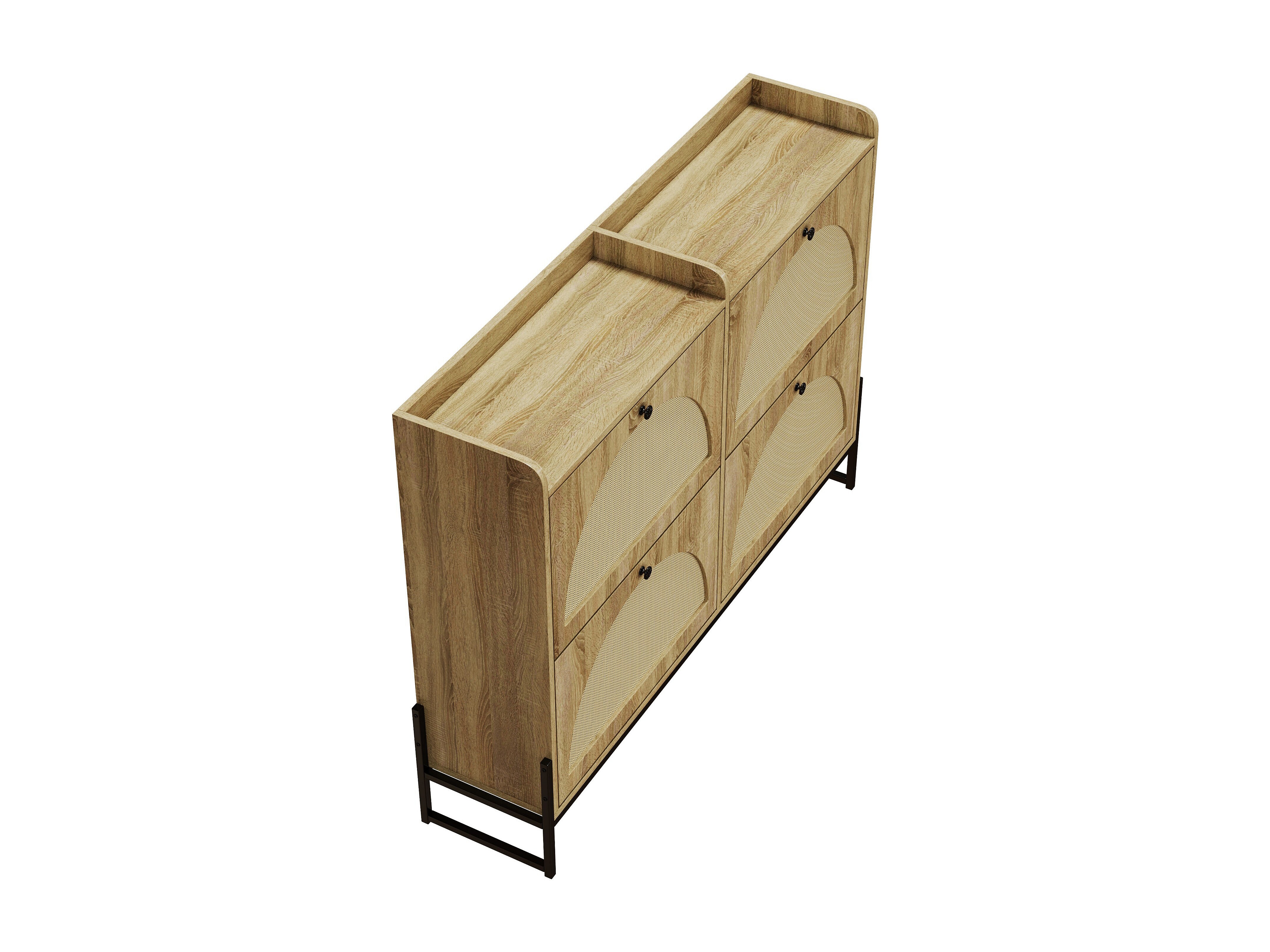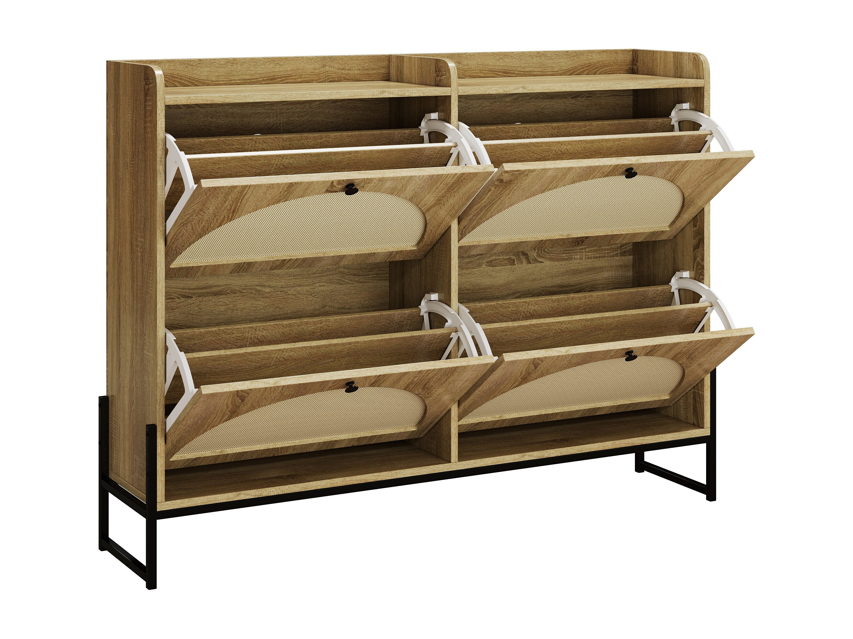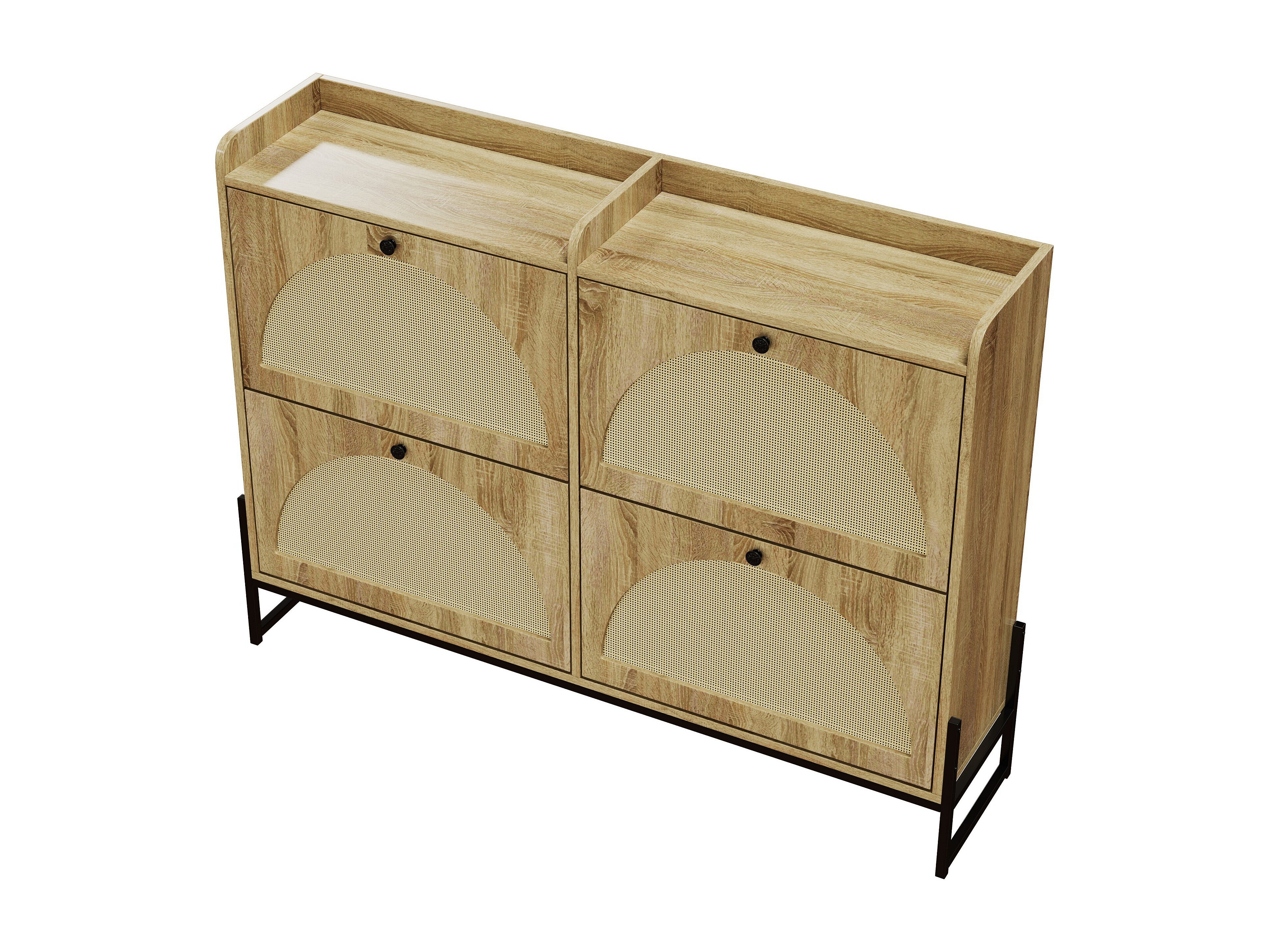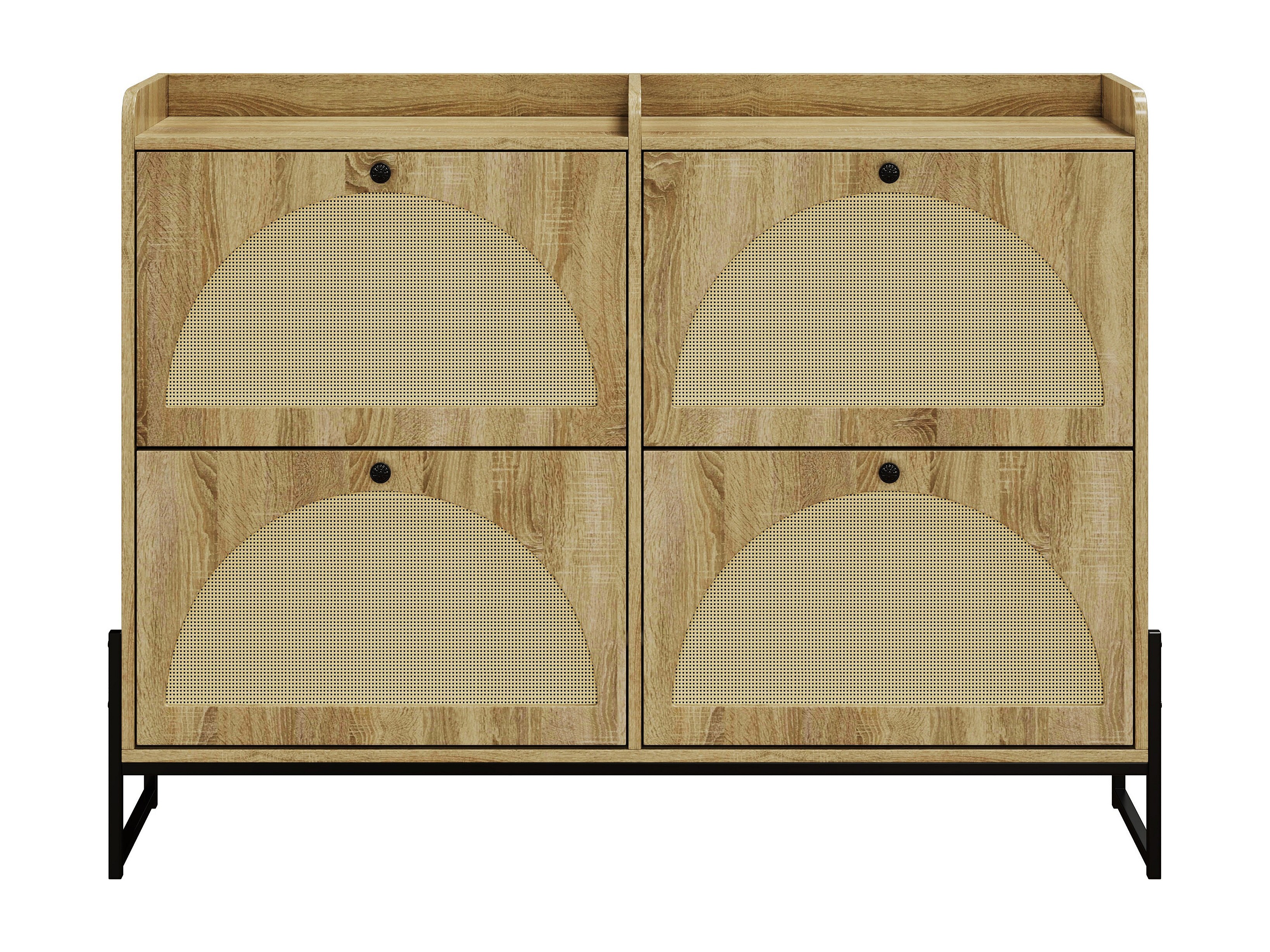 Schoenenkast in natuurlijke kleur met 4 rotan deuren, zwarte handgrepen en metalen poten
