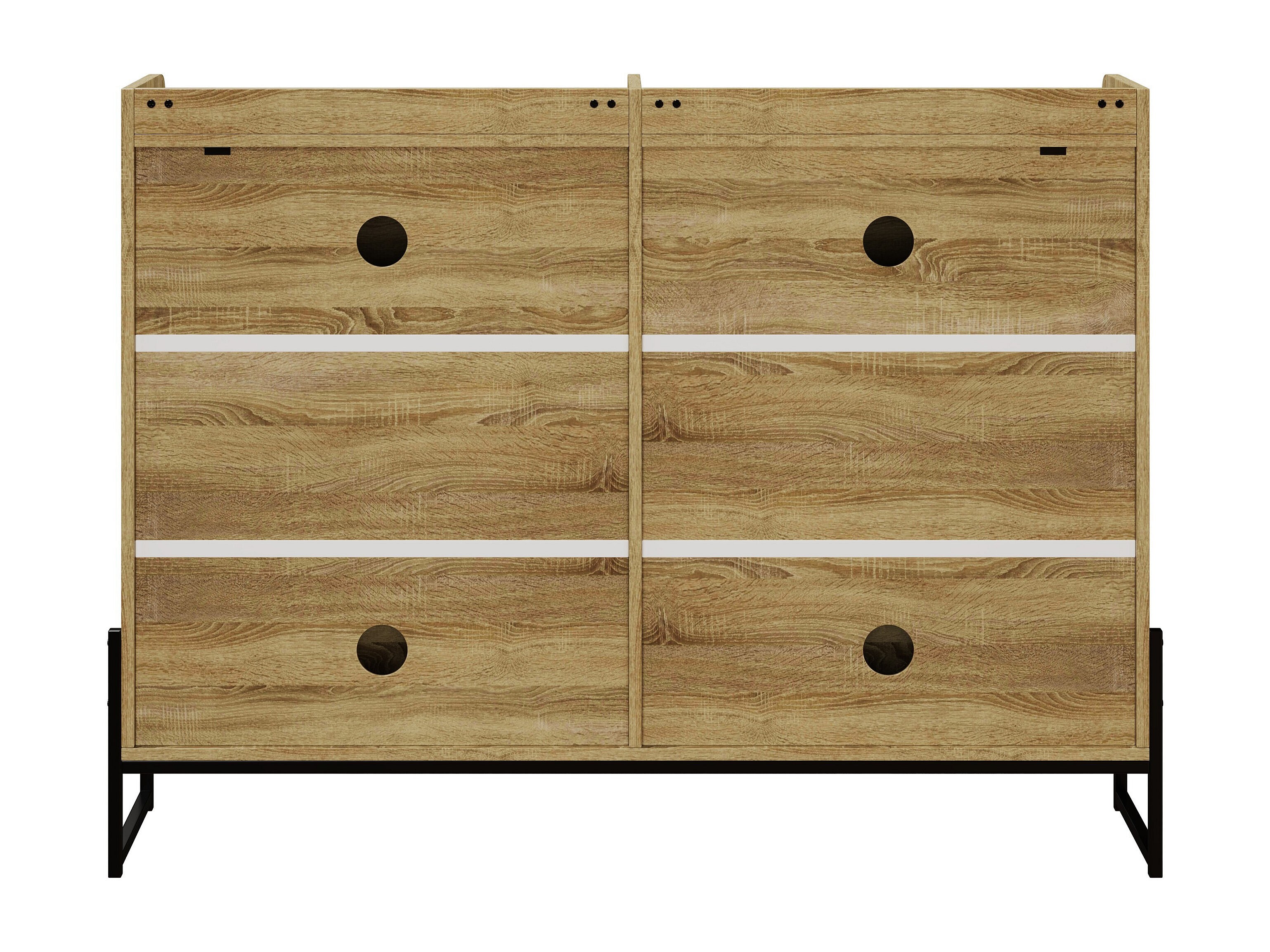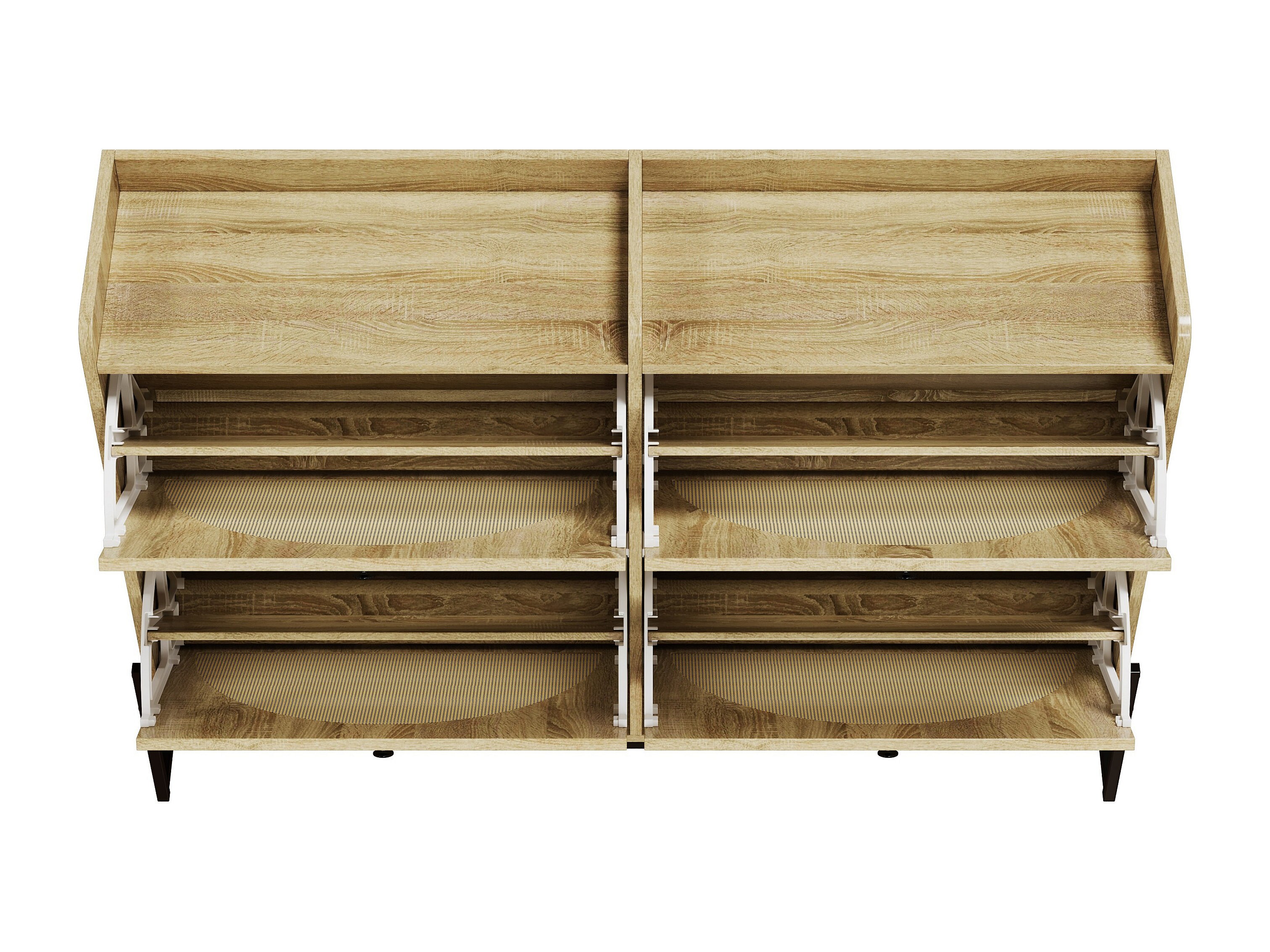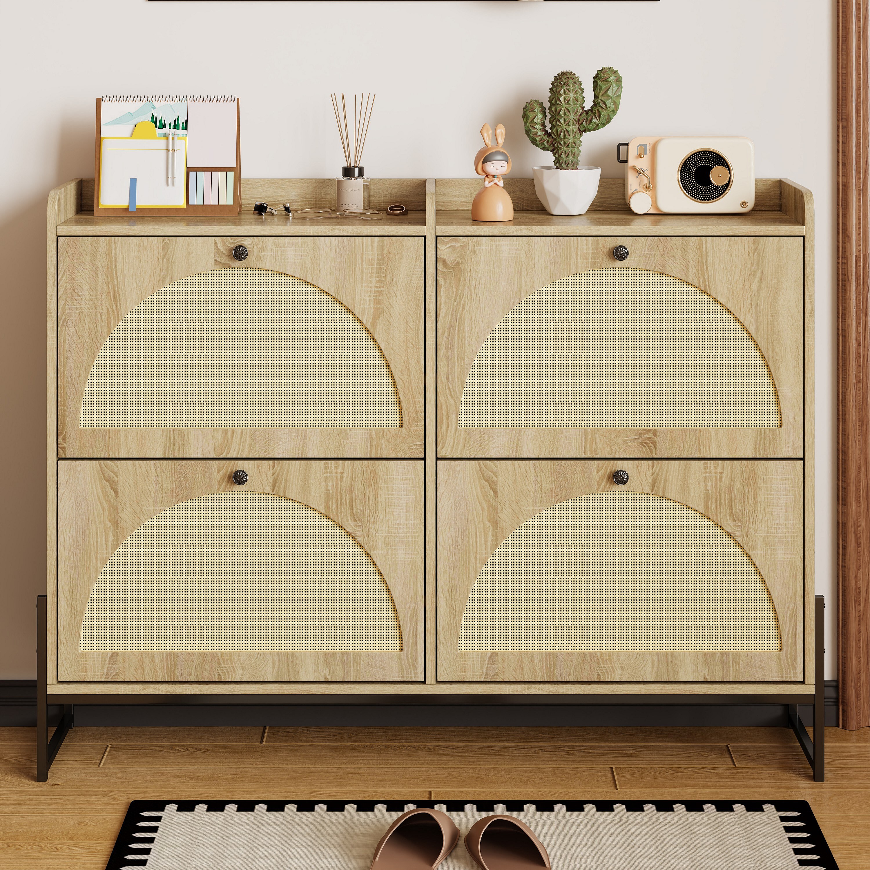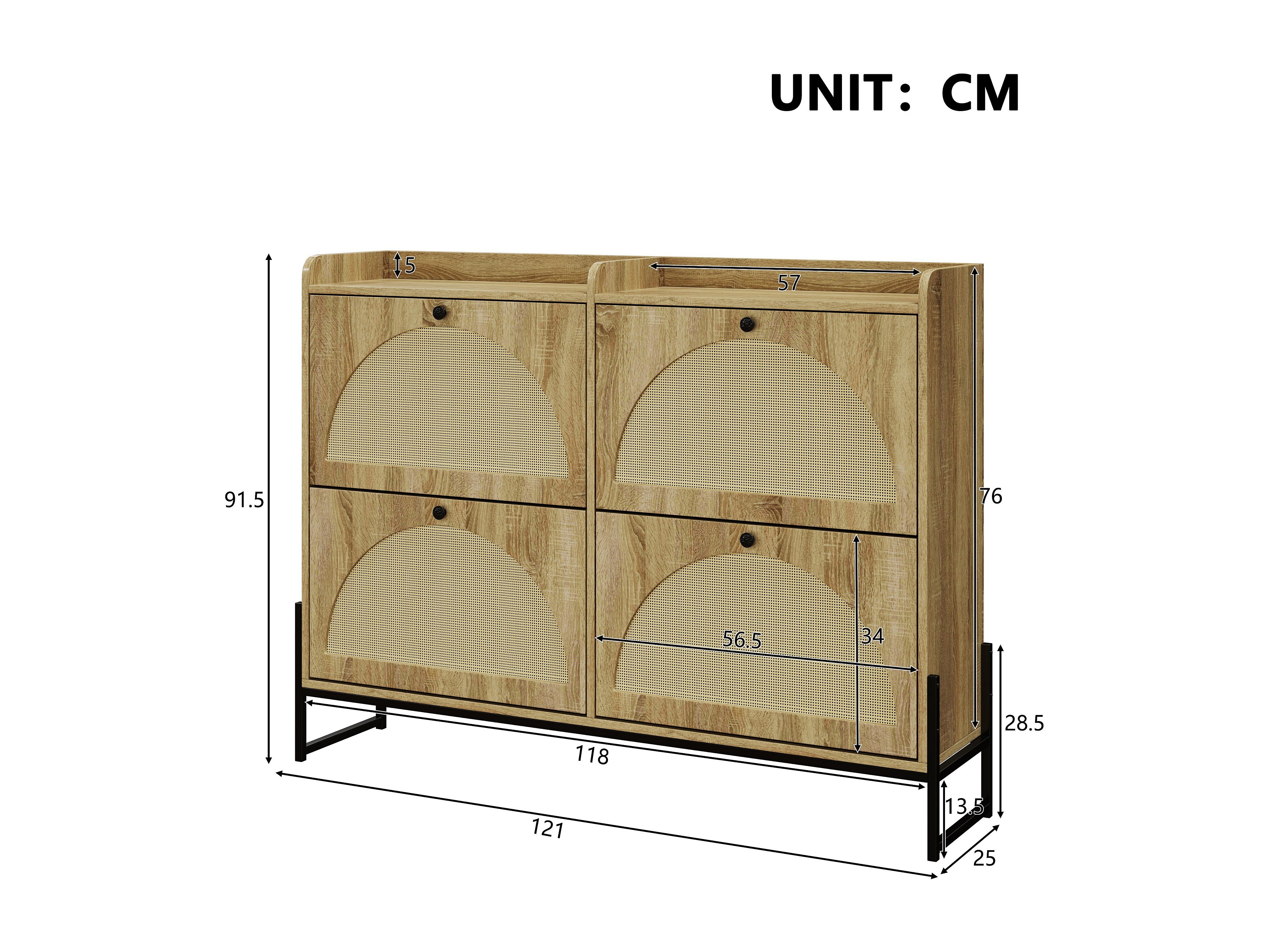 Schoenenkast in natuurlijke kleur met 4 rotan deuren, zwarte handgrepen en metalen poten