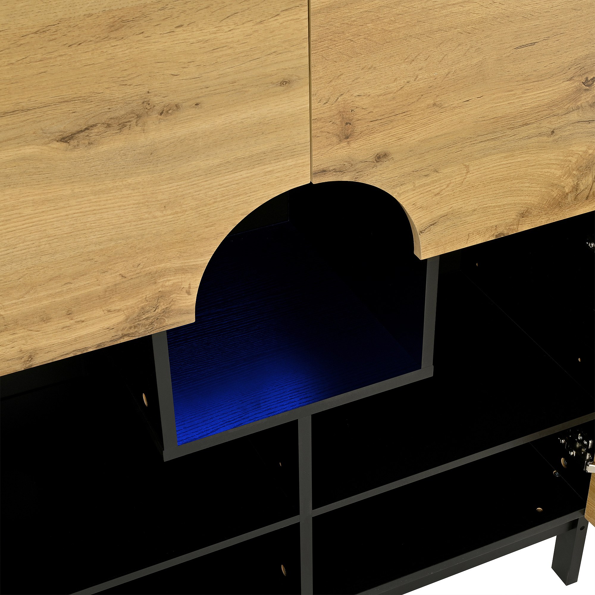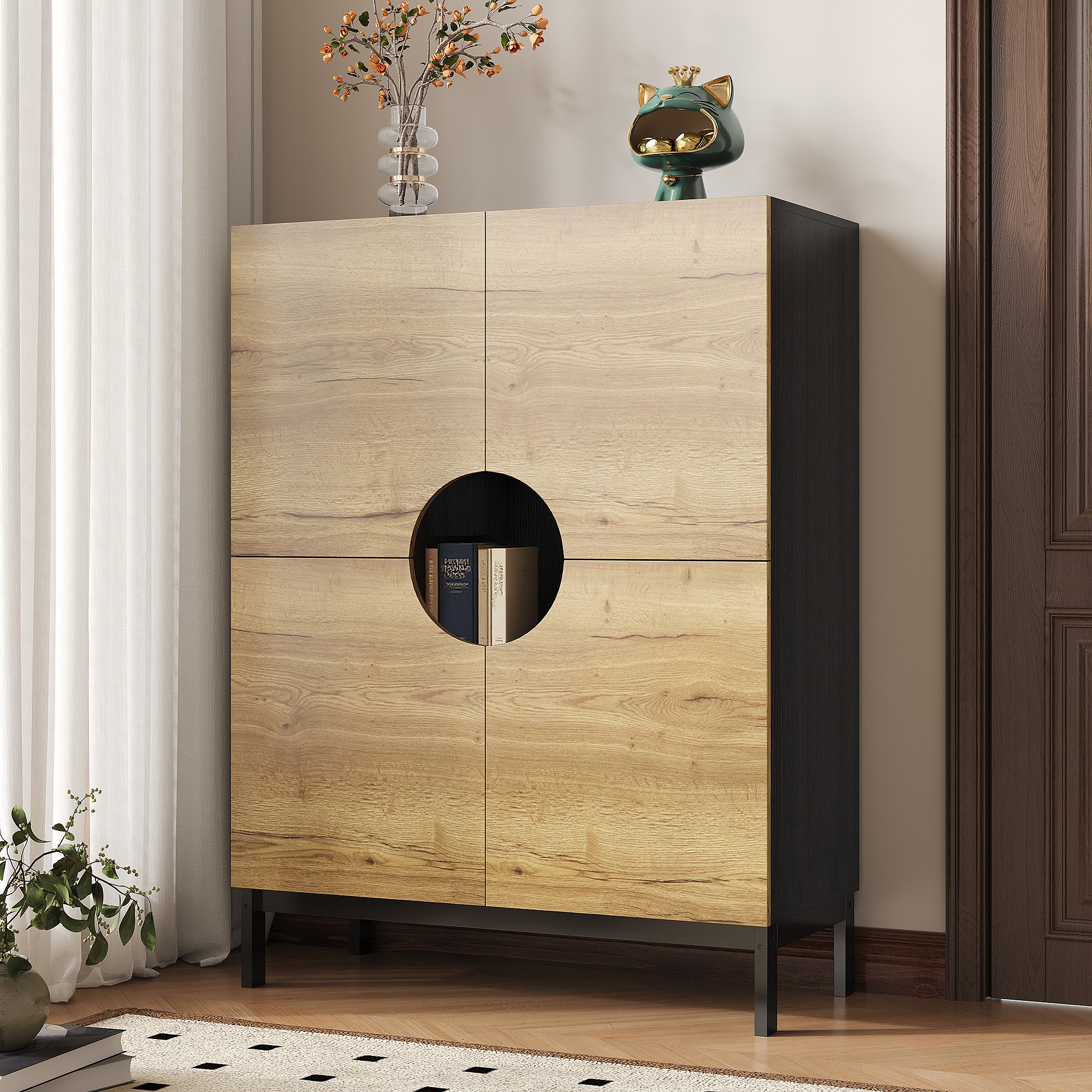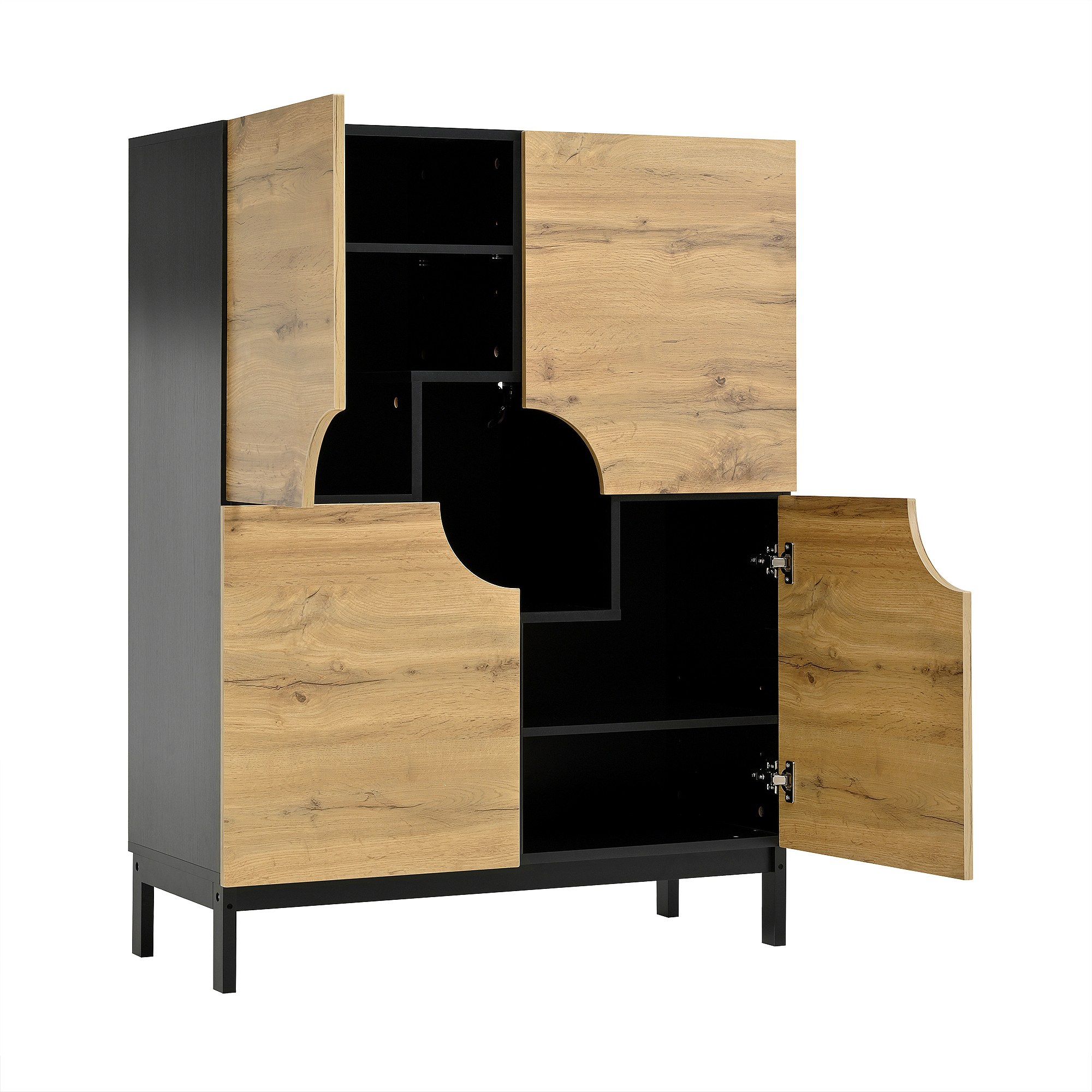 Schoenenkast met LED, 4 deuren in naturel hout en verstelbare planken - zwarte houten poten