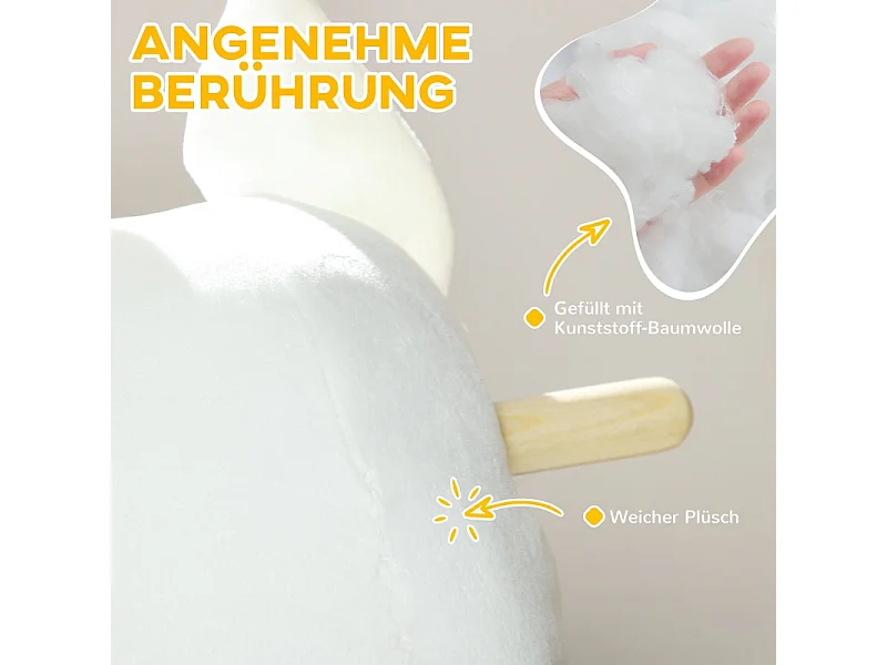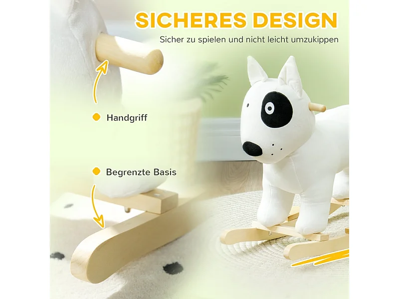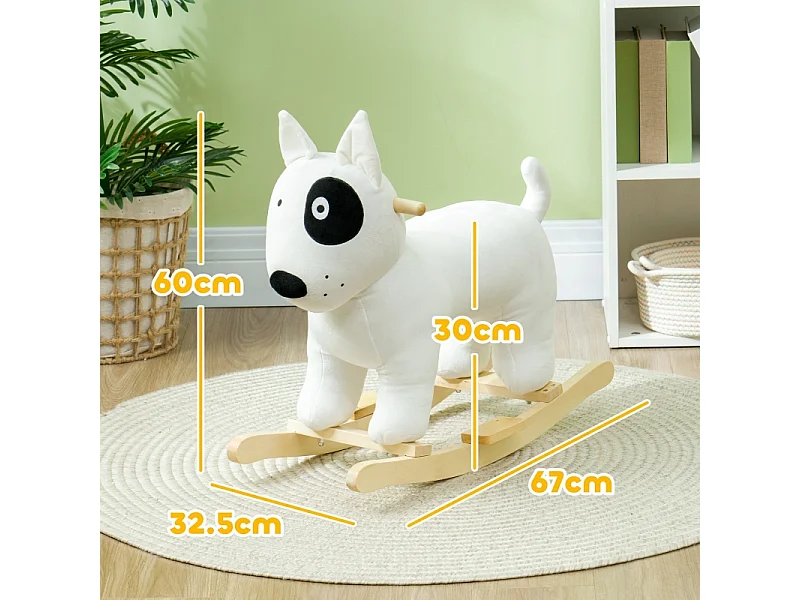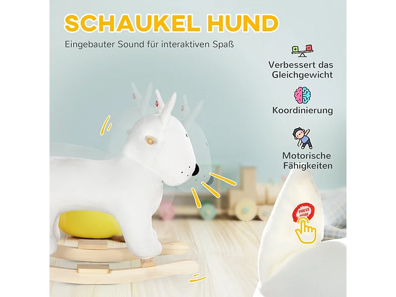 Schommelpaard in de vorm van een hond met geluidsfunctie, gemaakt van hout en metaal, met pluche bekleding, wit (67x32,5x60cm)