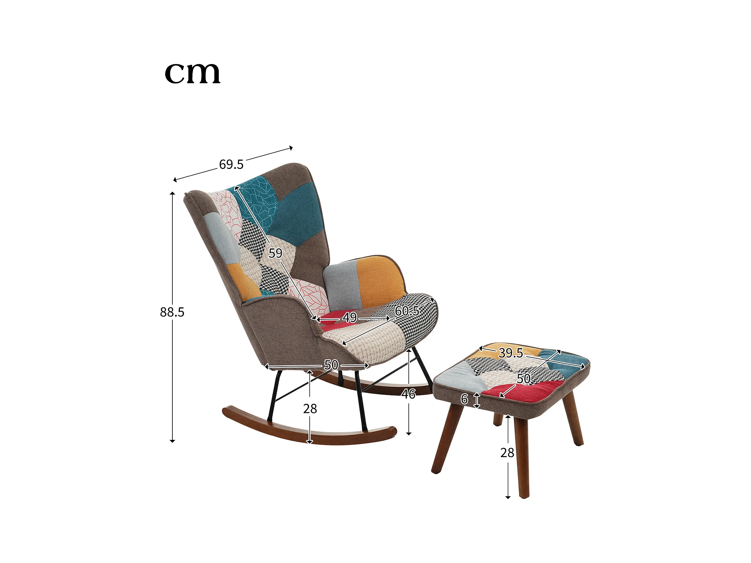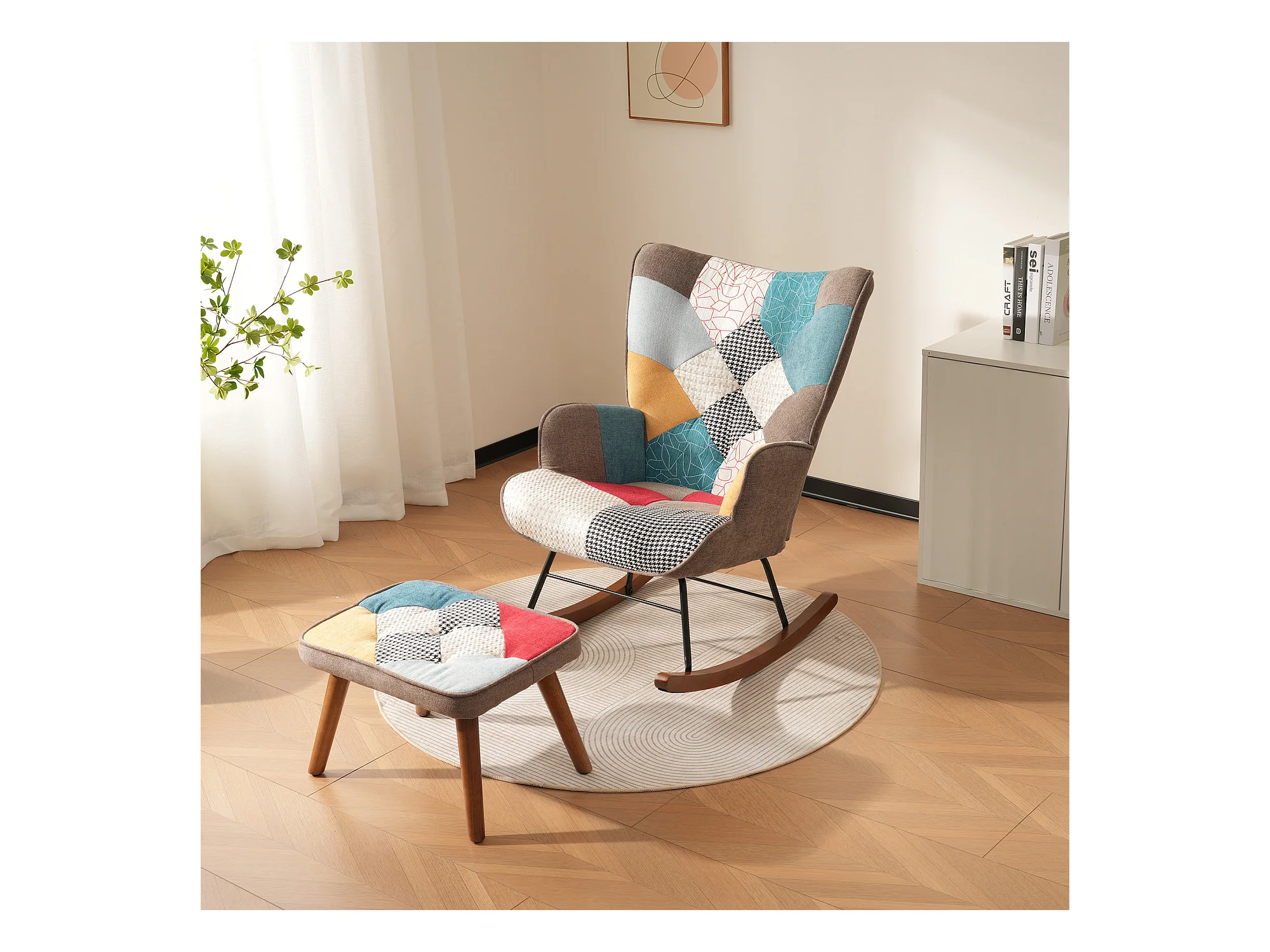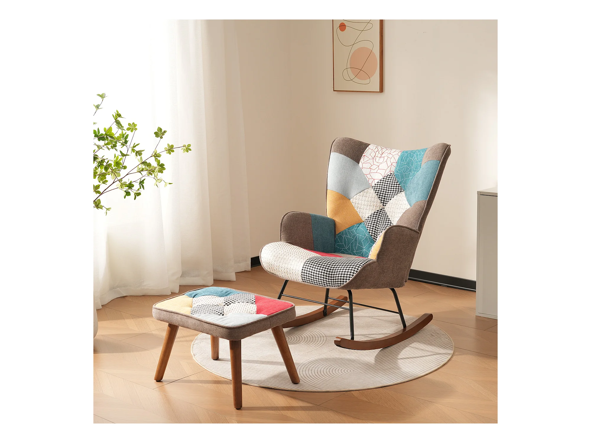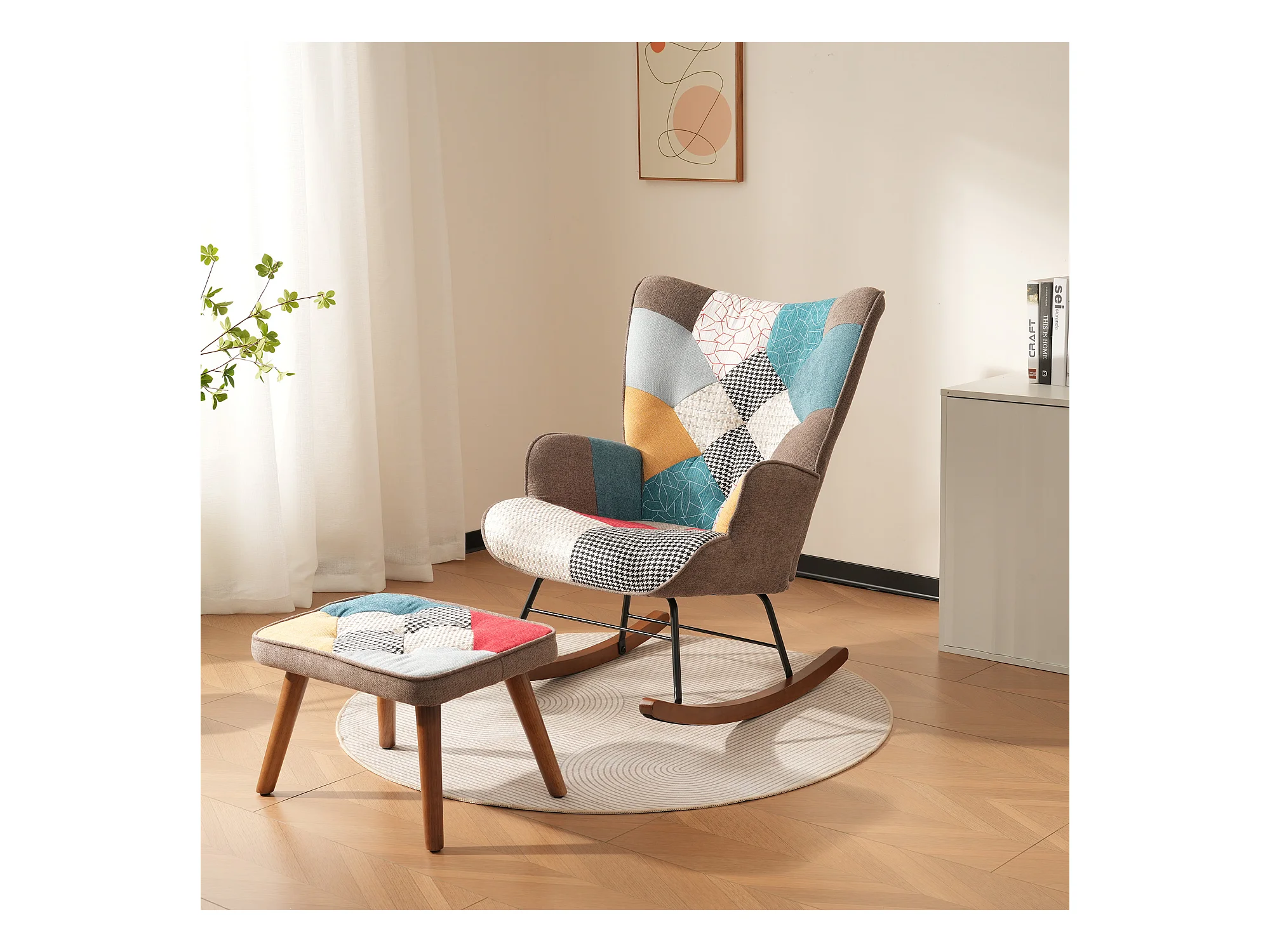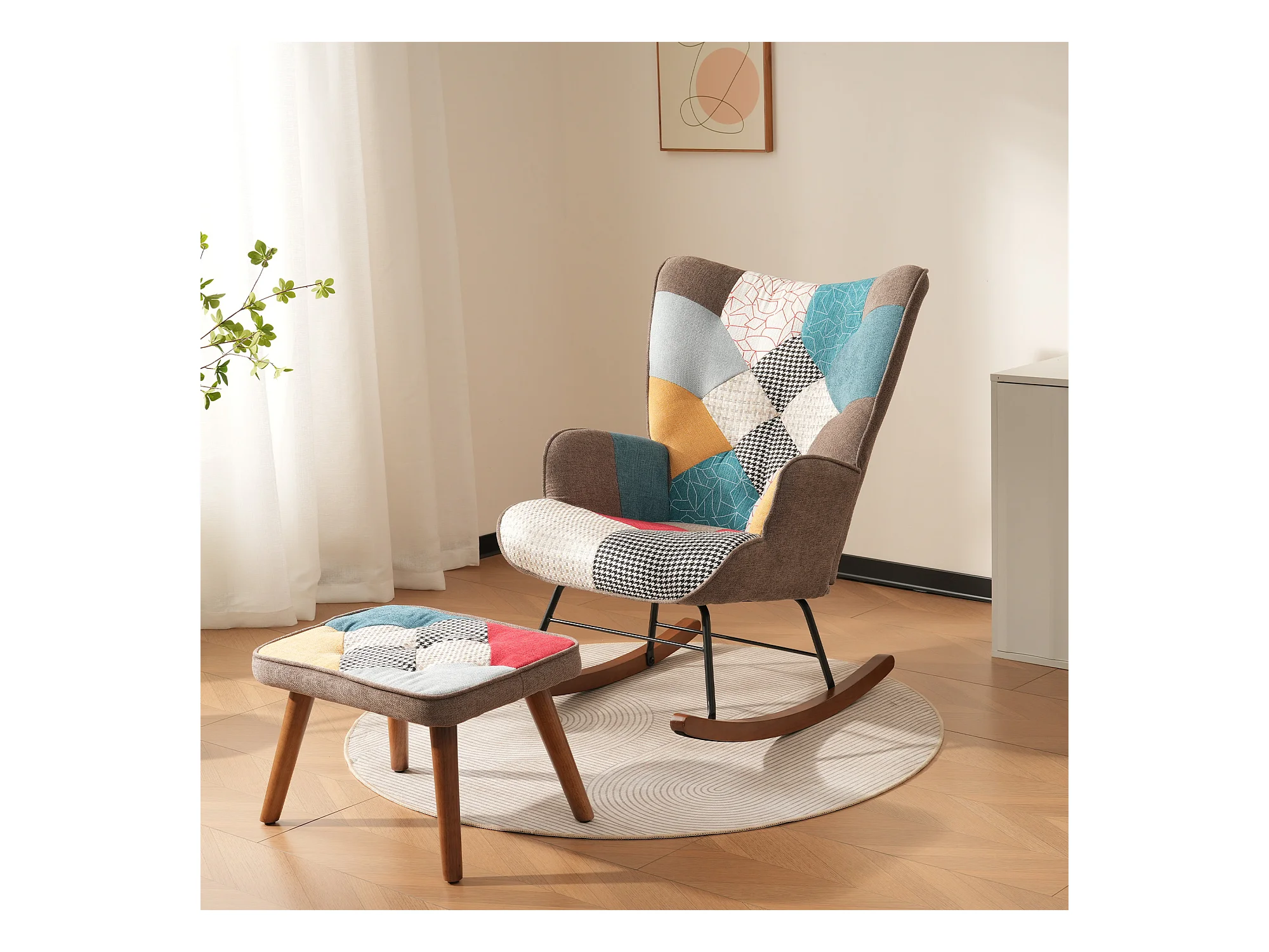 Schommelstoel met voetenbankje, kleurrijk patchworkdesign, frame van massief hout en metaal (69,5x50x88,5 cm)