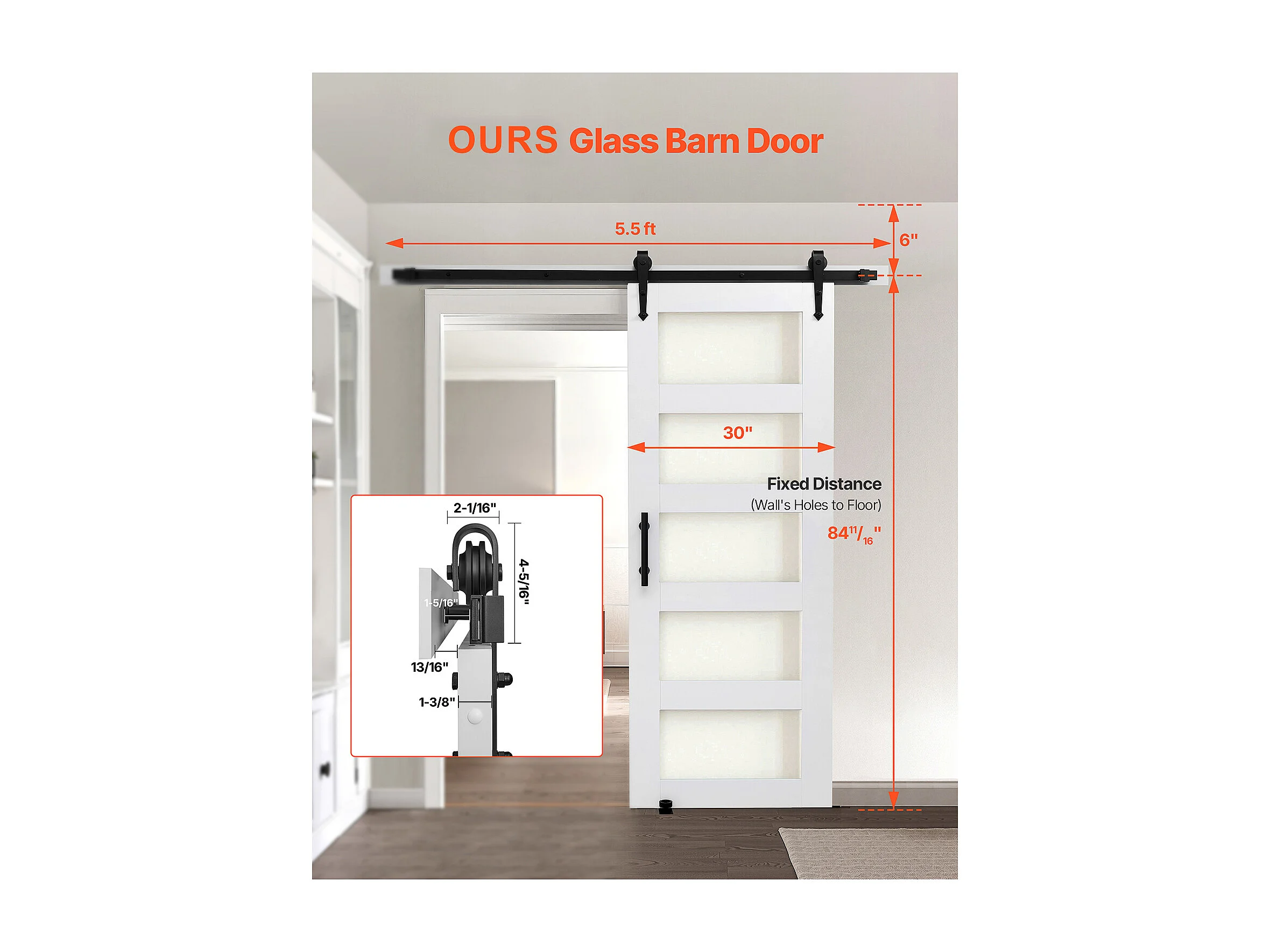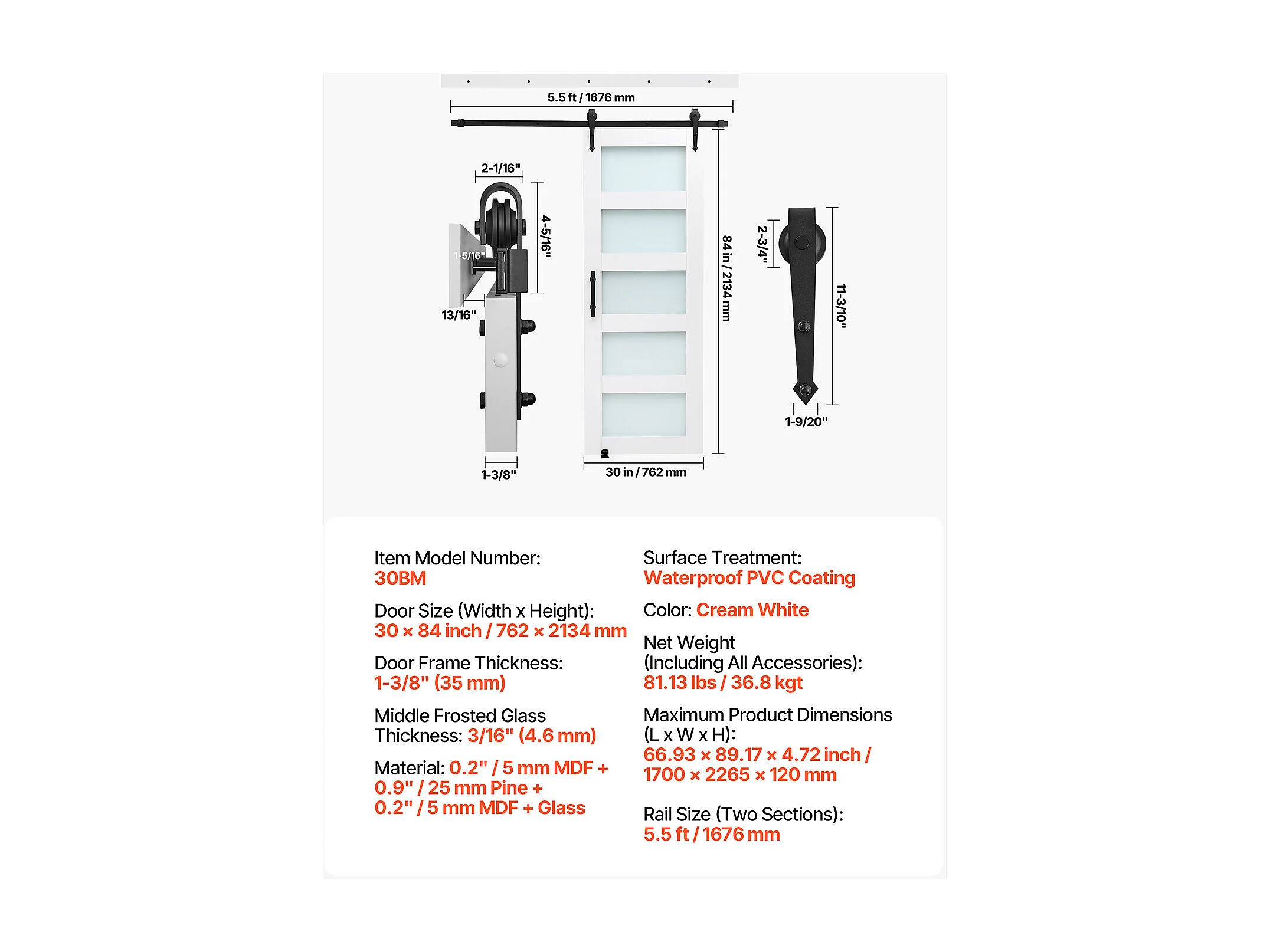 Schuurdeur Schuifdeur SucceBuy, 76.2 x 213.4 cm, van MDF Plaat, Schuifdeur Set met Beslag Set, Oppervlak van Waterdicht PVC