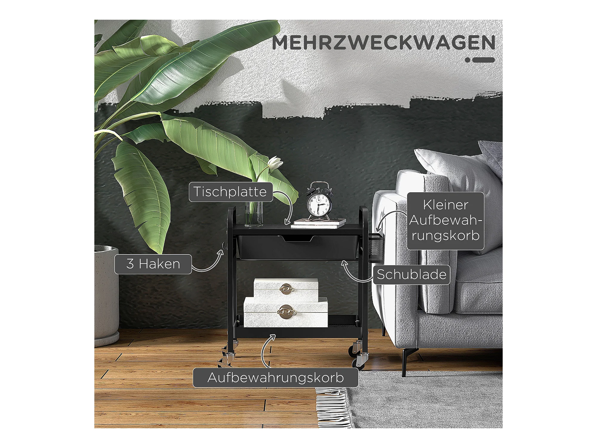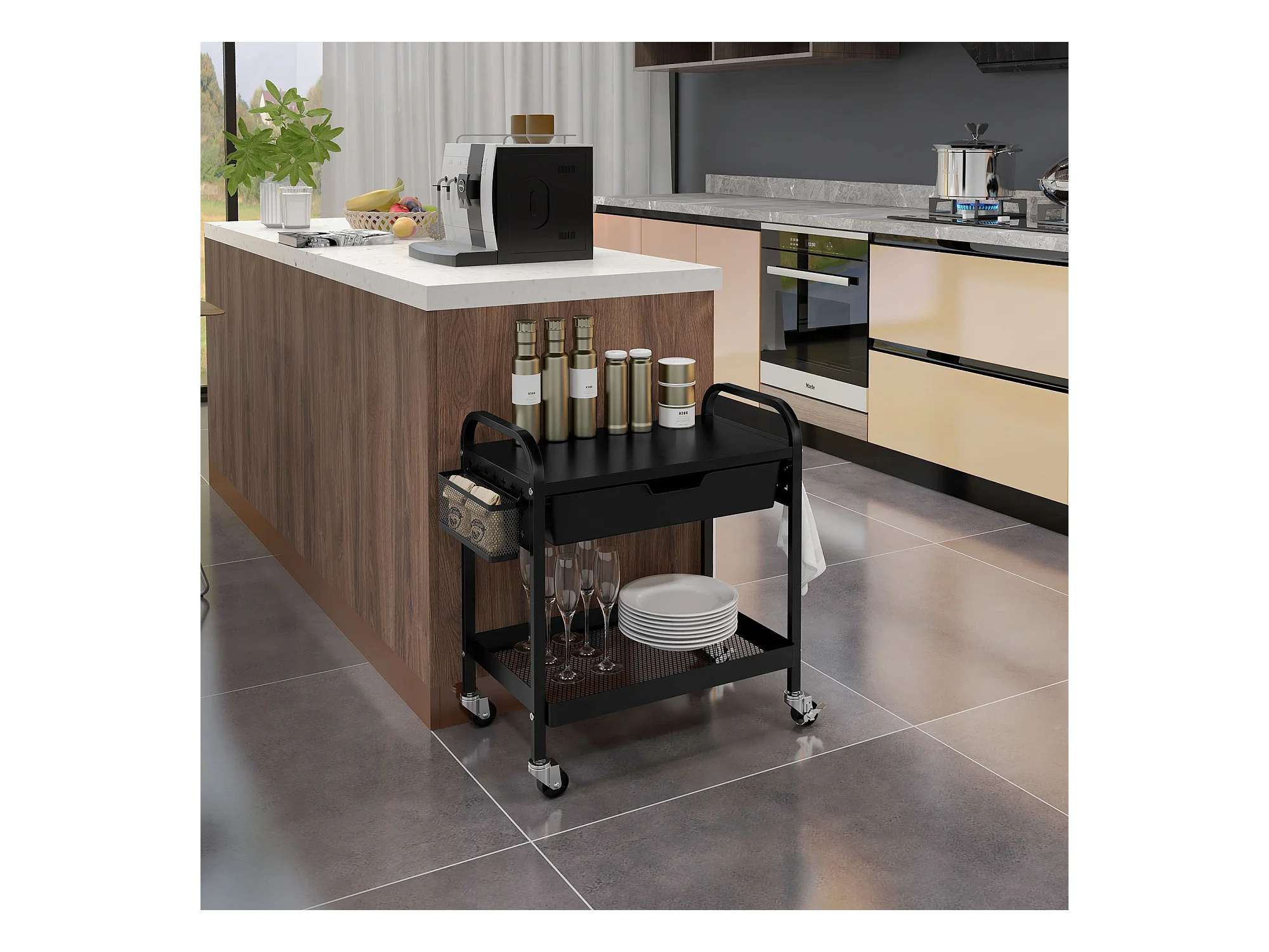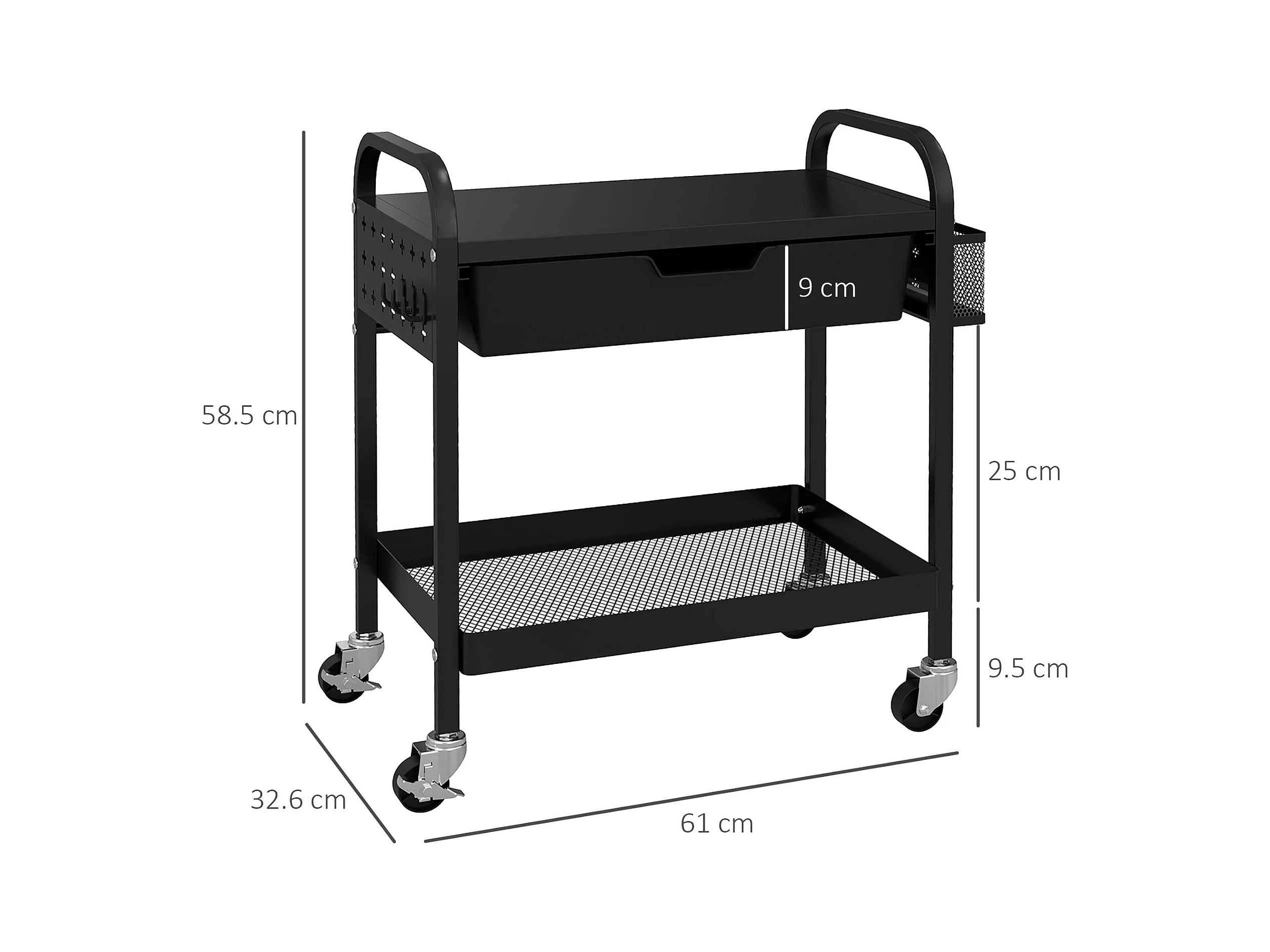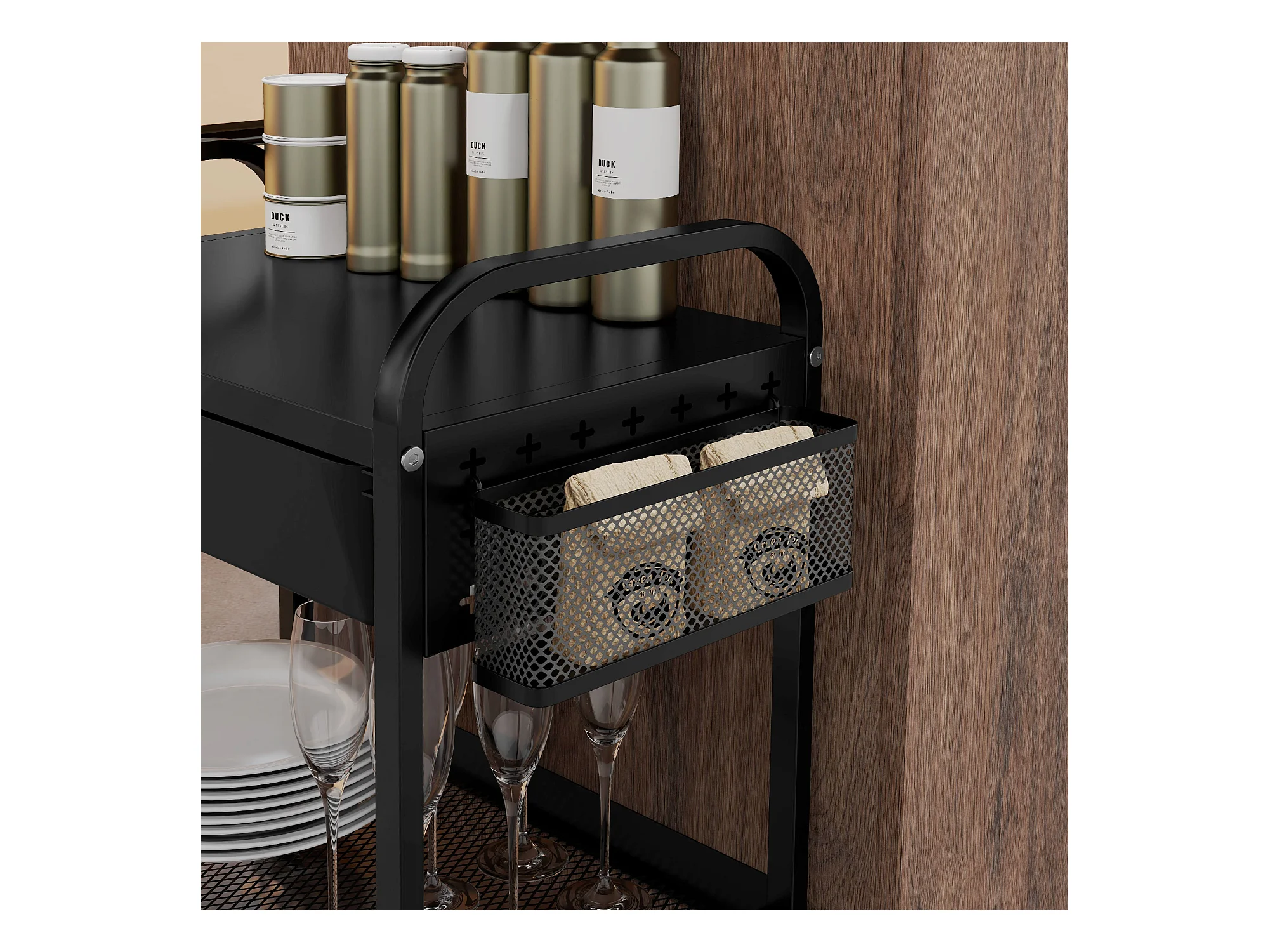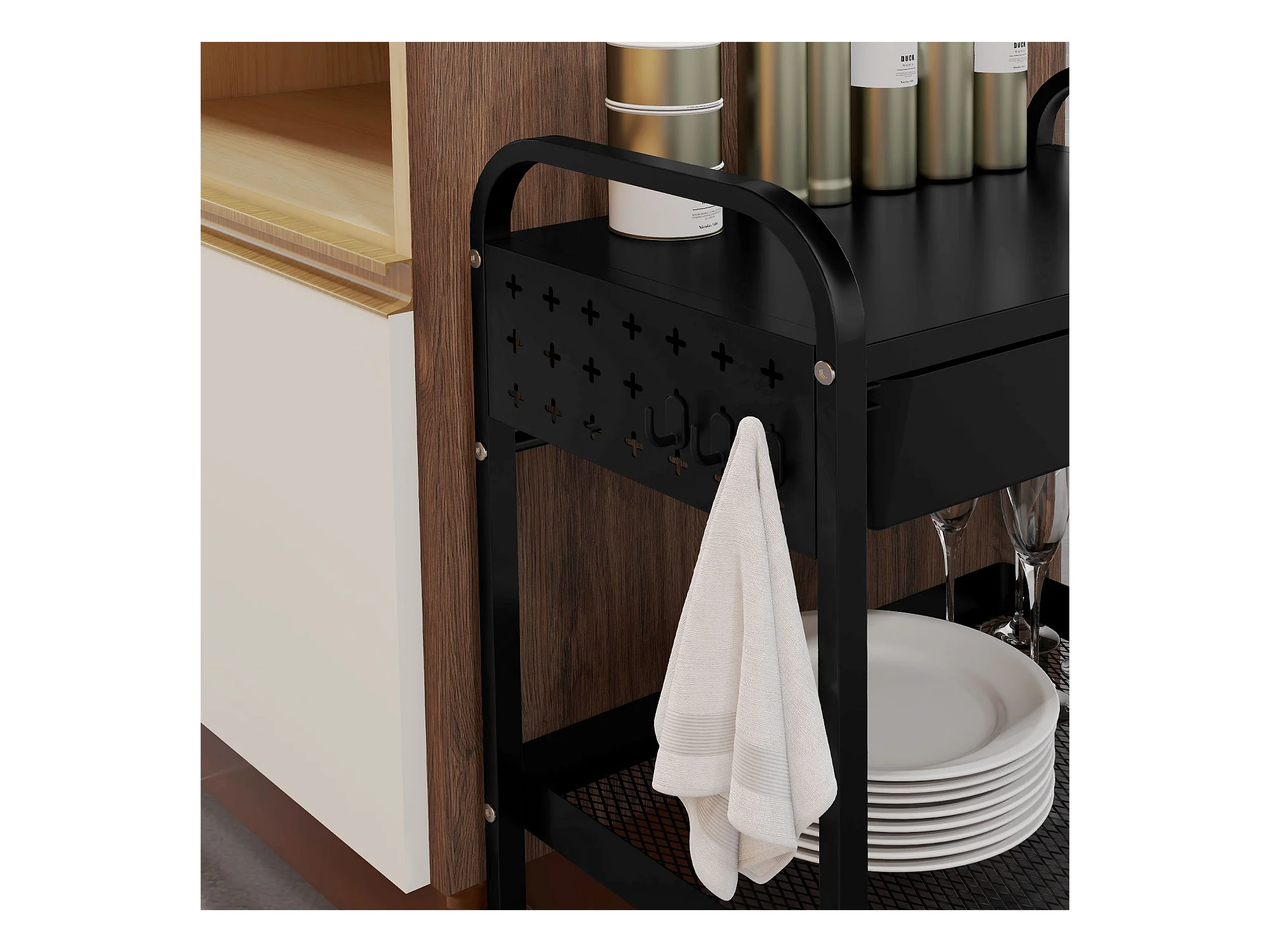 Serveerwagen met 1 lade, 1 plank, handdoekrek en wielen, in zwart metaal (61x32,6x58,5 cm)