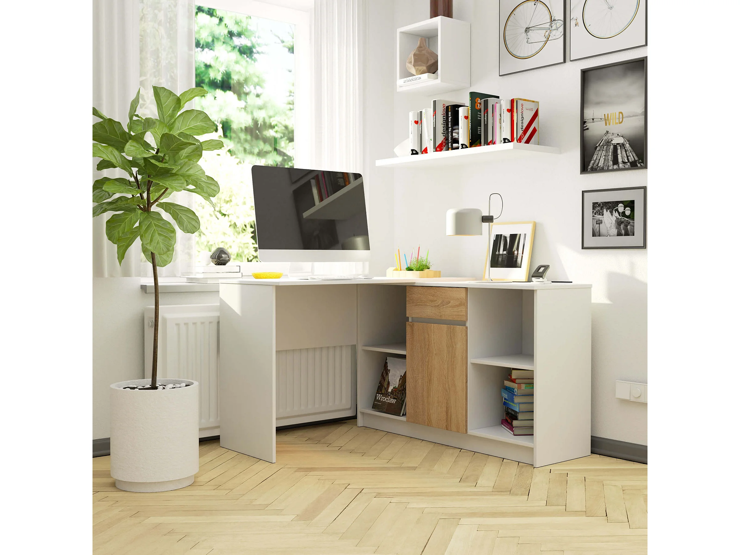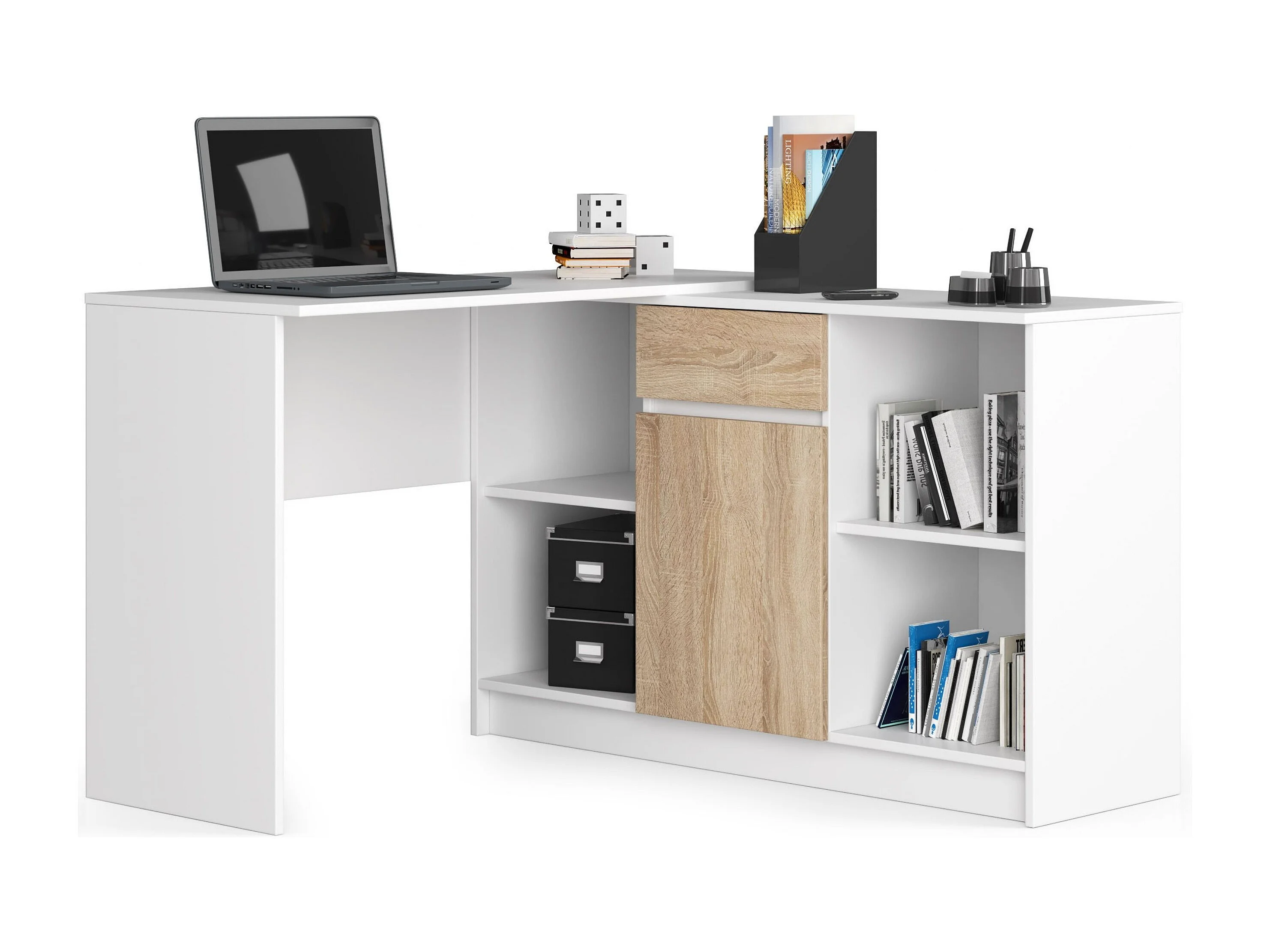 Set B-17 Wit & Eiken Sonoma: Hoekbureau & Kast - Zelfmontage