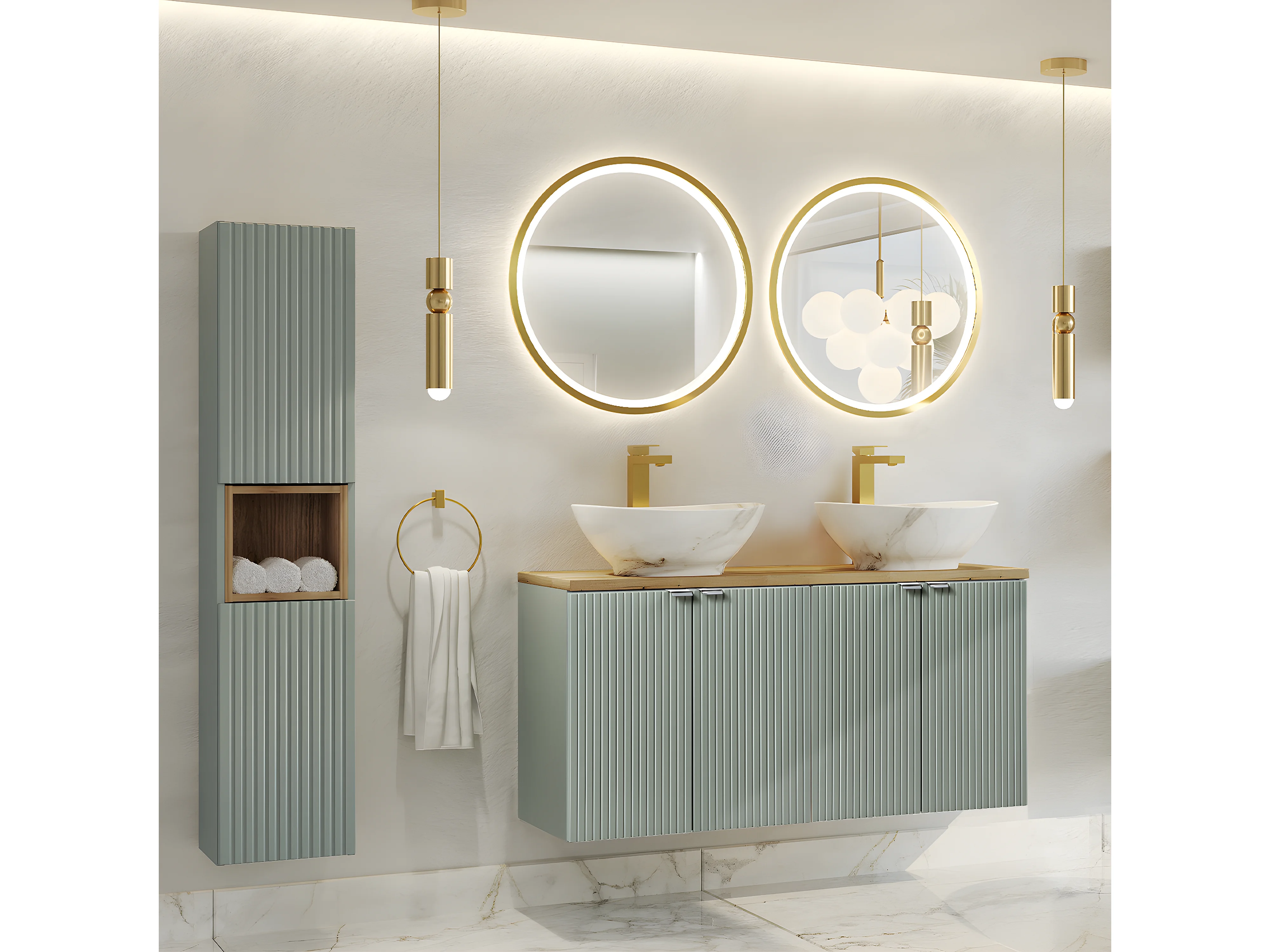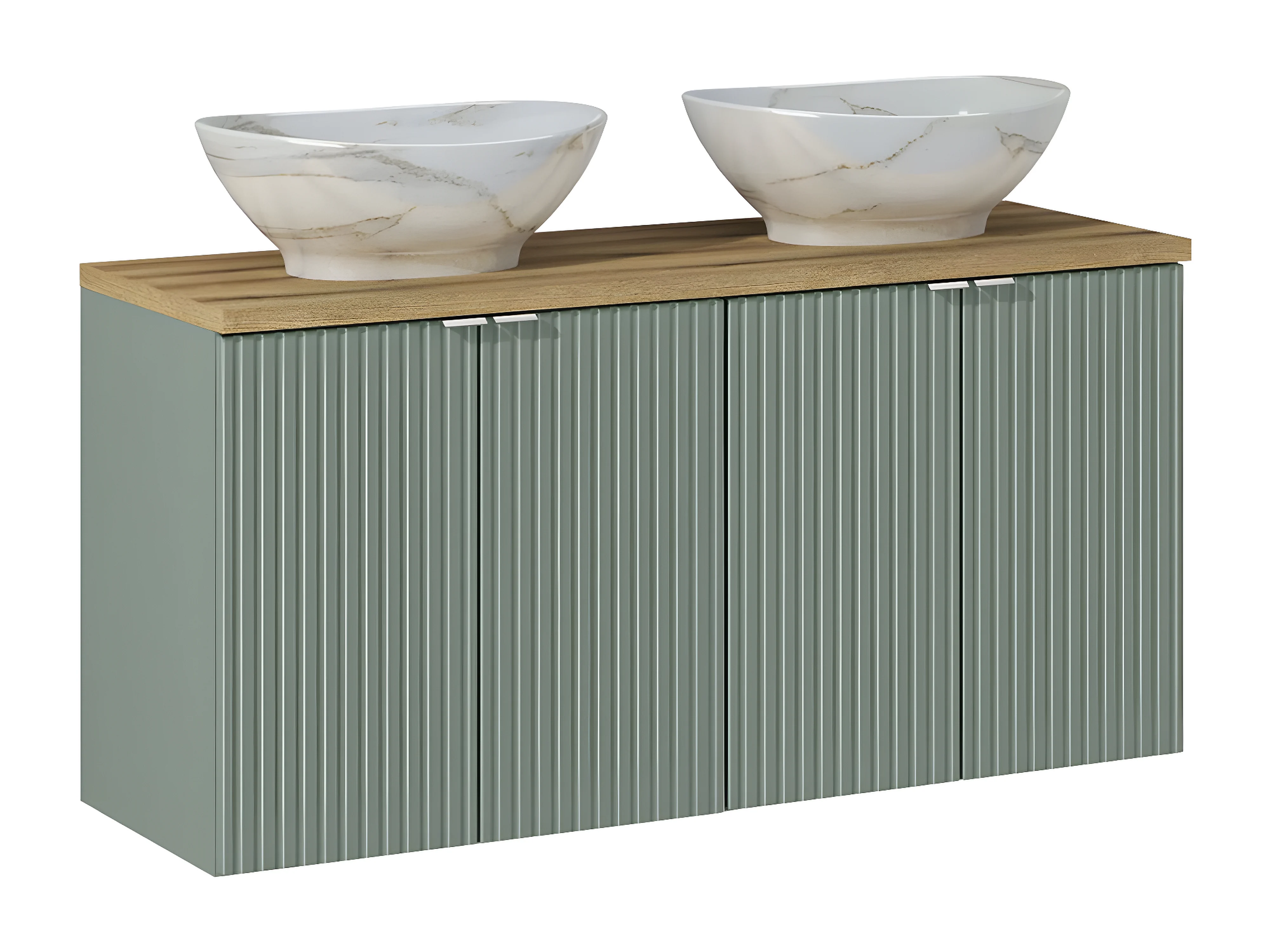 Set van 120cm dubbele wastafel met 4 deuren en groene en houten Jade sokkel