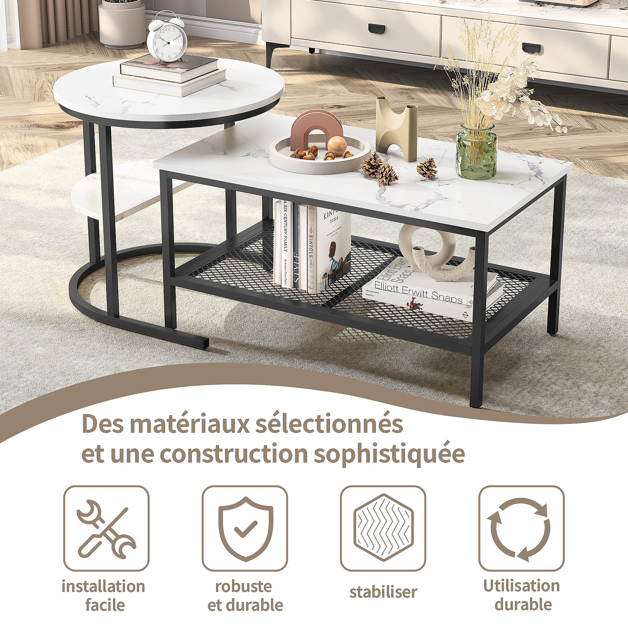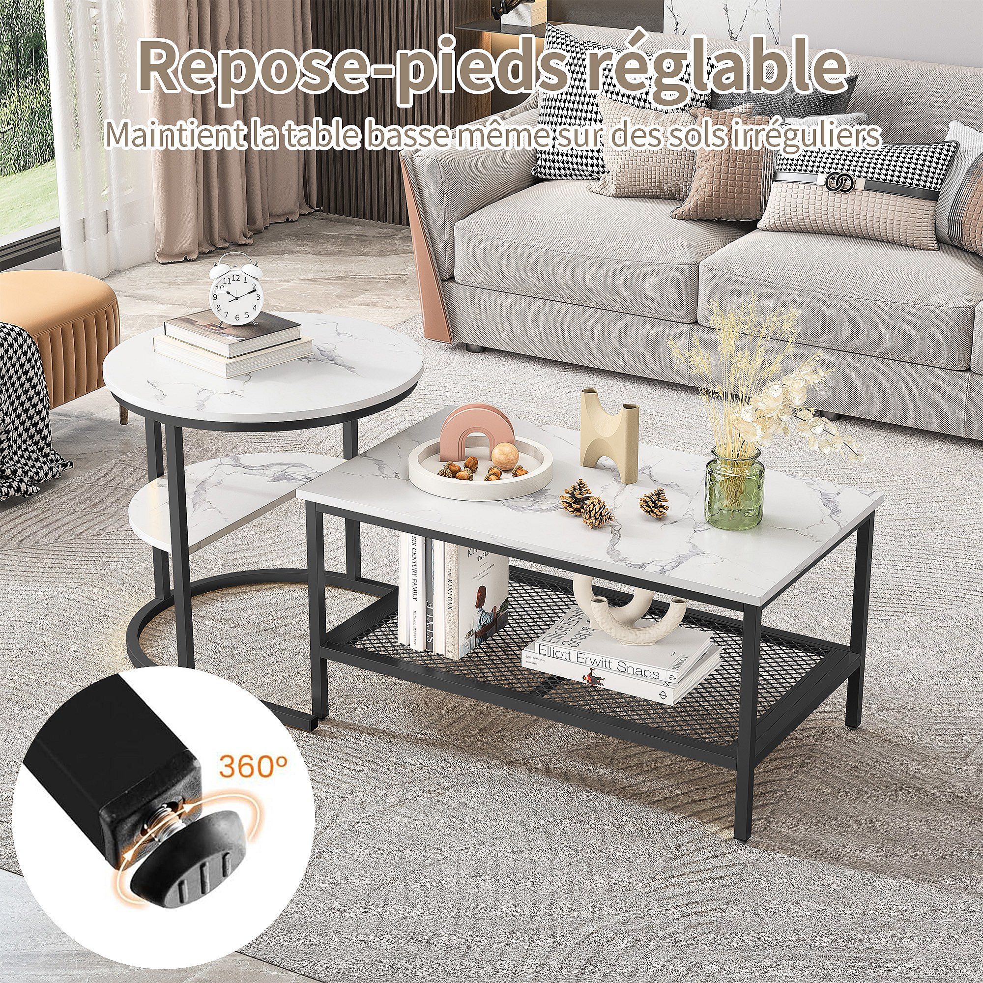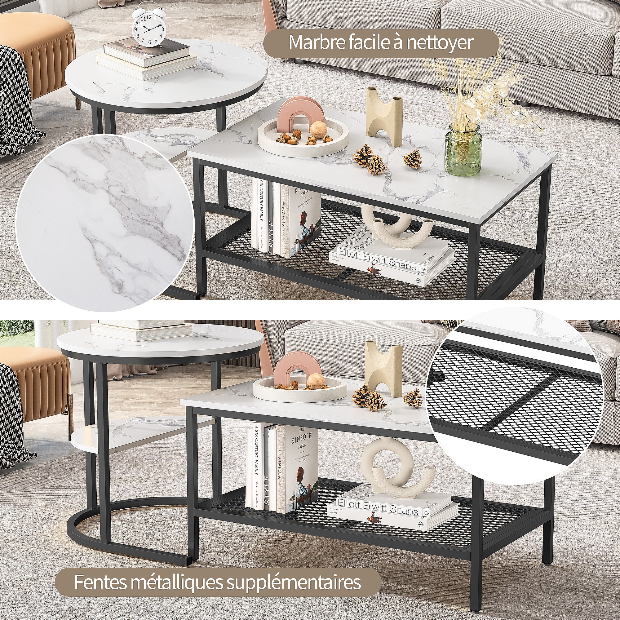 Set van 2 bijzettafels met marmerdesign, bijzettafel met zwart metalen frame