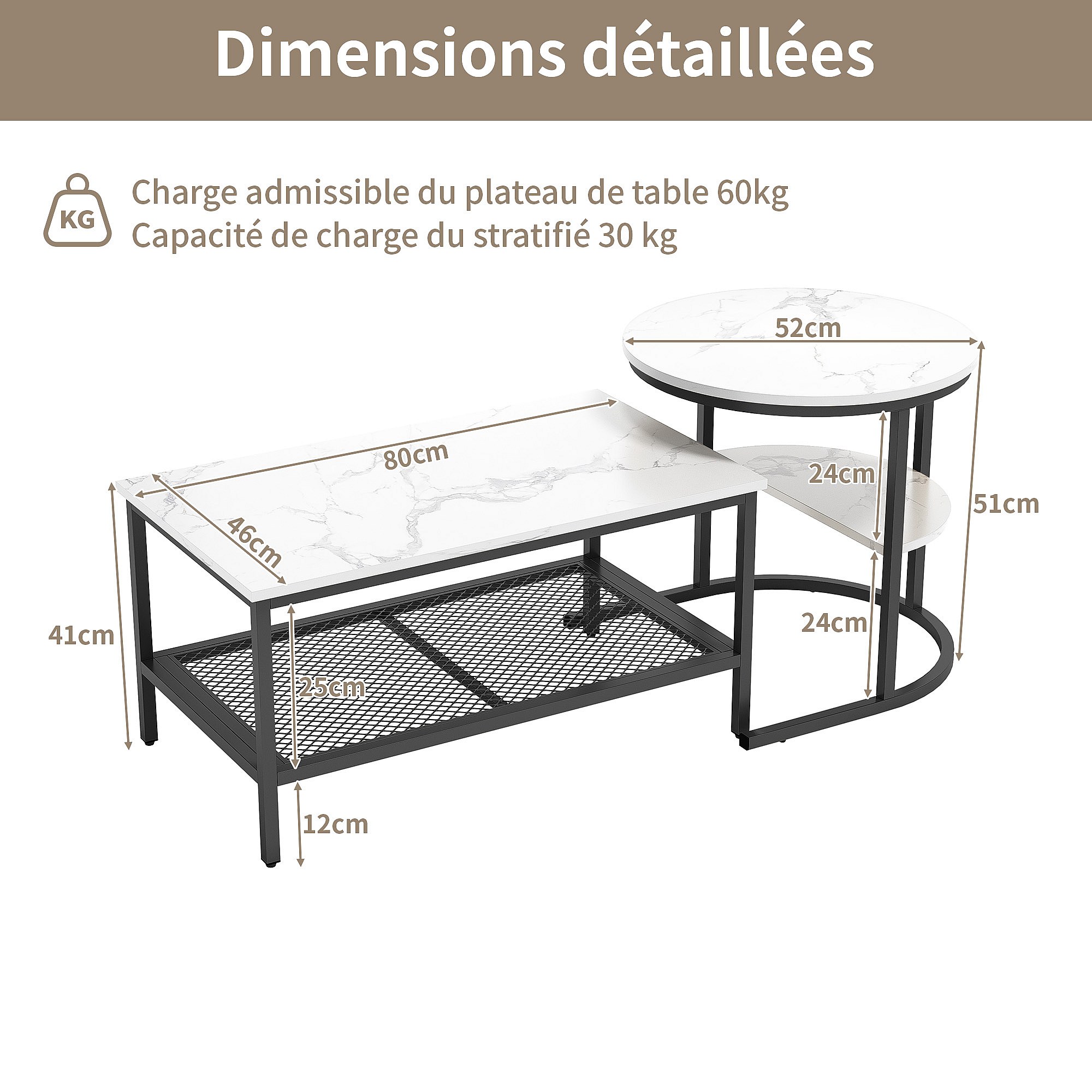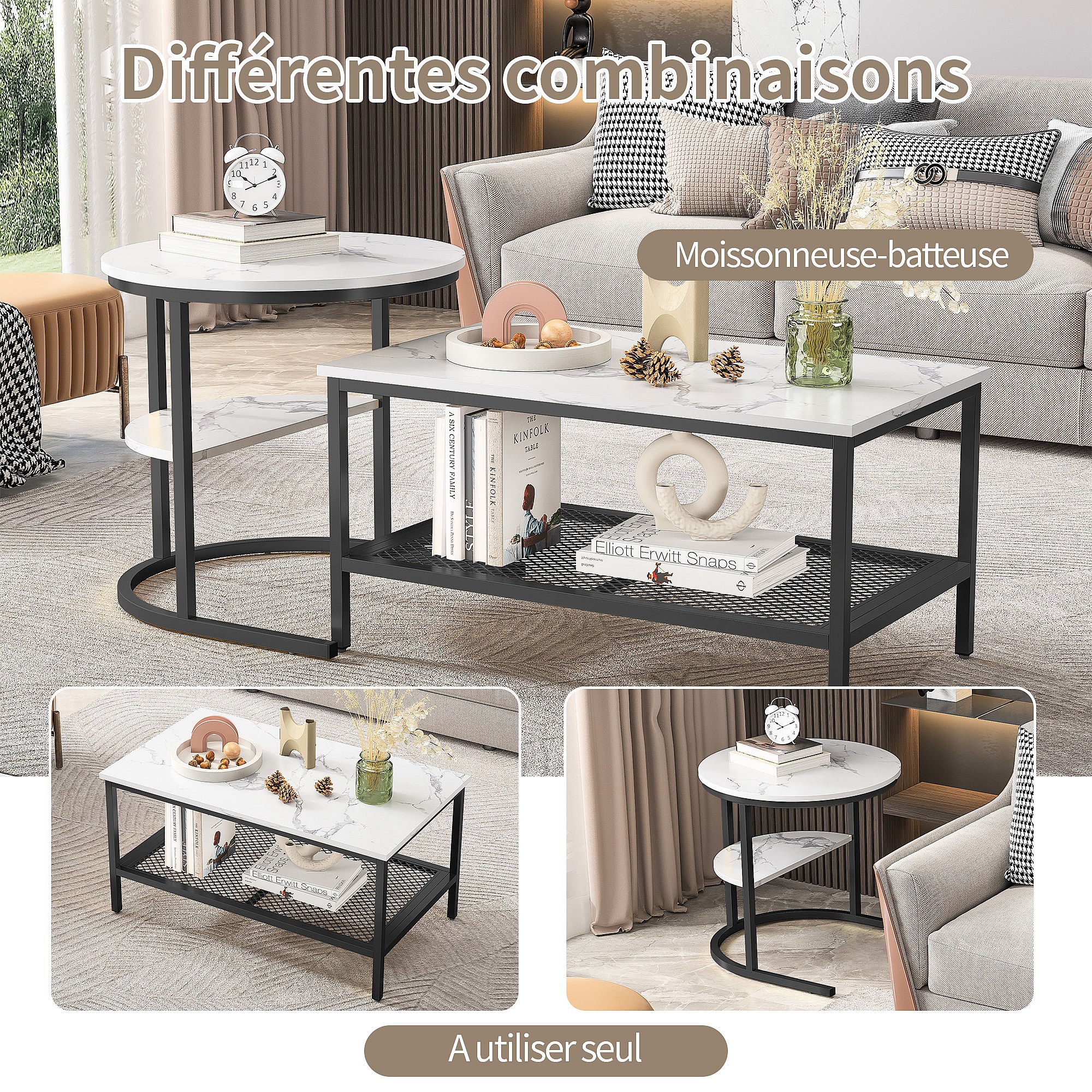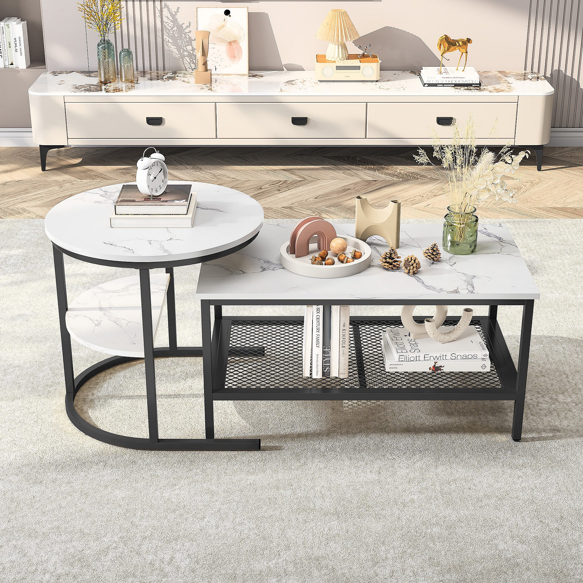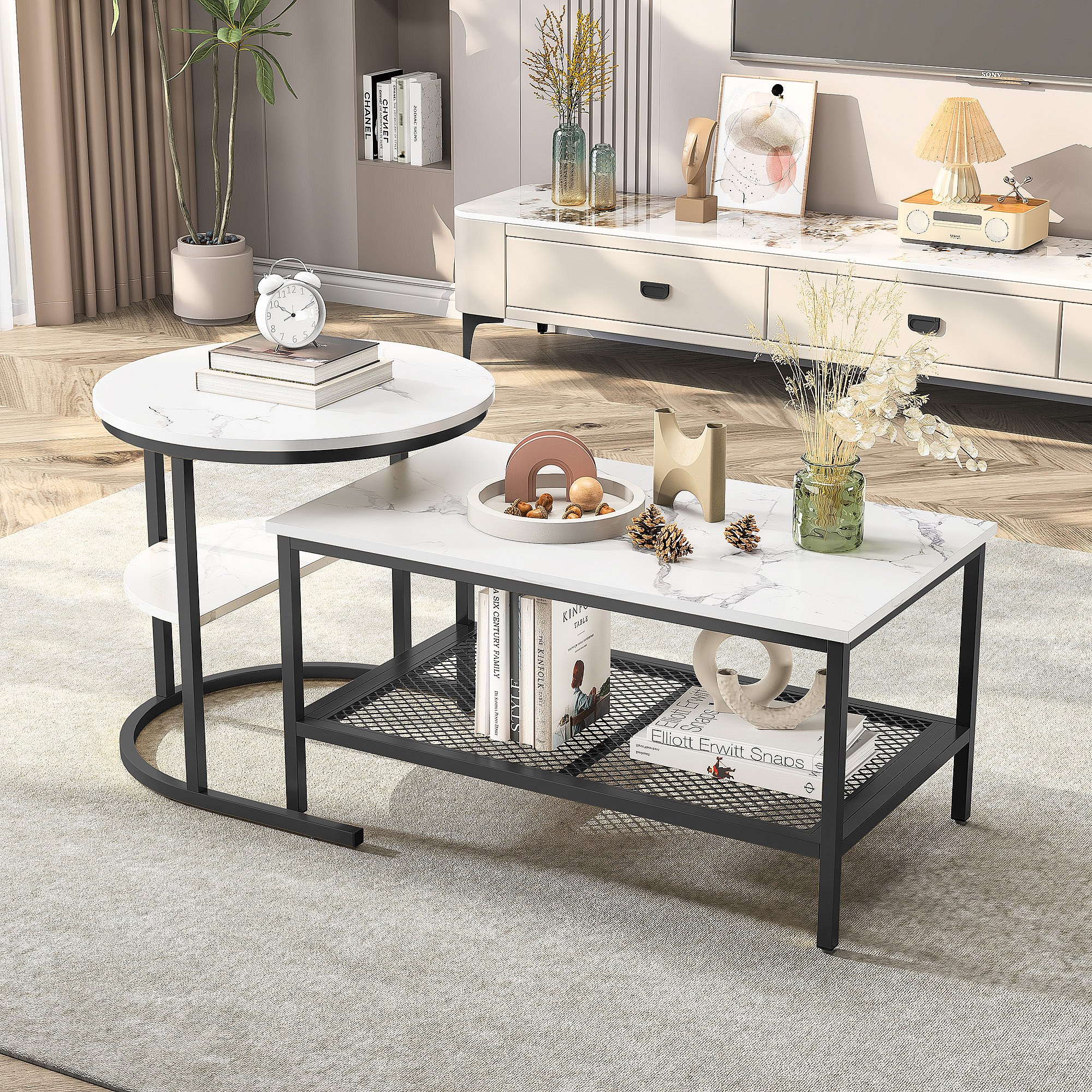 Set van 2 bijzettafels met marmerdesign, bijzettafel met zwart metalen frame