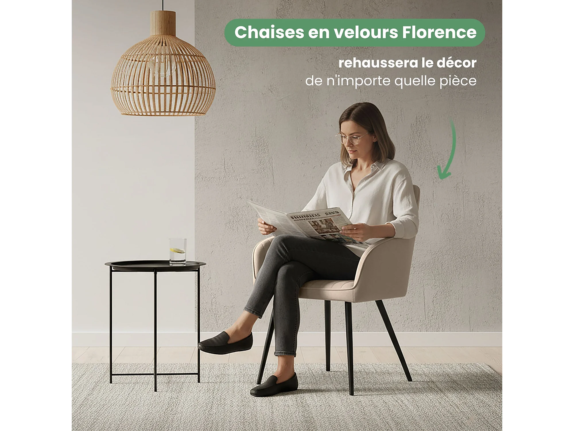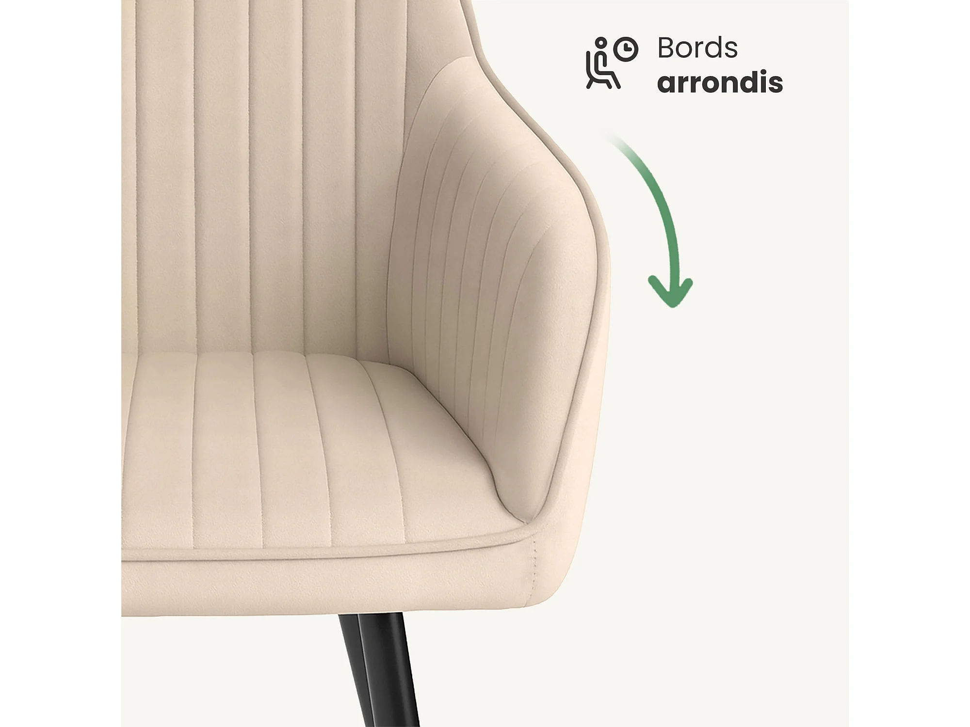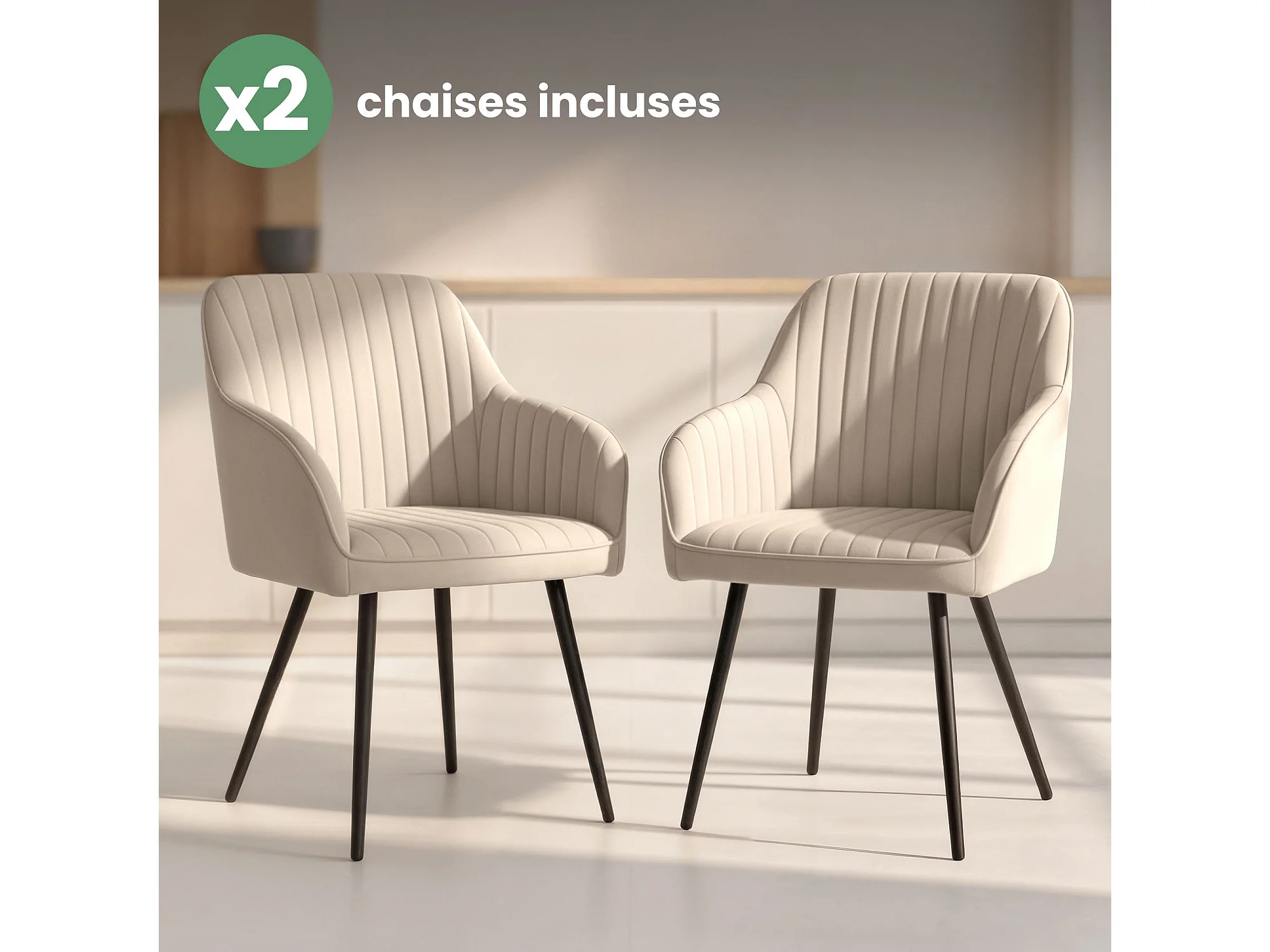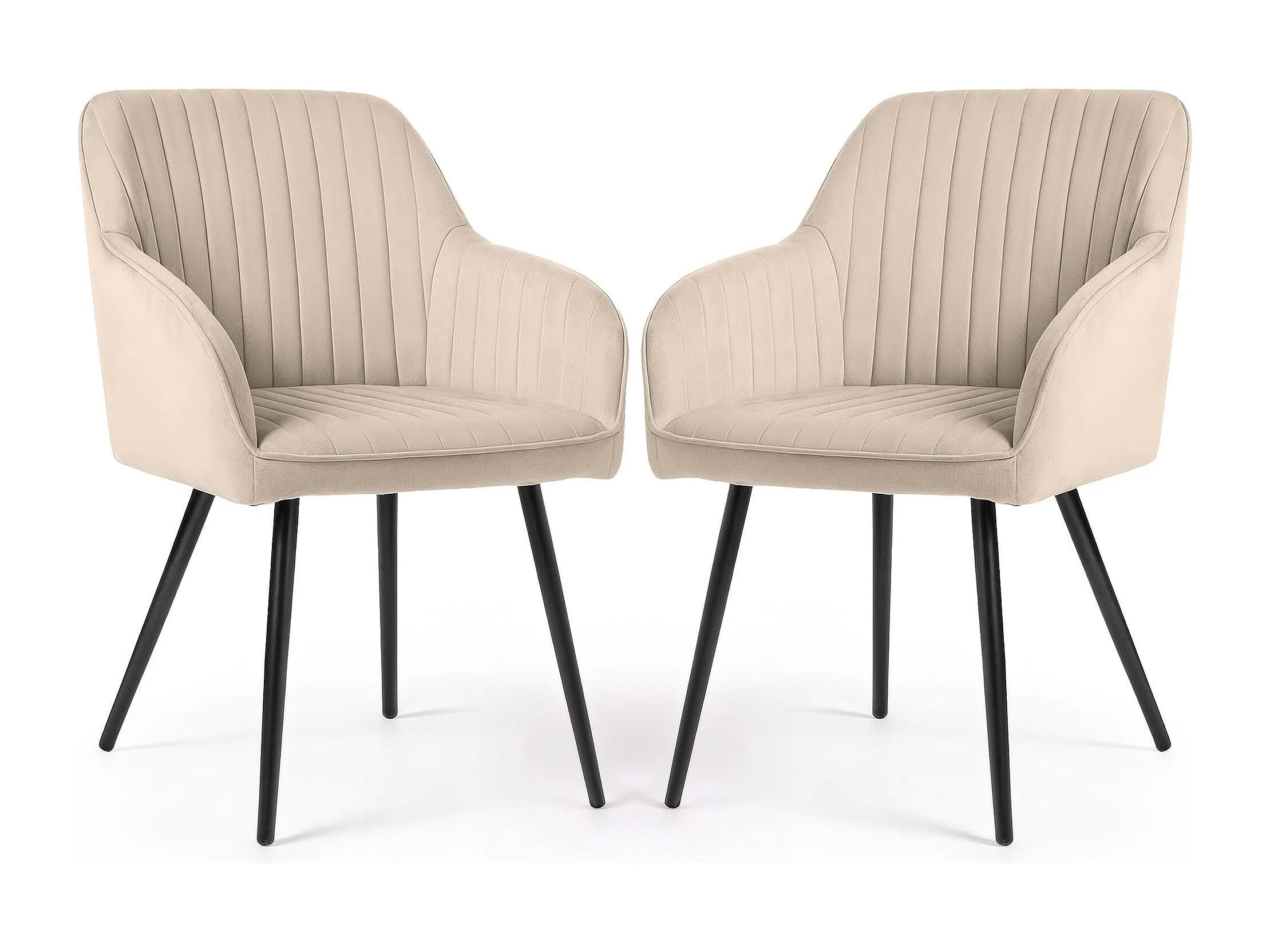Set van 2 Eetkamerstoelen FLORENCE met Armleuningen / Gestoffeerde Stoelen / Fluwelen Stoelen en Metalen Poten / Beige met zwarte benen