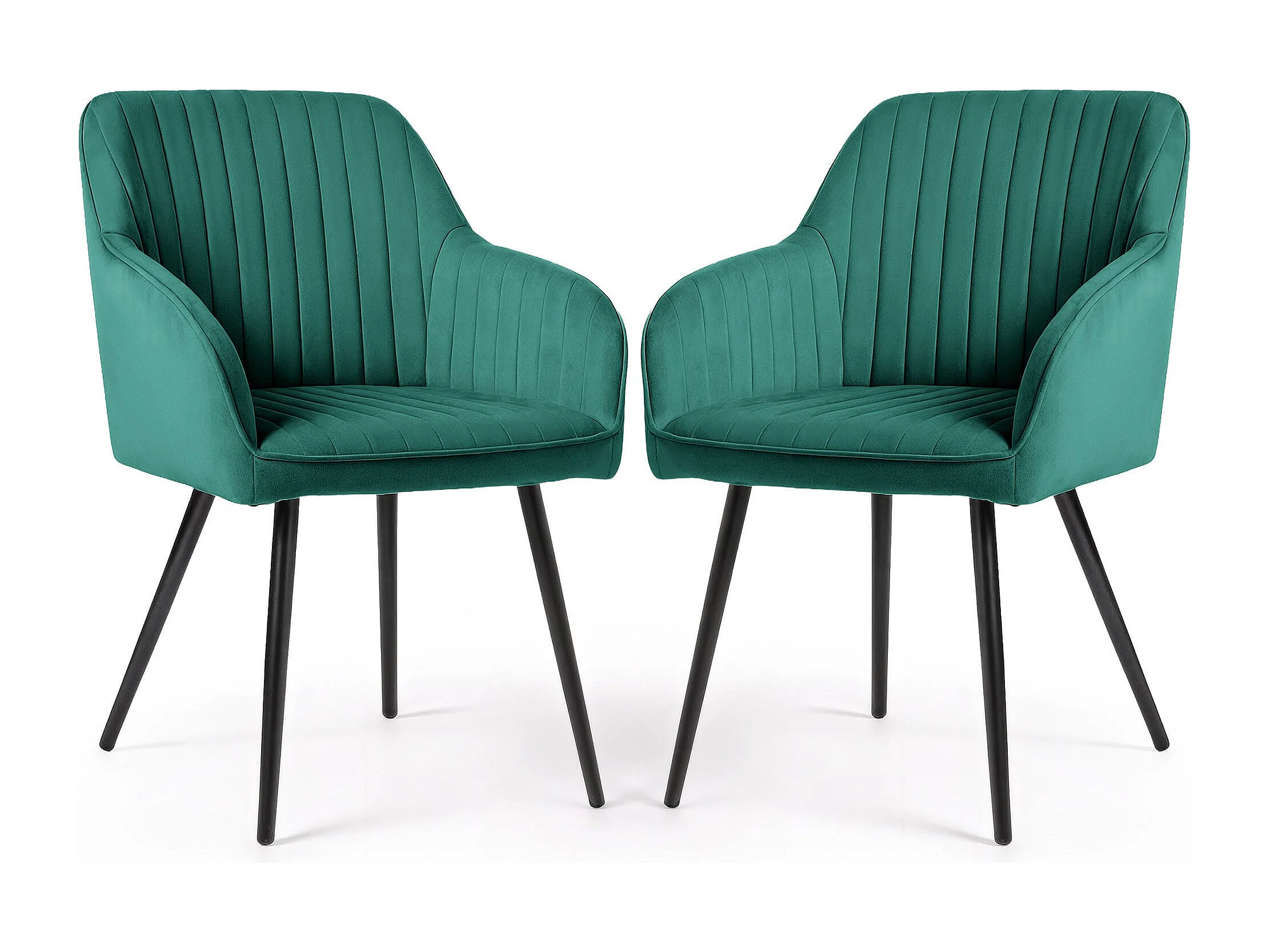 Set van 2 Eetkamerstoelen FLORENCE met Armleuningen / Gestoffeerde Stoelen / Fluwelen Stoelen en Metalen Poten / Flesgroen met zwarte benen