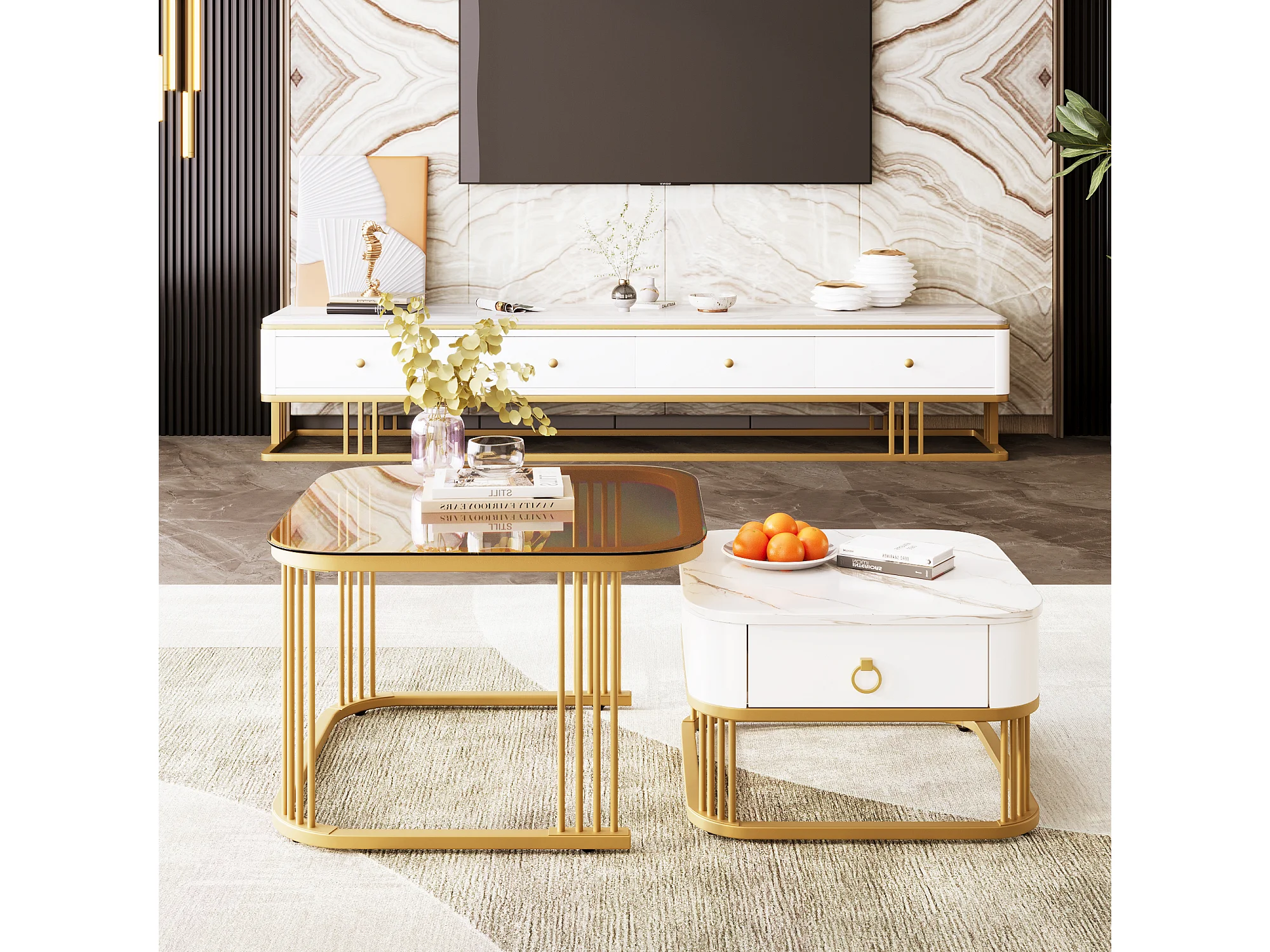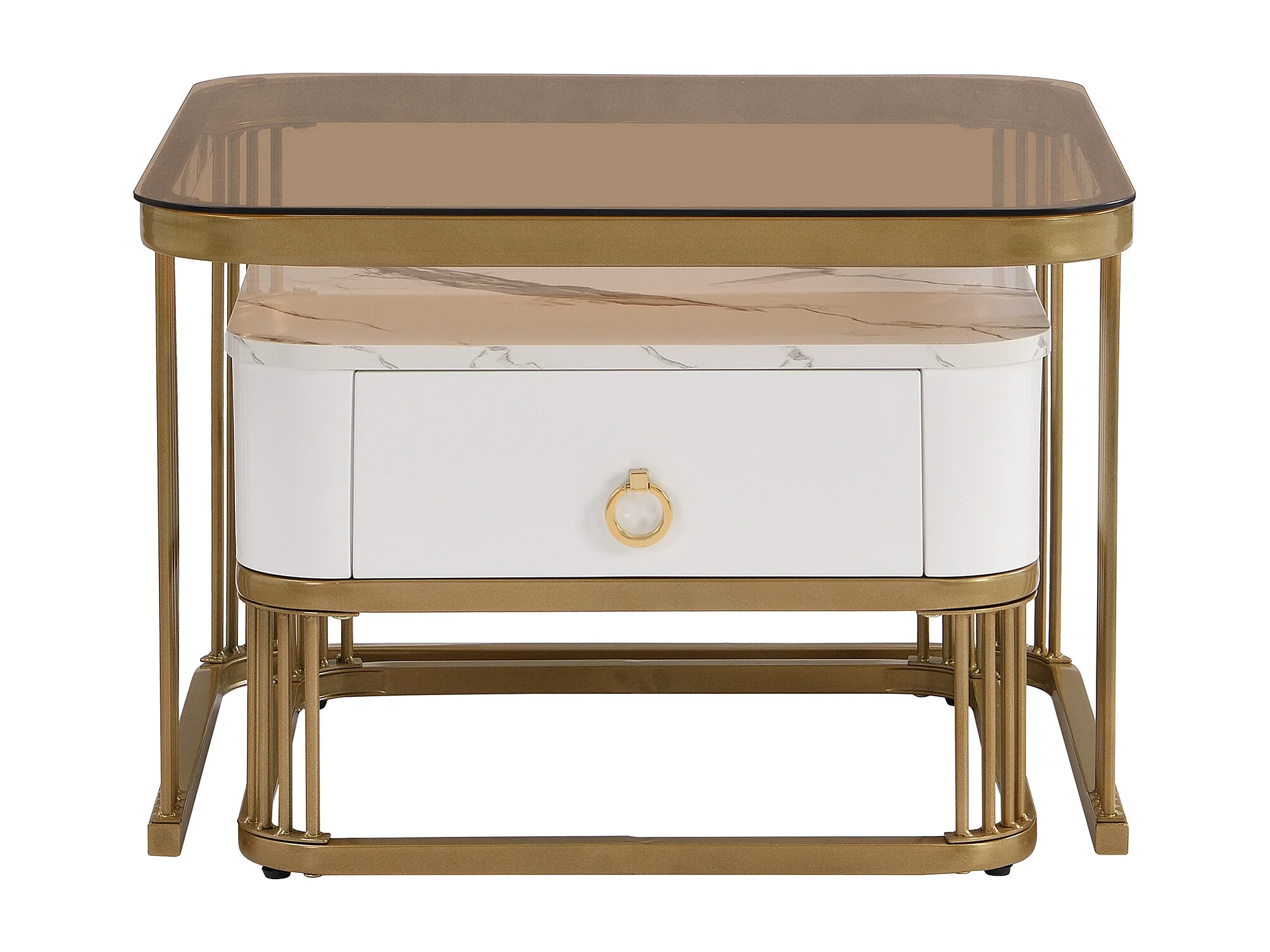 Set van 2 in elkaar passende salontafels, marmeren salontafel met glazen blad en lade, wit