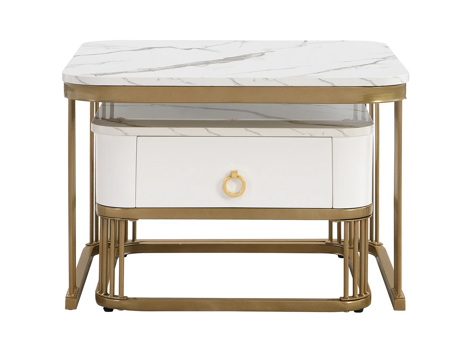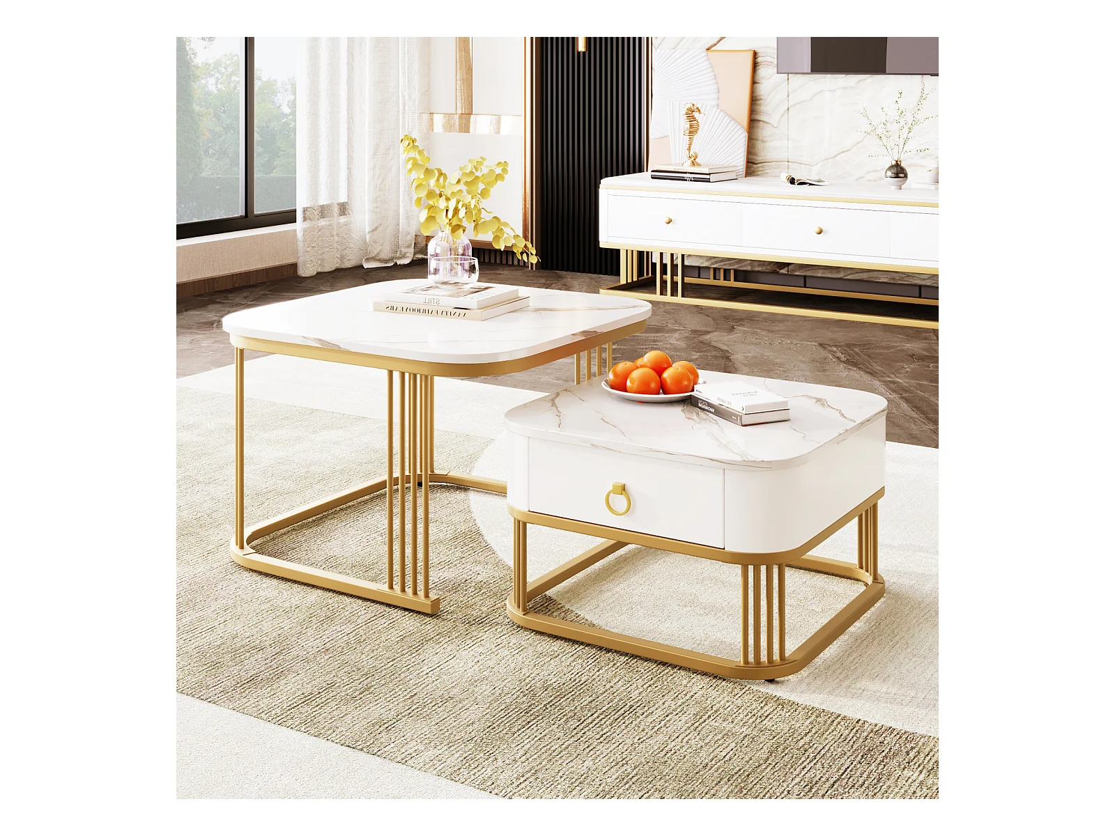 Set van 2 in elkaar passende salontafels, vierkant, 60 cm, met marmerlook blad, glanzend, lades, metalen poten, voor woonkamer en eetkamer - wit