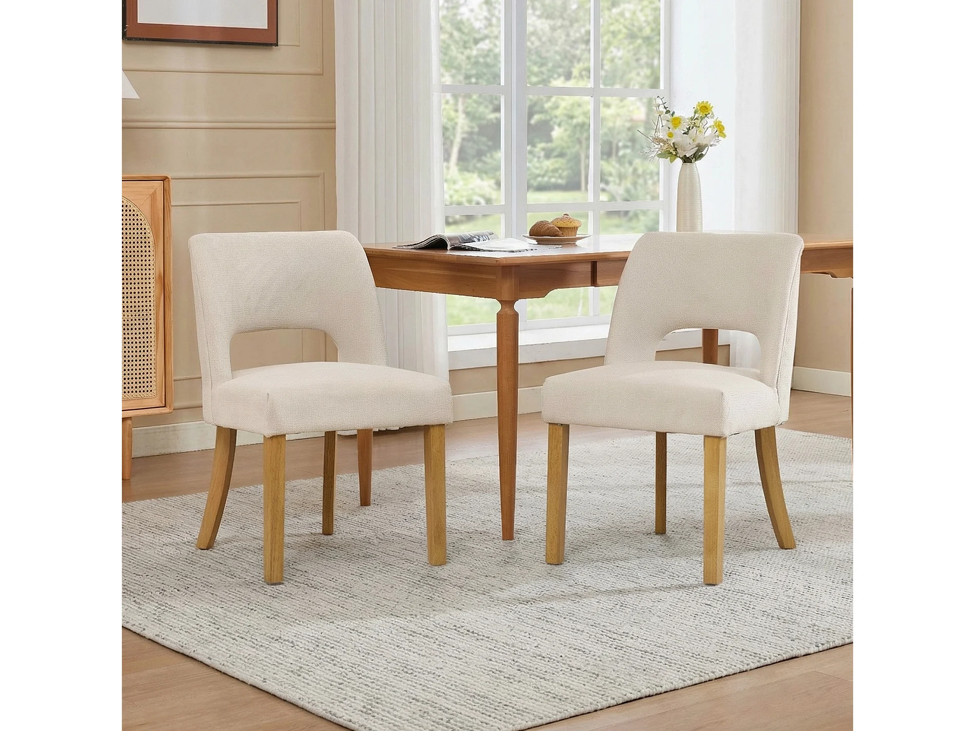 Set van 2 moderne eetkamerstoelen - Comfortabel en ademend - Linnen stof - Poten van massief hout - Beige