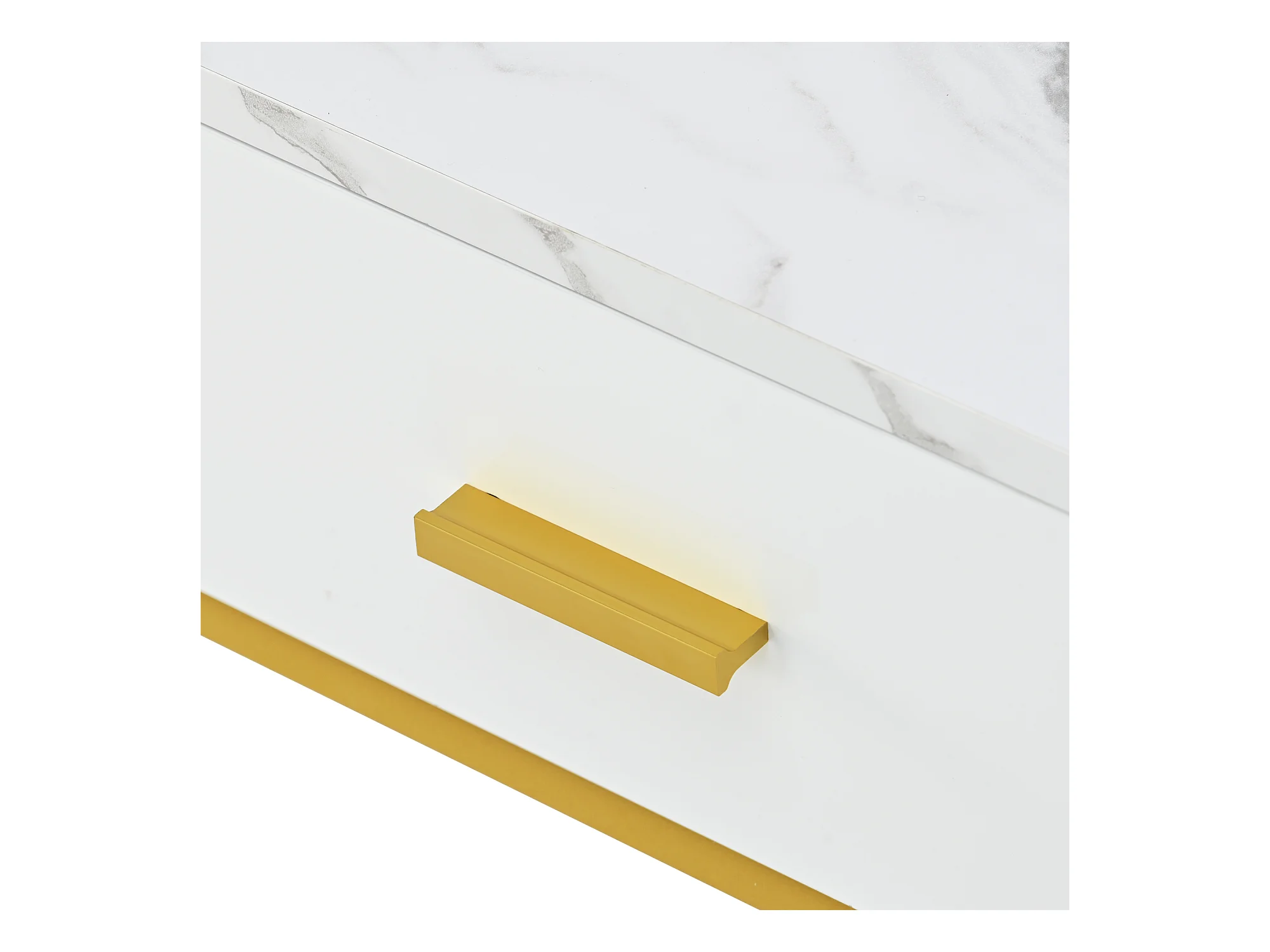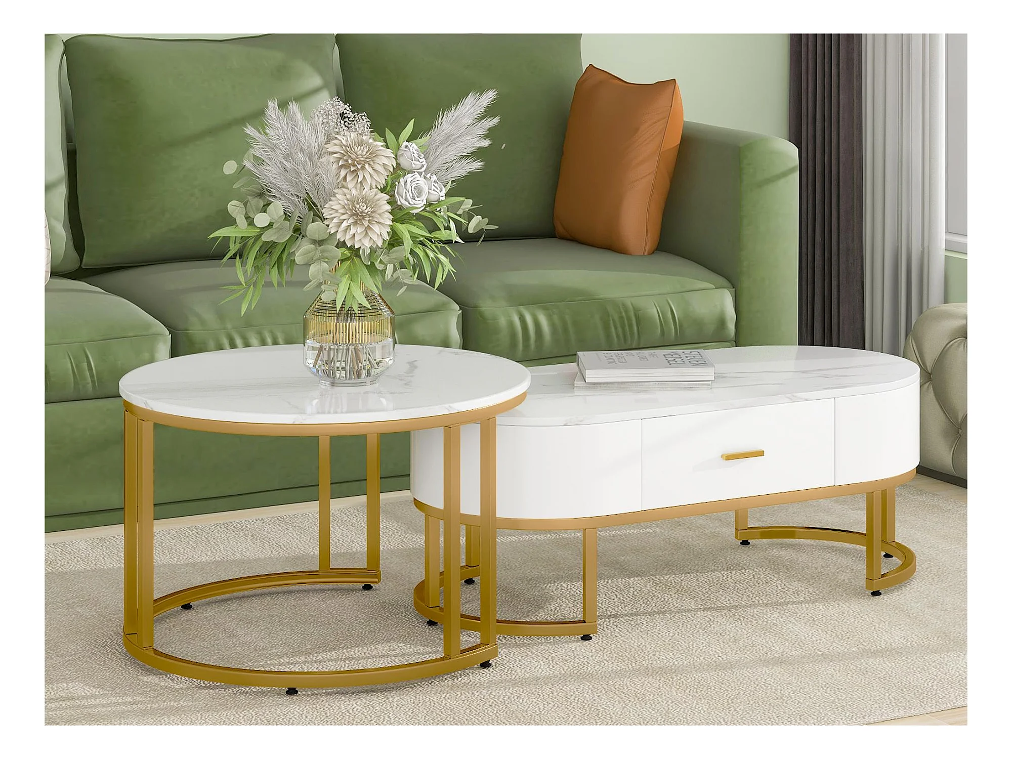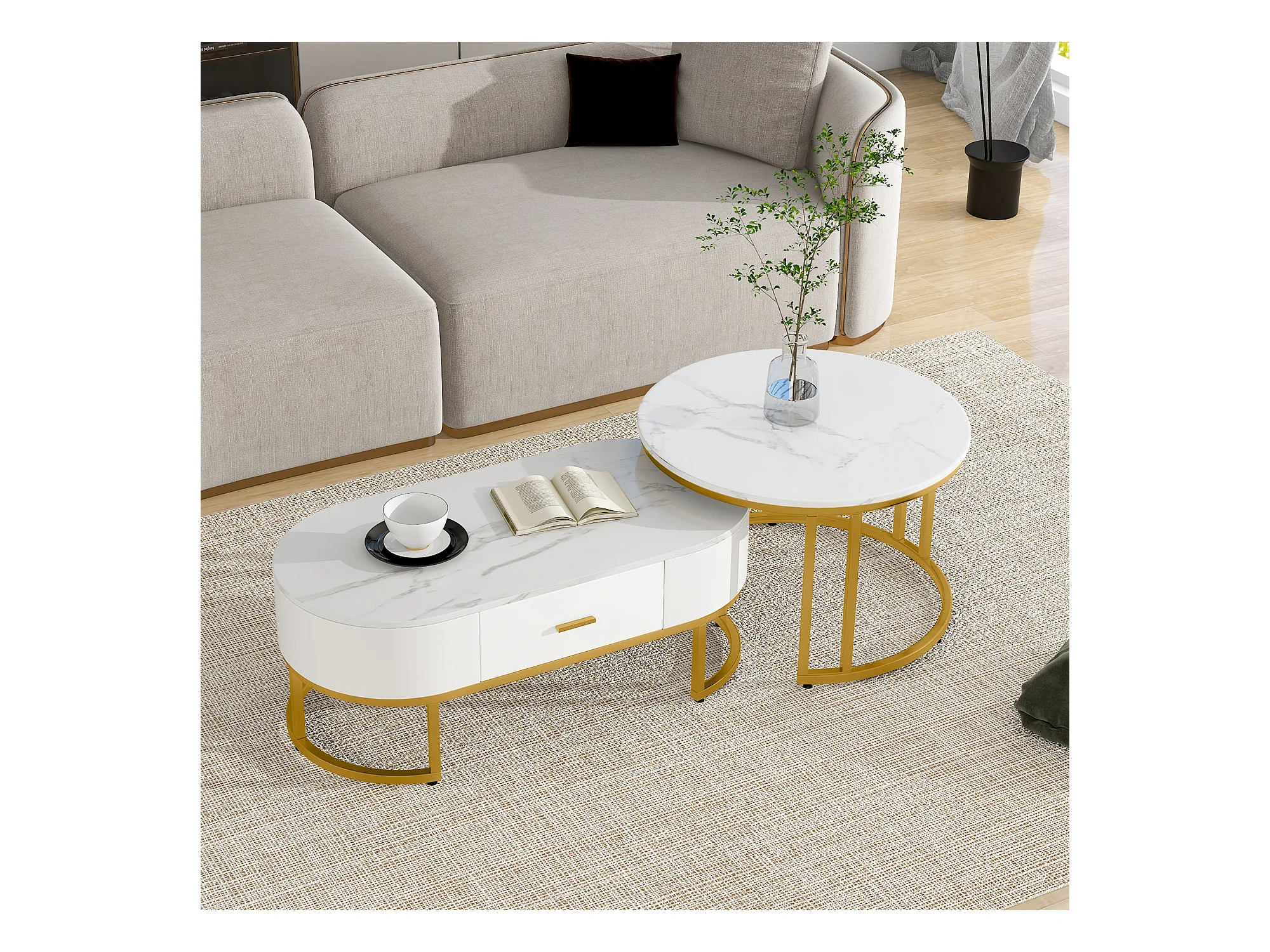 Set van 2 moderne Scandinavische bijzettafels met lade - marmerpatroon - glanzende uitstraling - Wit & Goud