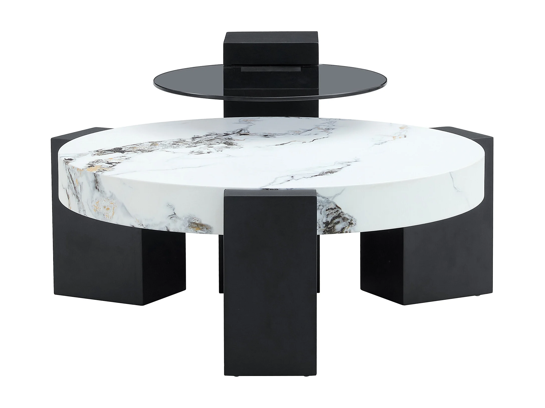 Set van 2 salontafels - Ronde tafels met marmerlook - MDF-hout + glas - Wit en zwart