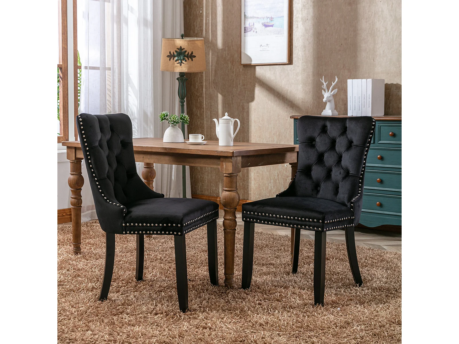 Set van 2 zwarte fluwelen stoelen met knoopsluiting en studs, houten poten