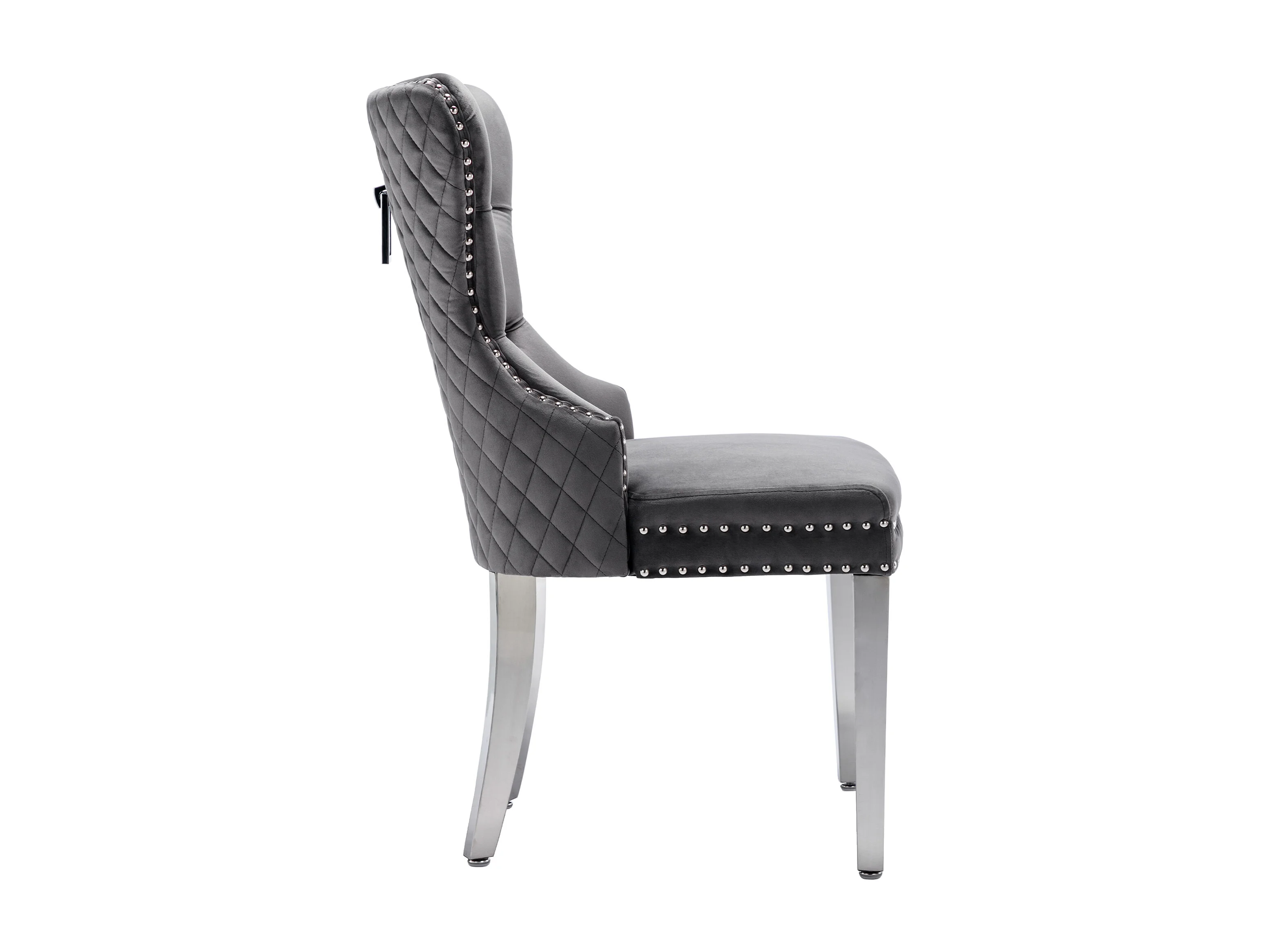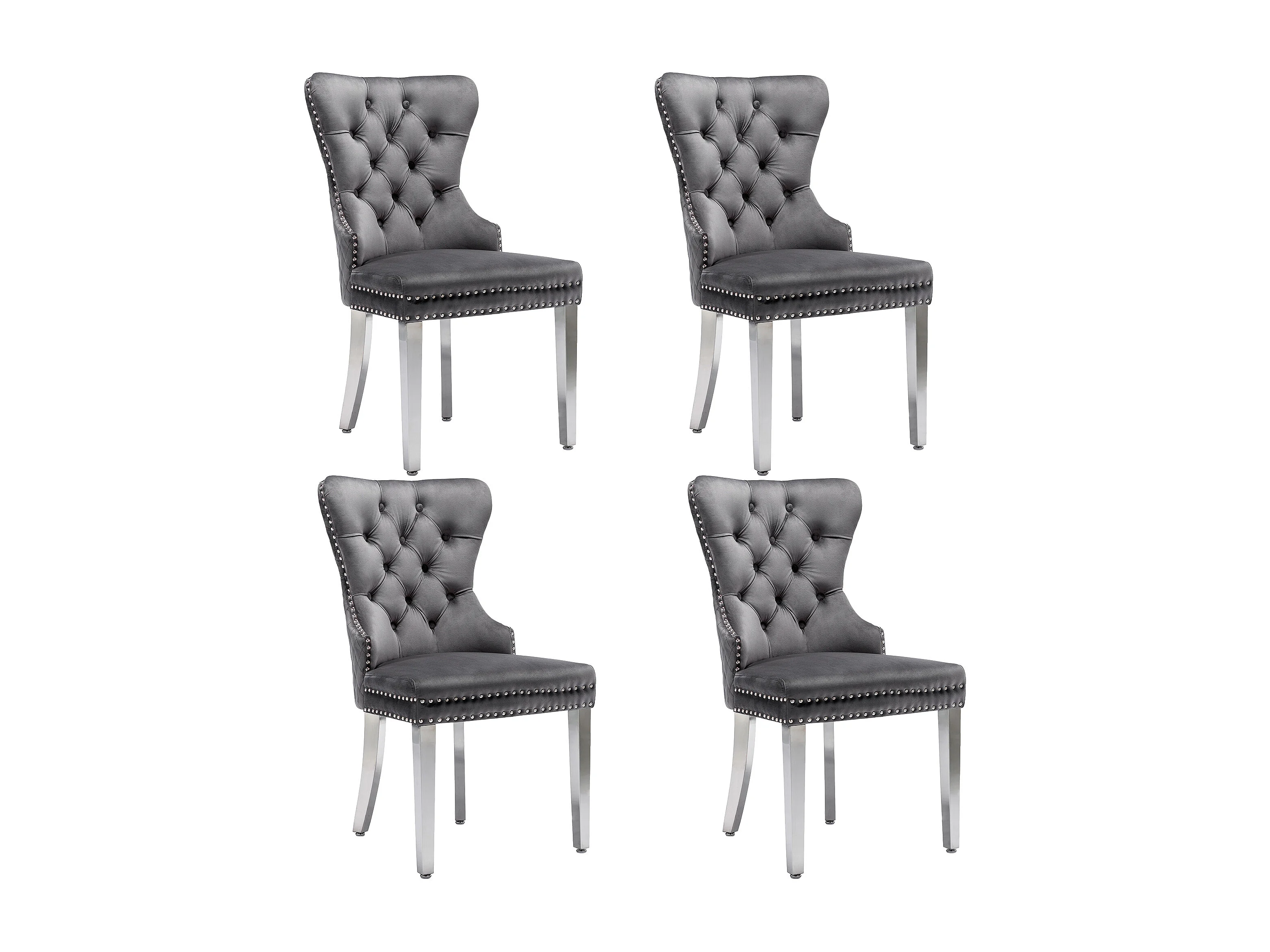Set van 4 stoelen, 53x62,5x94,5 cm, met vulling, knoopsluiting en klinknagelversieringen. Gemaakt van grijs fluweel, geschikt voor woon- en eetkamers.