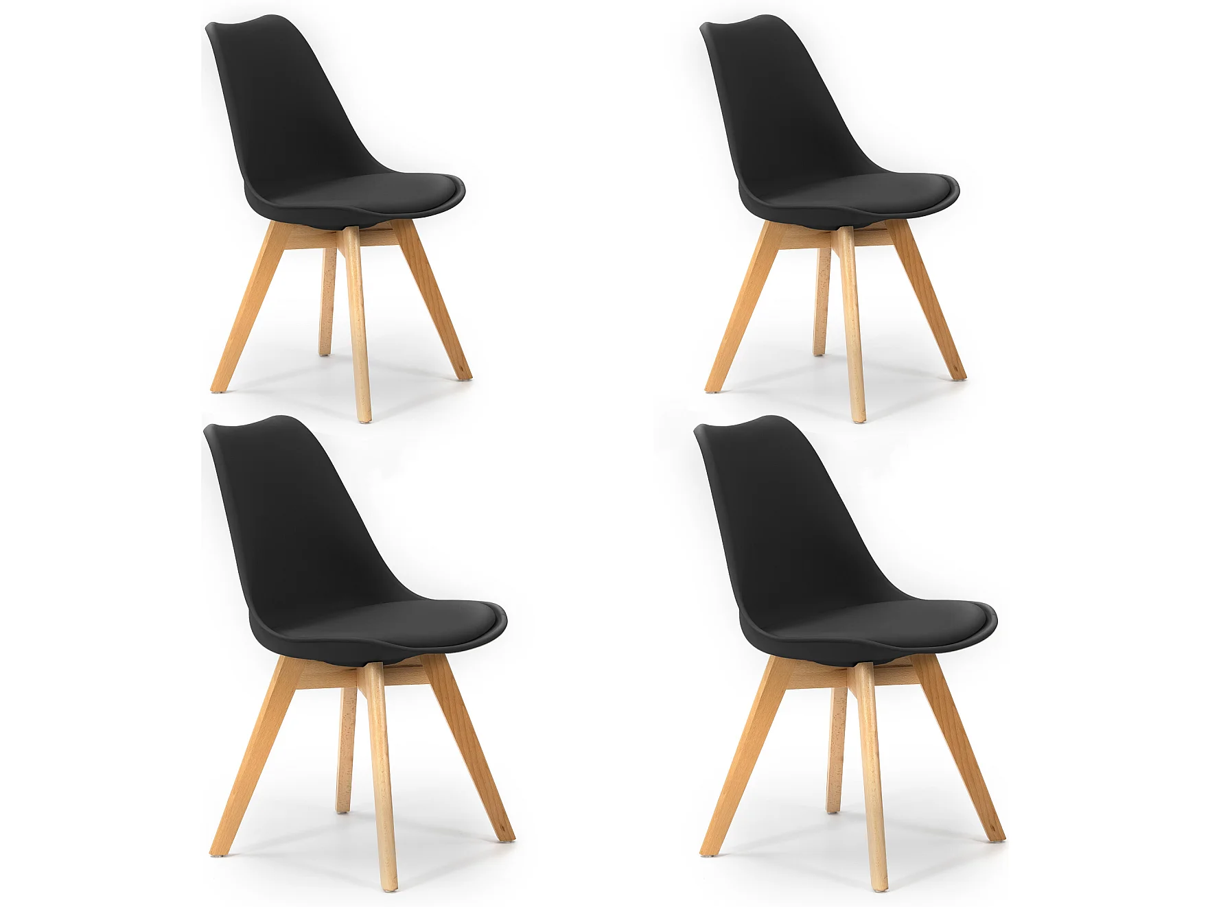 Set van 4 stoelen Klara Zwart, Houten Poten en Gewatteerde Zitting