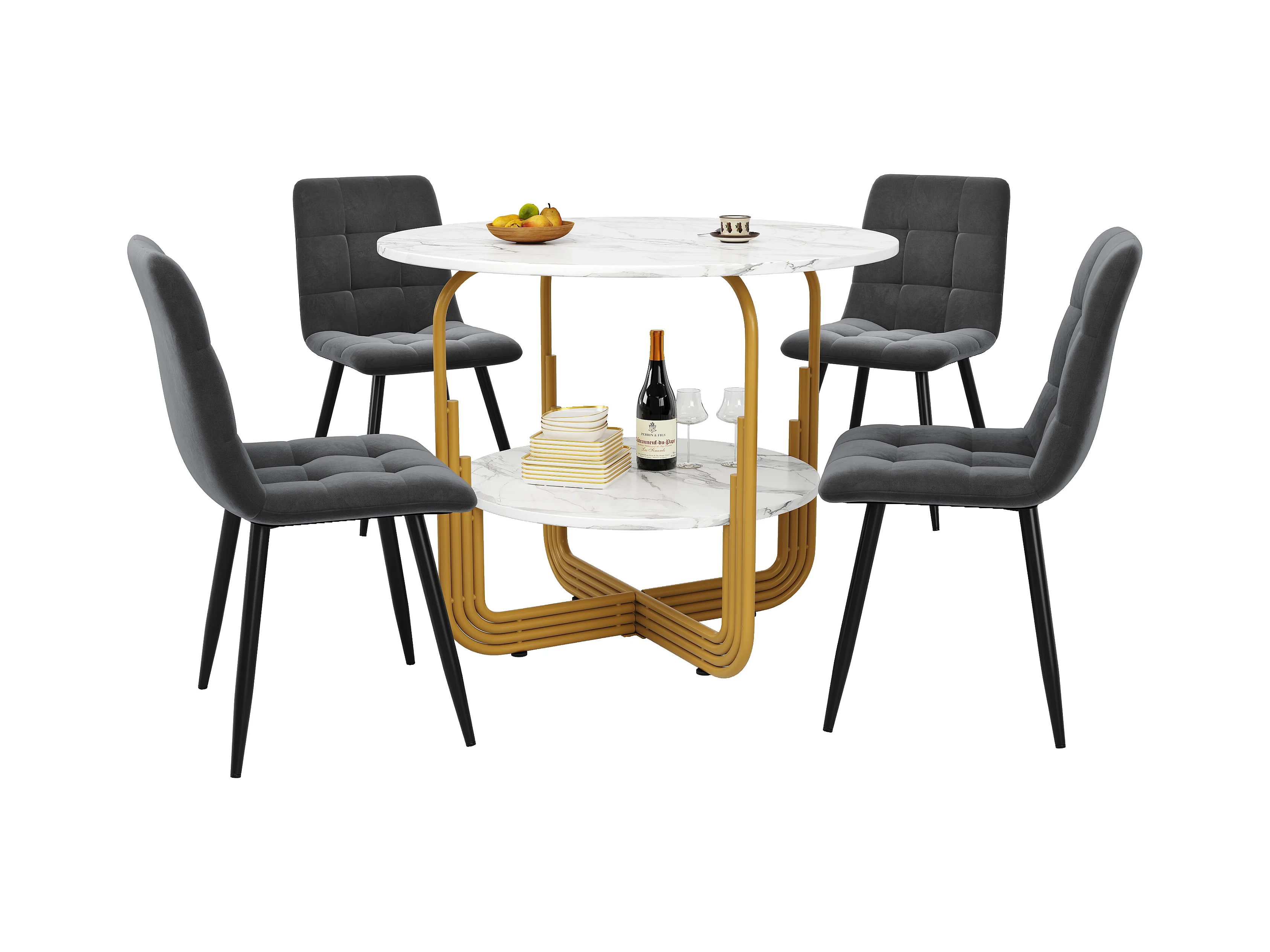 Set van 5 eettafel en stoelen - 100 x 100 x 75 cm - ronde tafel + 4 fluwelen stoelen - MDF + staal - grijs + wit