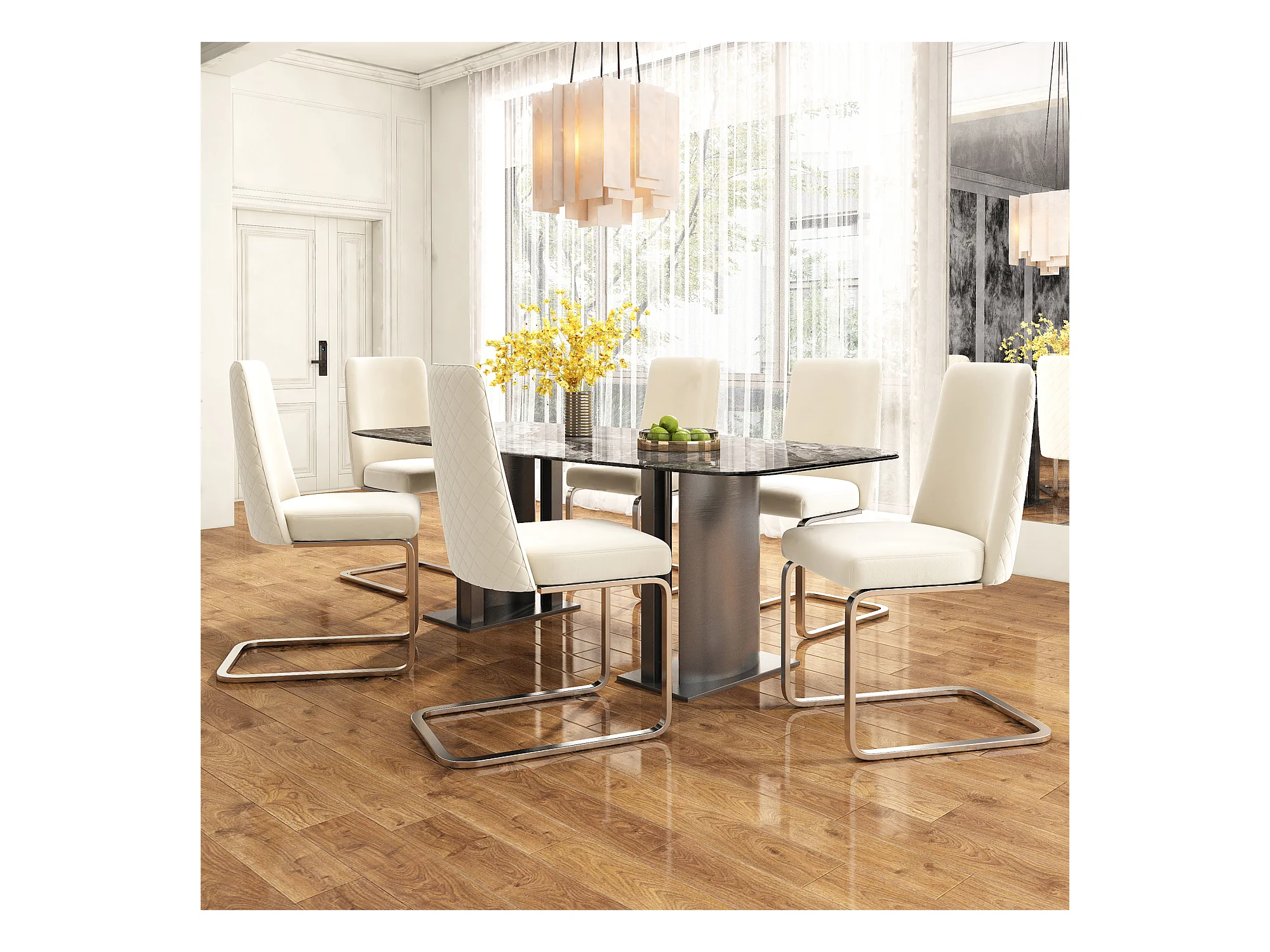 Set van 6 fluwelen eetkamerstoelen, luxe design, diamantvormige rugleuning, zilveren metalen poten, beige (47x47x90 cm)