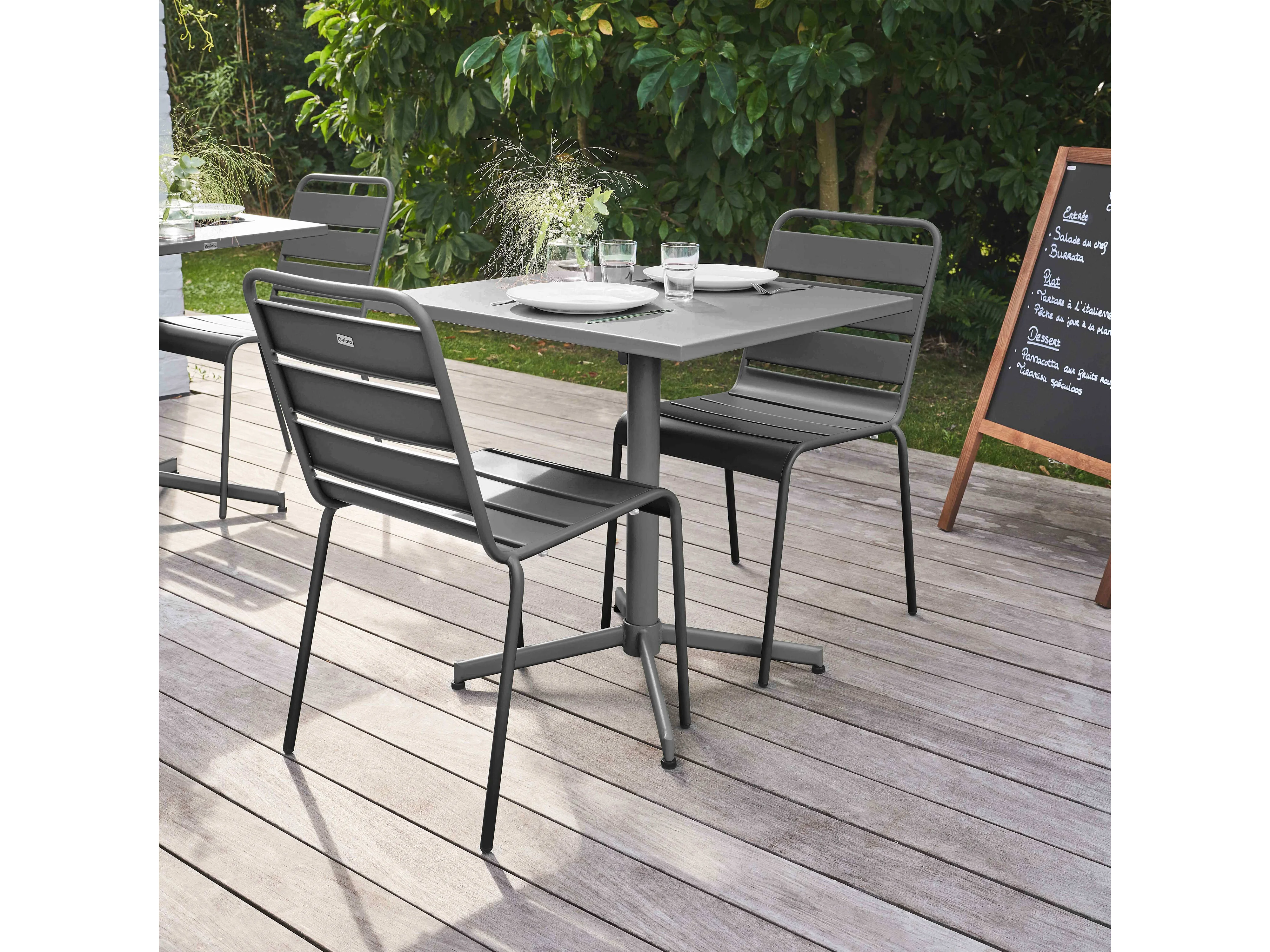 Set van een vierkante tuin tafel en 2 grijze stoelen