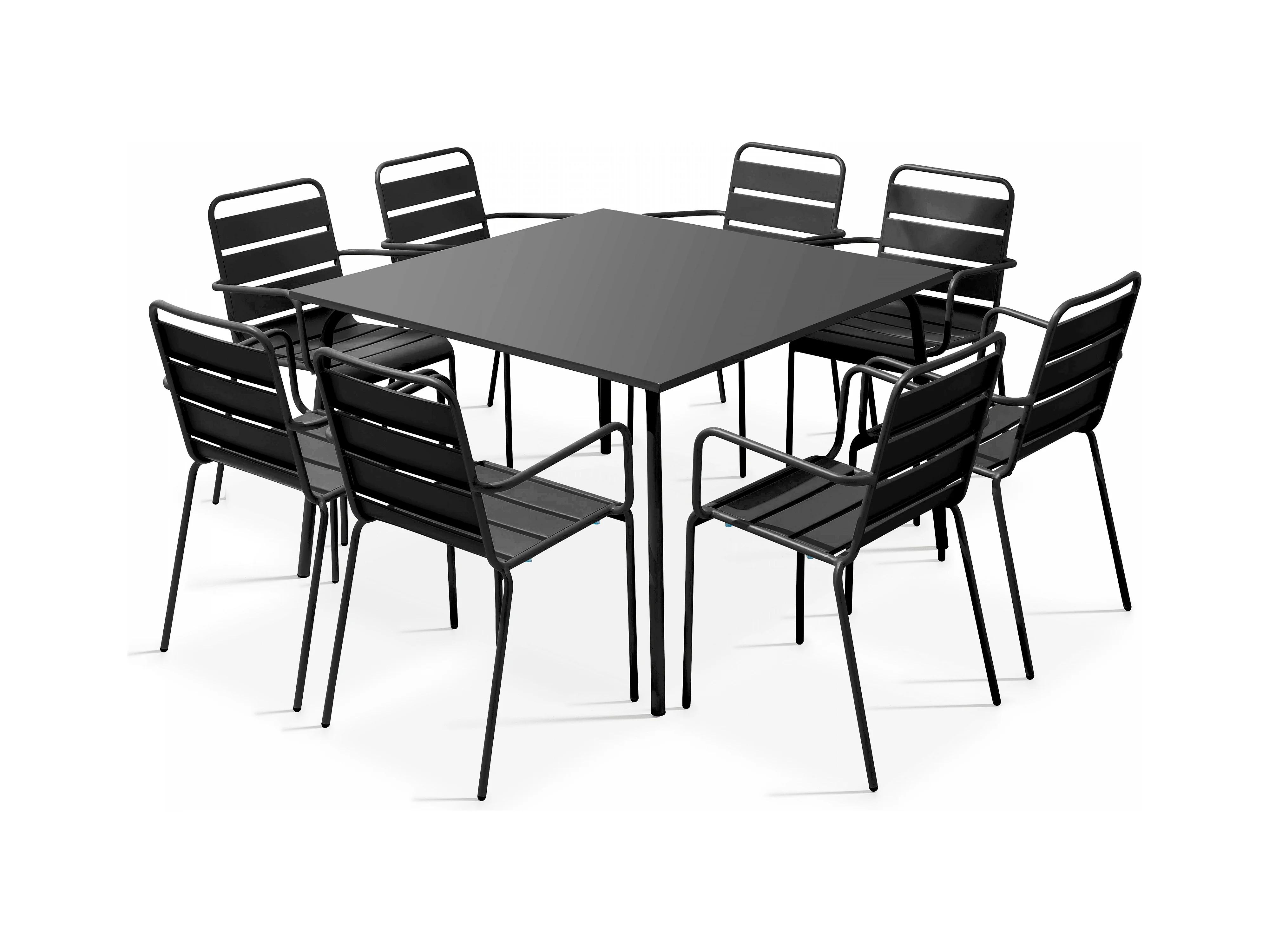 Set van een vierkante tuin tafel en 4 banken in antraciet metaal