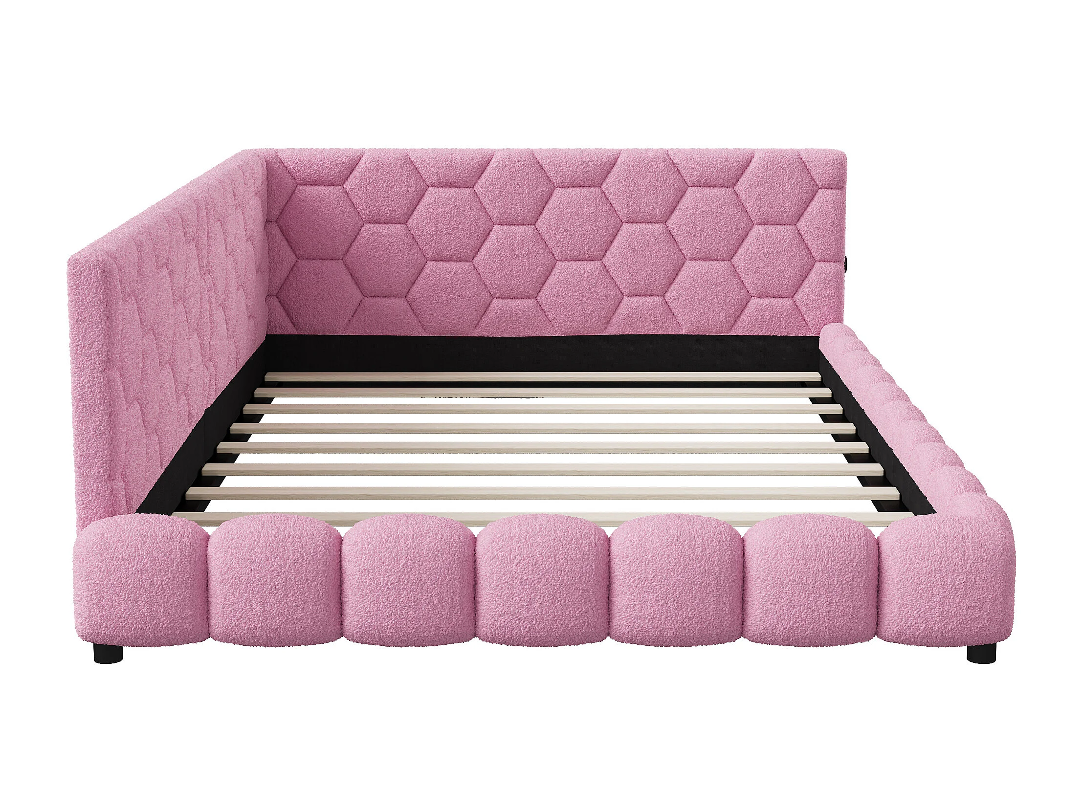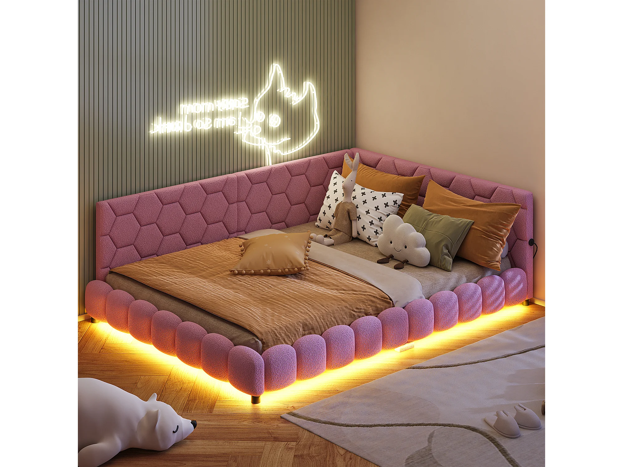 Slaapbank 140*200 cm, LED-sfeerverlichting onder het bed, 2 USB-poorten, roze, pluche