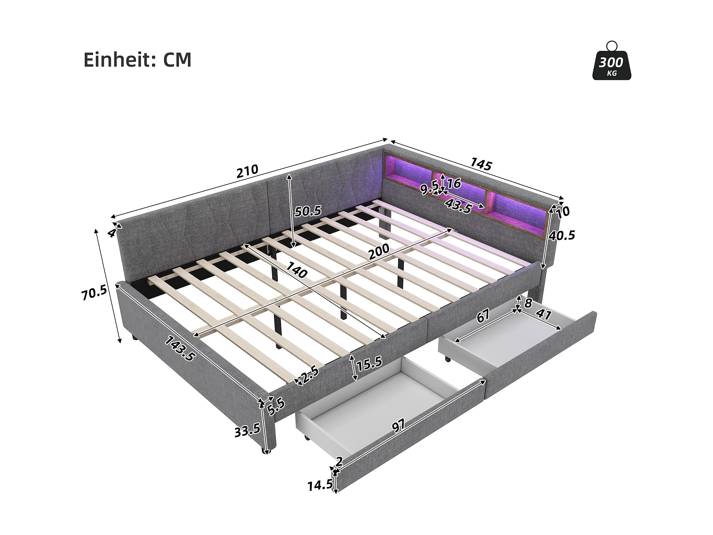 Slaapbank 140x200 cm, grijs linnen, bed voor volwassenen, ledverlichting, 2 lades, USB-aansluiting - matras niet inbegrepen