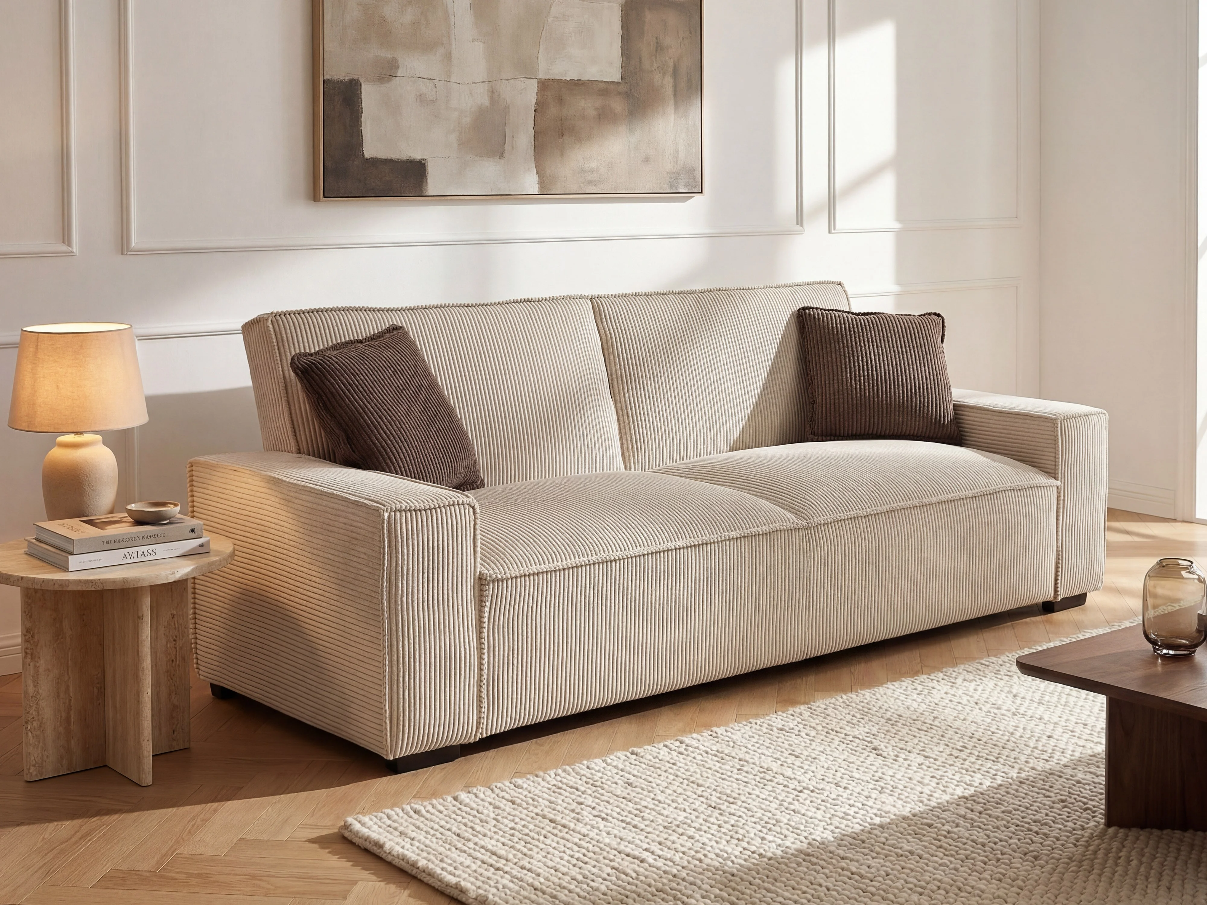 Uitschuifbare driezitsslaapbank van beige ribfluweel SEKOTA