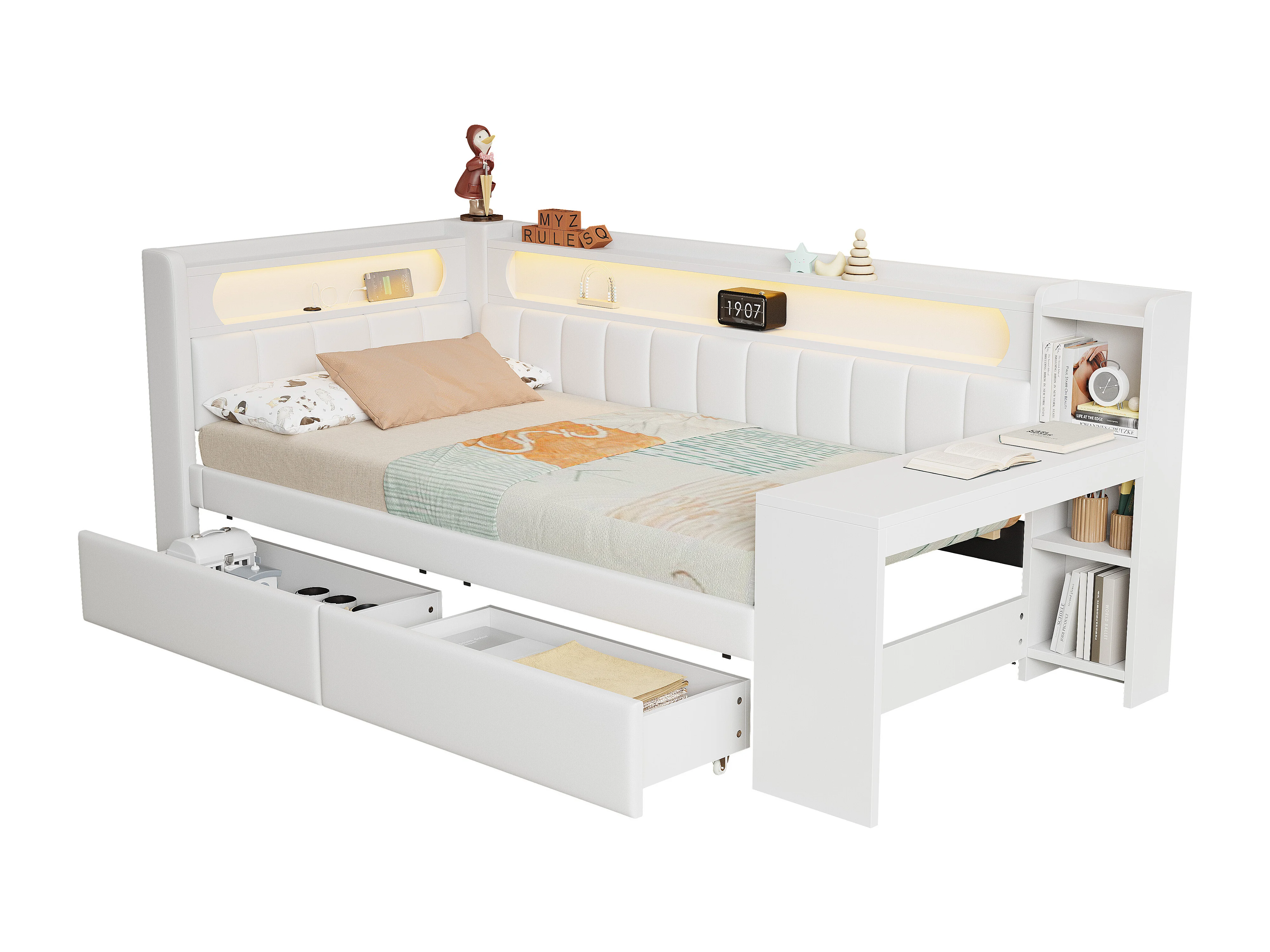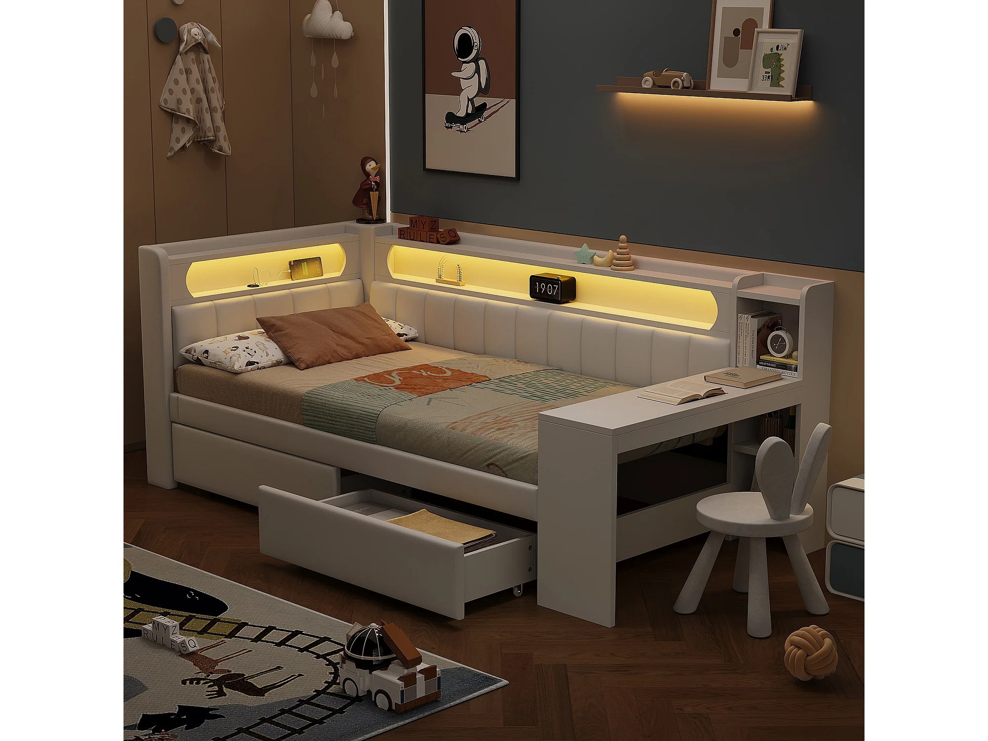 Kinderslaapbank - 90 x 200 cm - met LED-verlichting + USB + bureau + 2 lades - MDF + linnen - wit