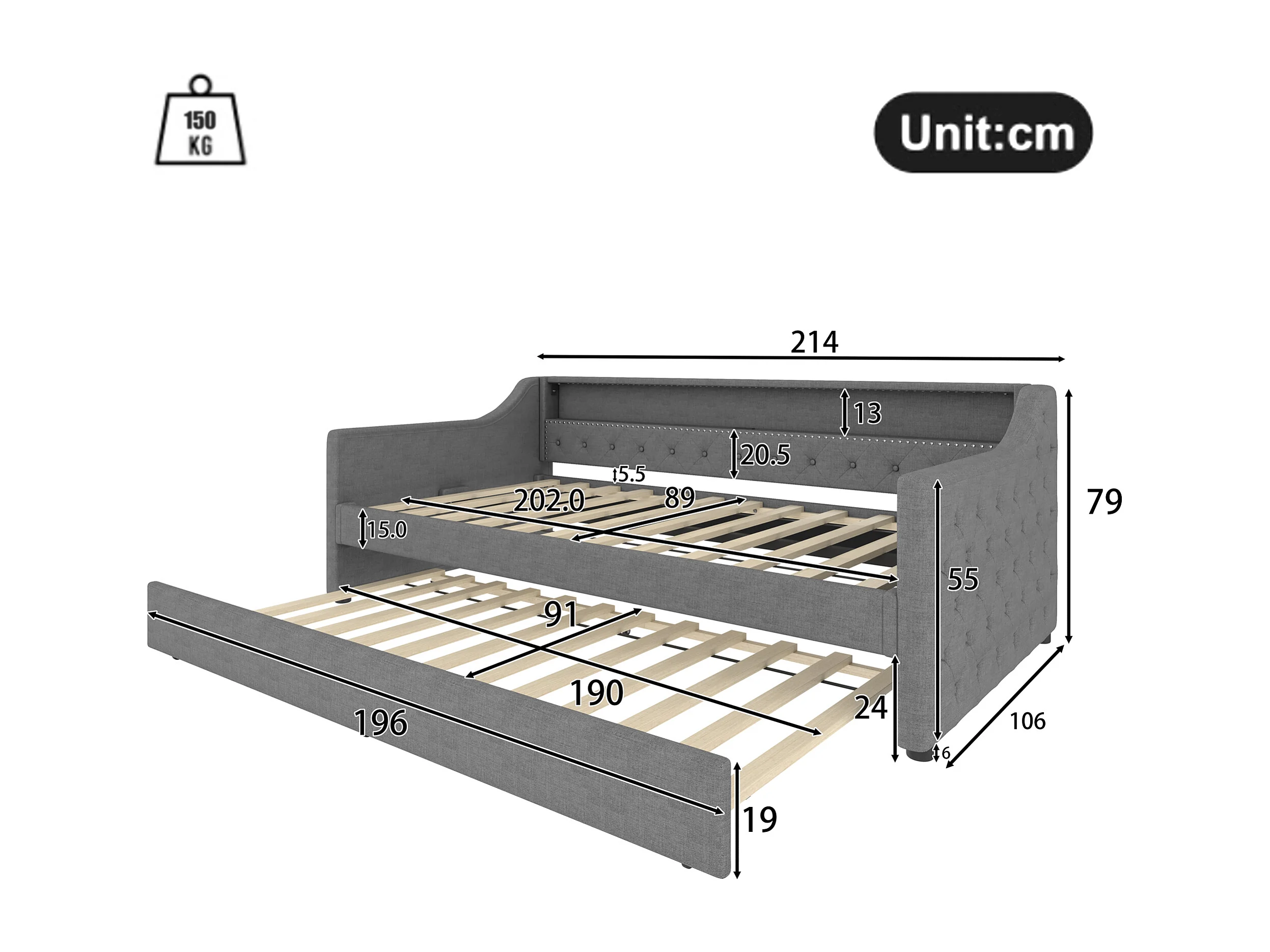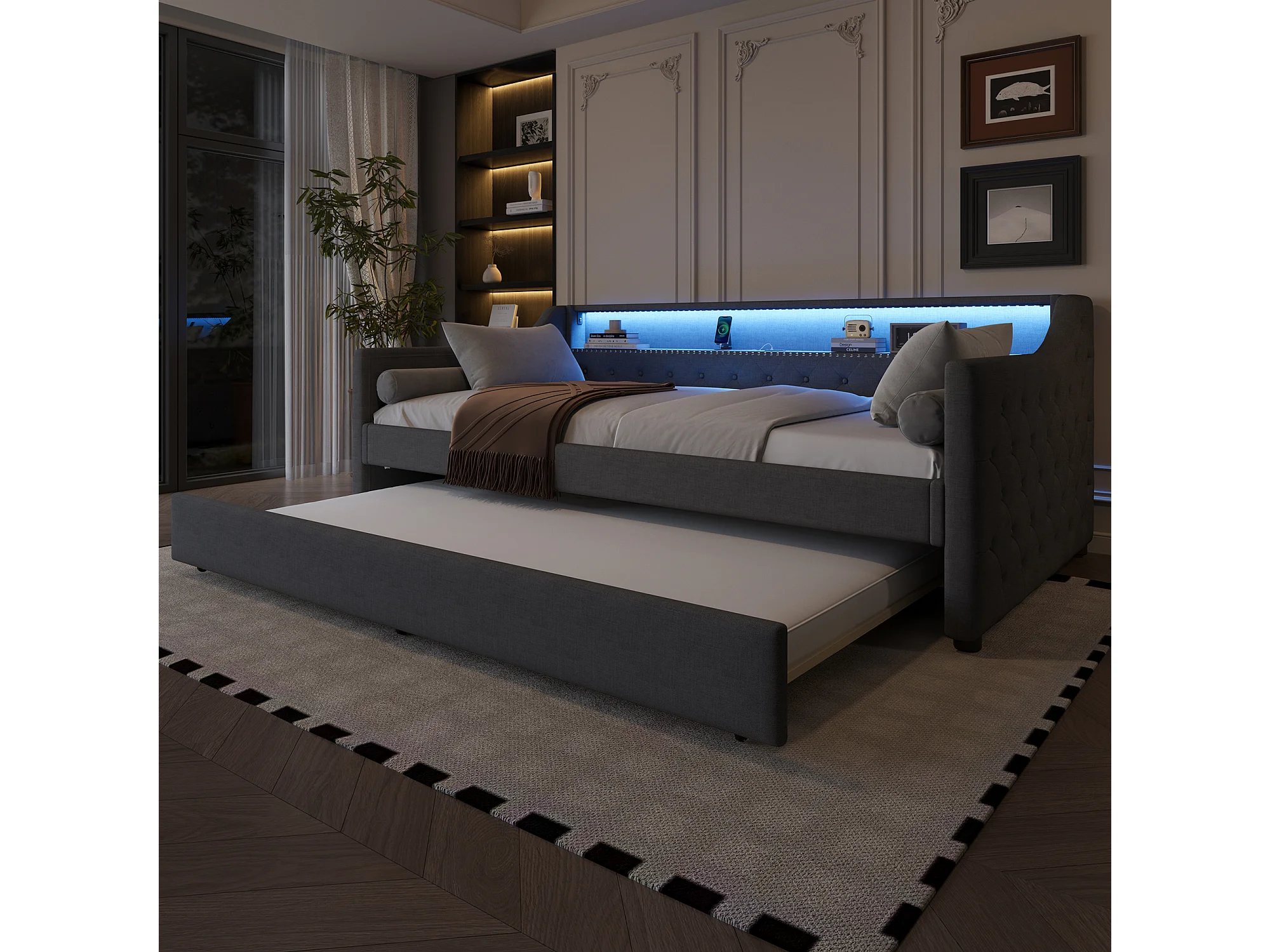 Slaapbank 90 x 200 cm met uitschuifbaar bed 90 x 190 cm - met opbergruimte + LED's + USB - linnen - grijs