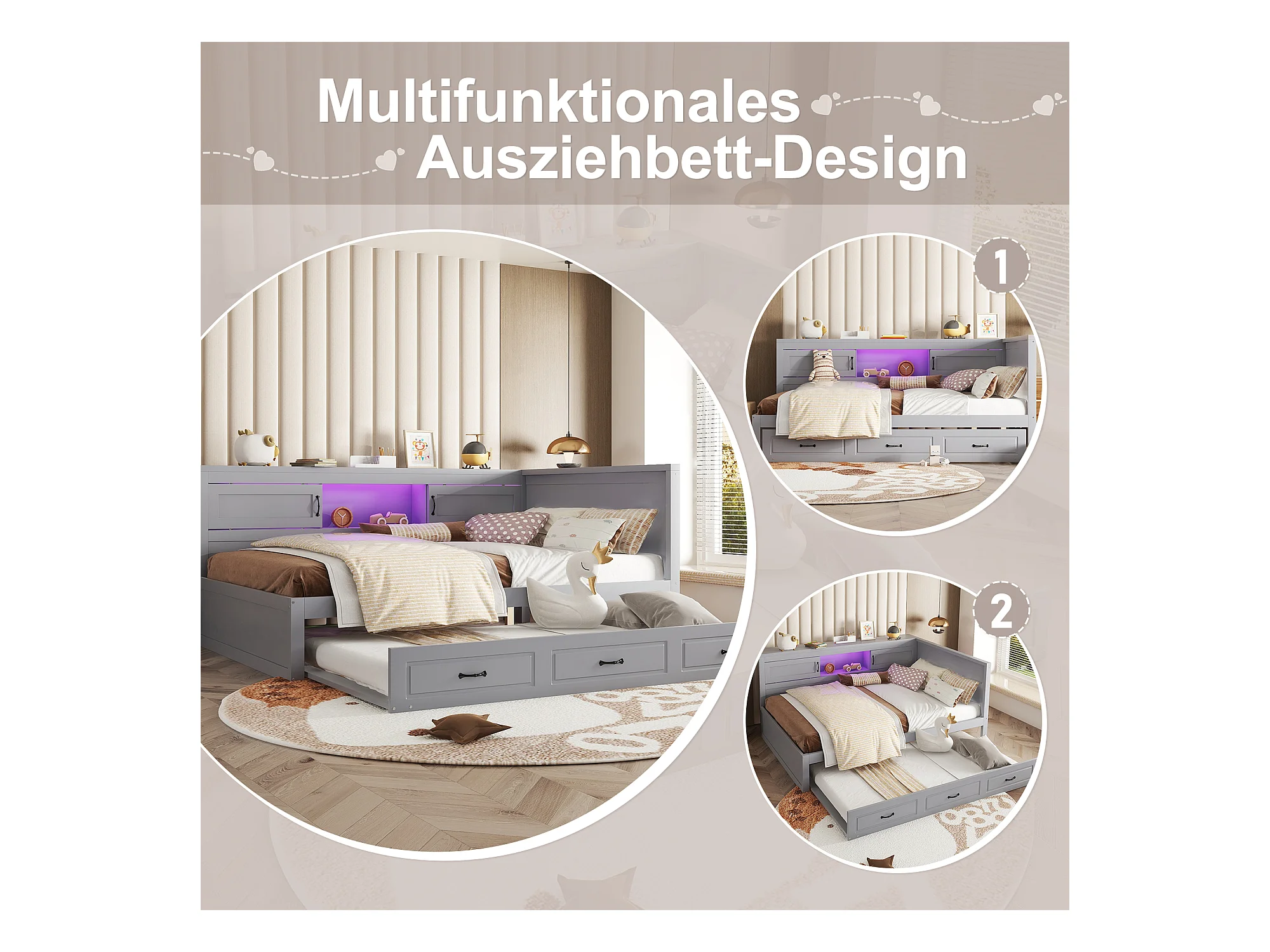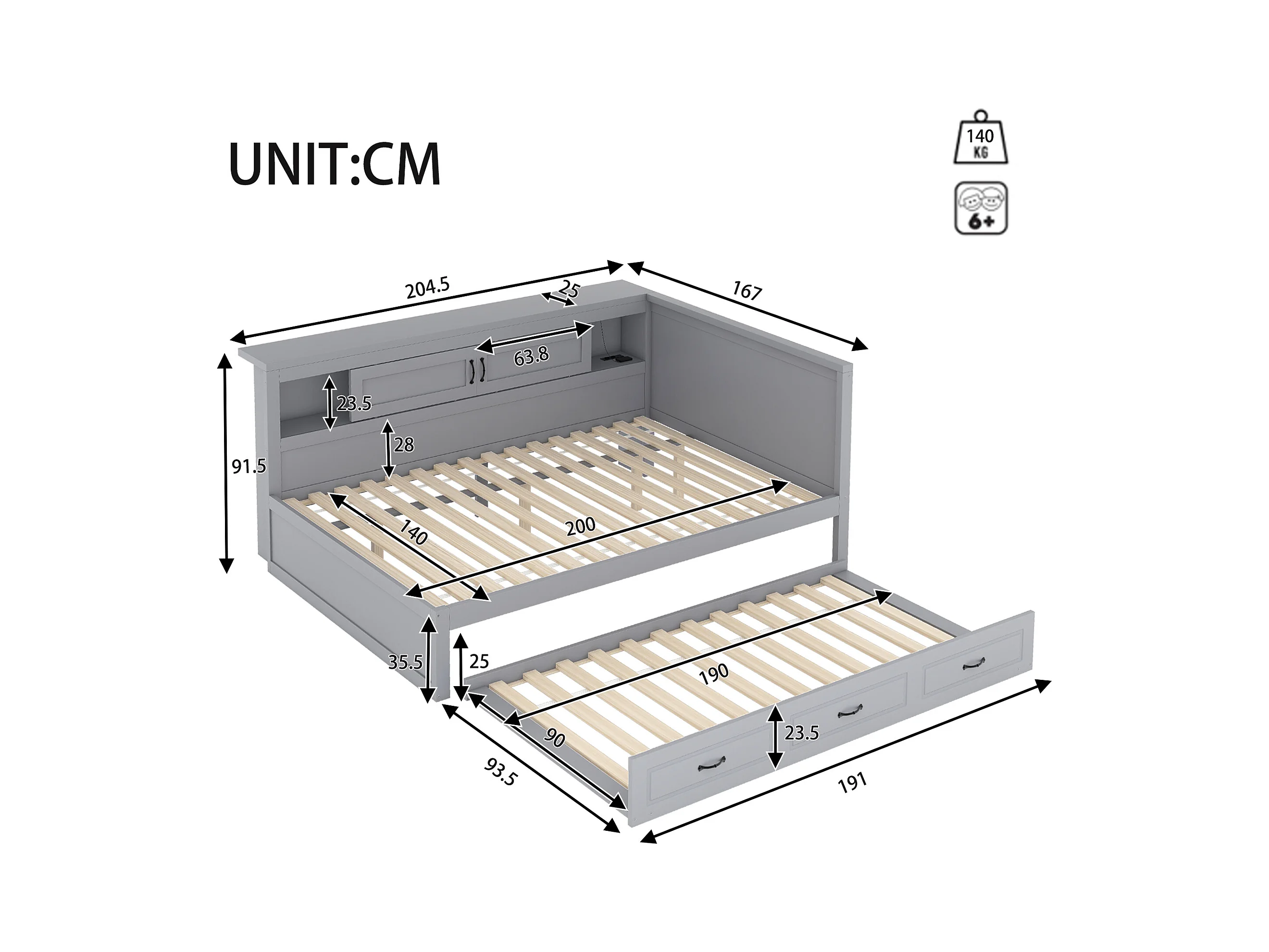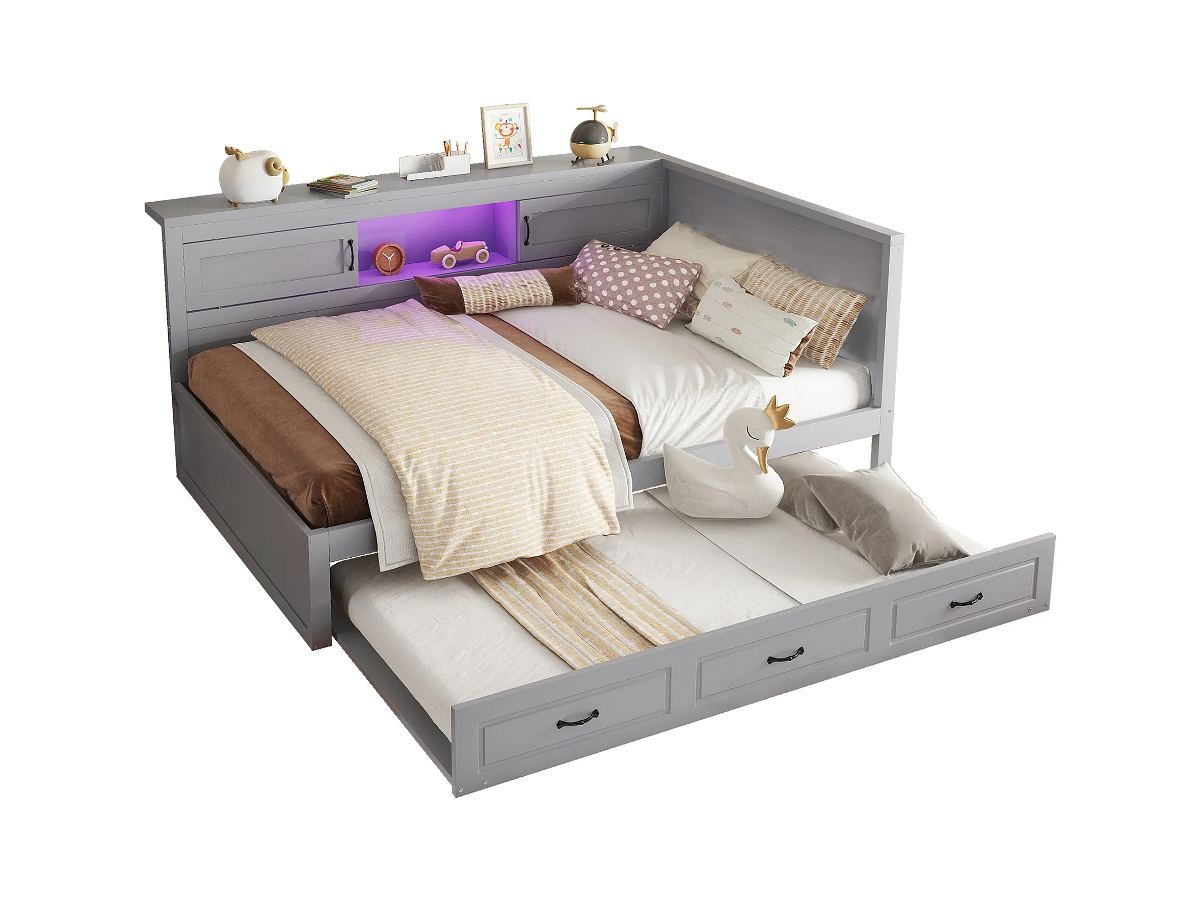 Slaapbank, Daybed, 140x200 cm, met LED, zij-opbergruimte, uitschuifbed, stopcontact + USB, zonder matras, Grijs (204,5x167x91,5 cm)