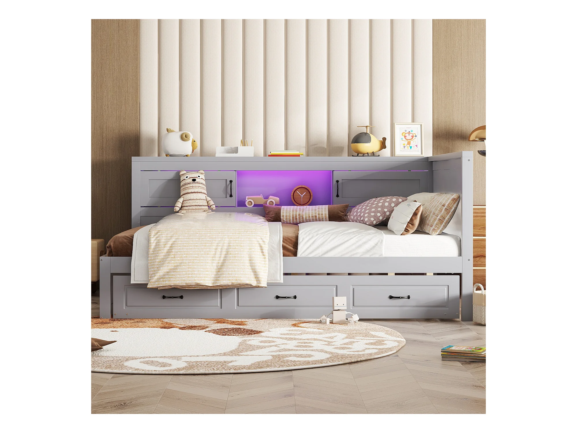 Multifunctionele slaapbank 140x200 cm in massief grijs hout, grote lades, LED- en USB-aansluiting, planken - Praktisch en stijlvol tweepersoonsbed