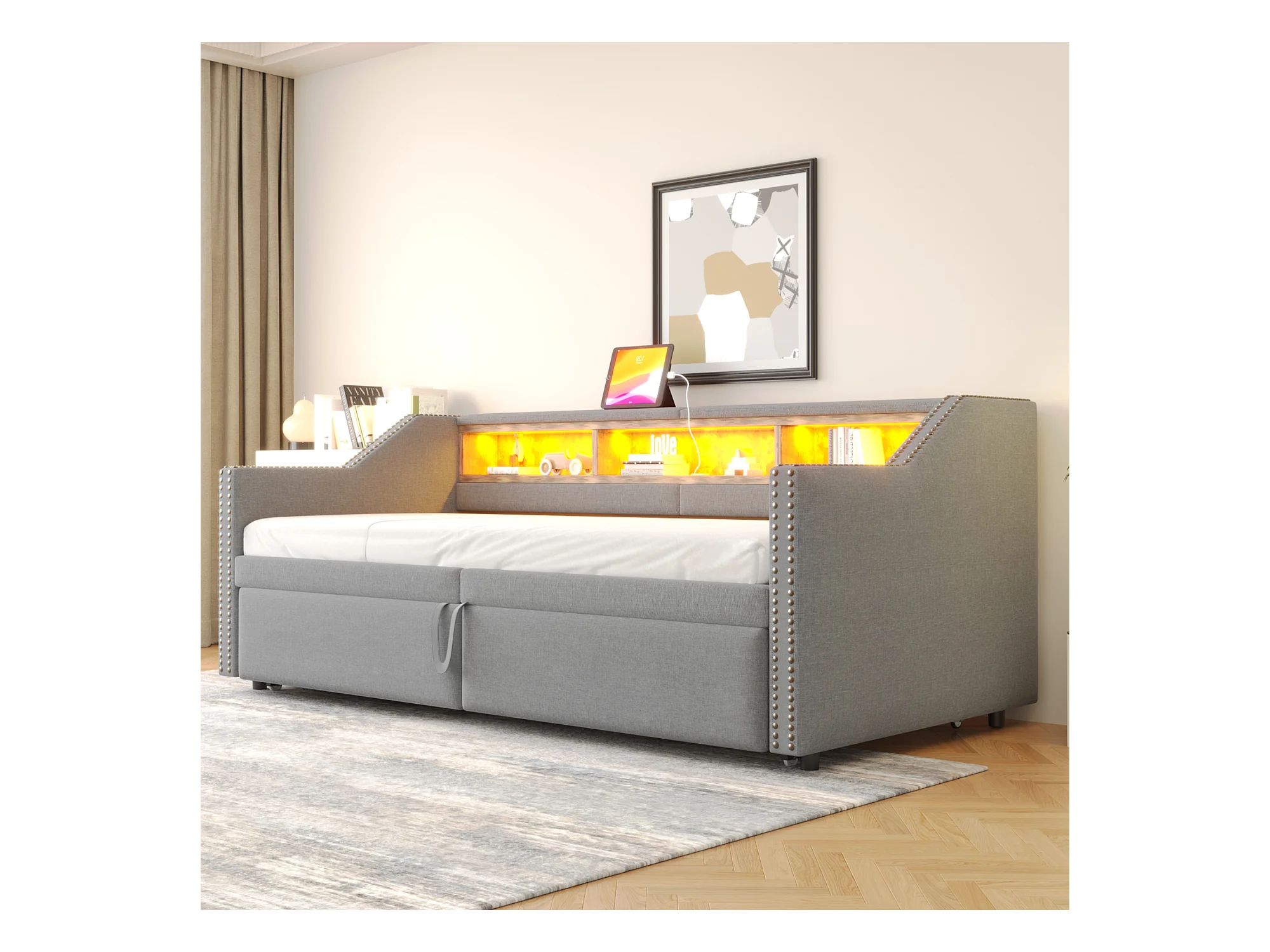 Slaapbank 90x200 cm met lades, veel opbergruimte en USB-aansluiting, hout, grijs (192,3x110x100 cm)