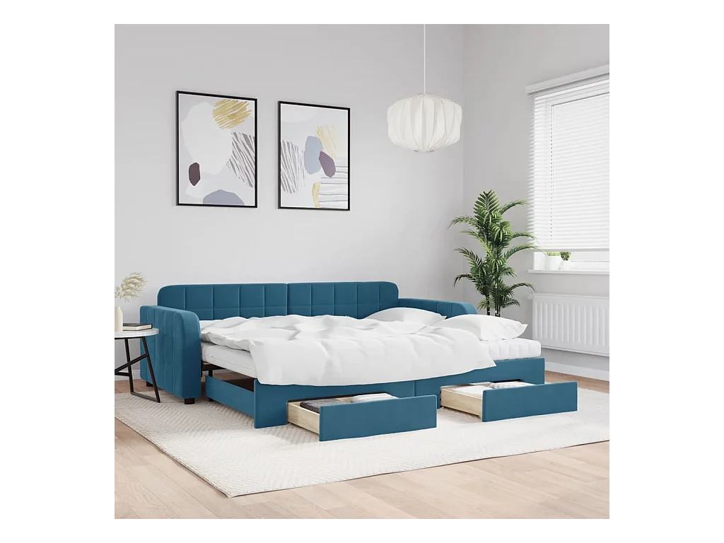 Slaapbank met onderschuifbed en lades 90x200 cm fluweel blauw
