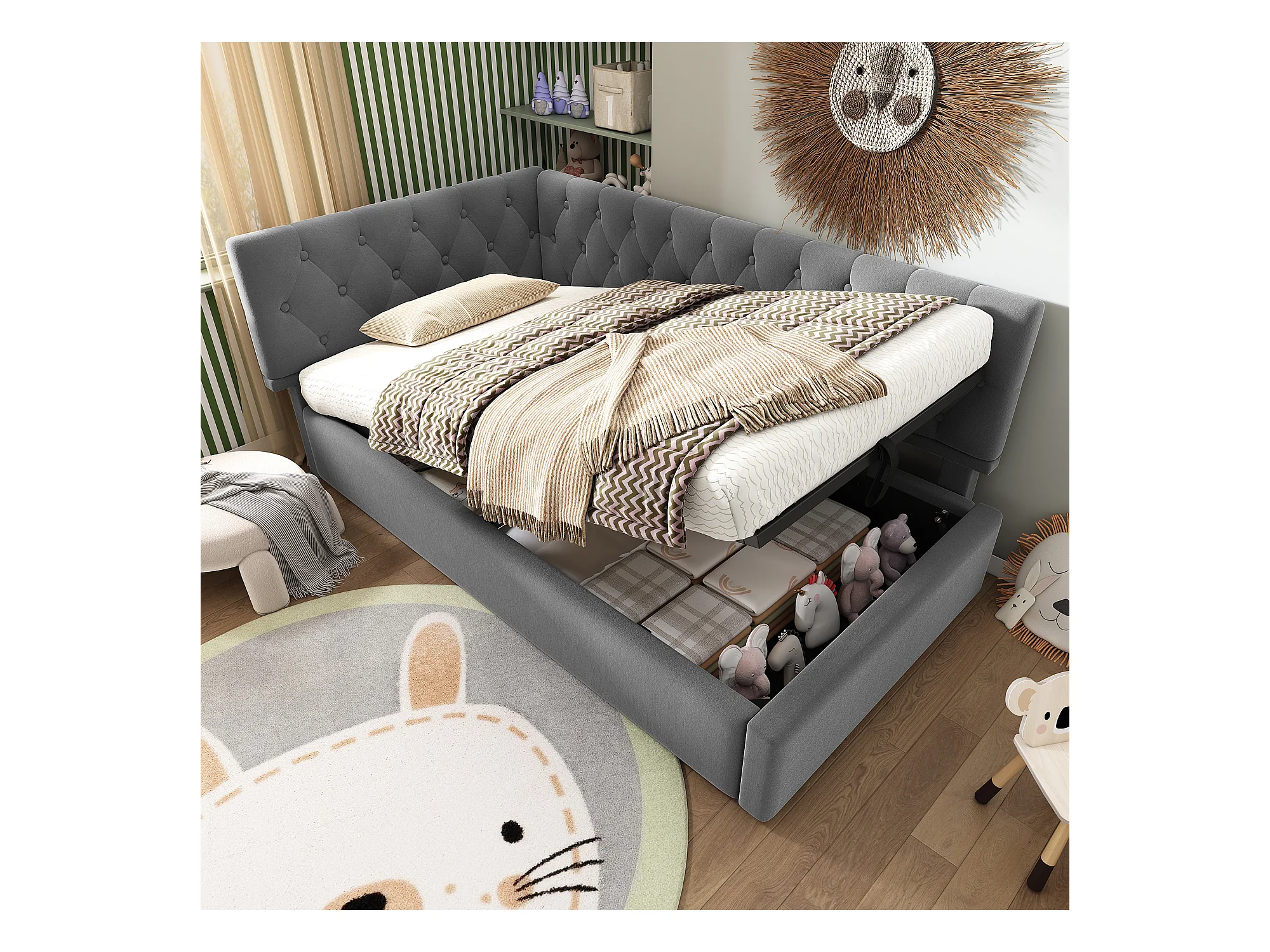 Kinder opbergbed 90x190 cm van grijs fluweel met leeslamp en USB-C, met houten lattenbodem, zonder matras
