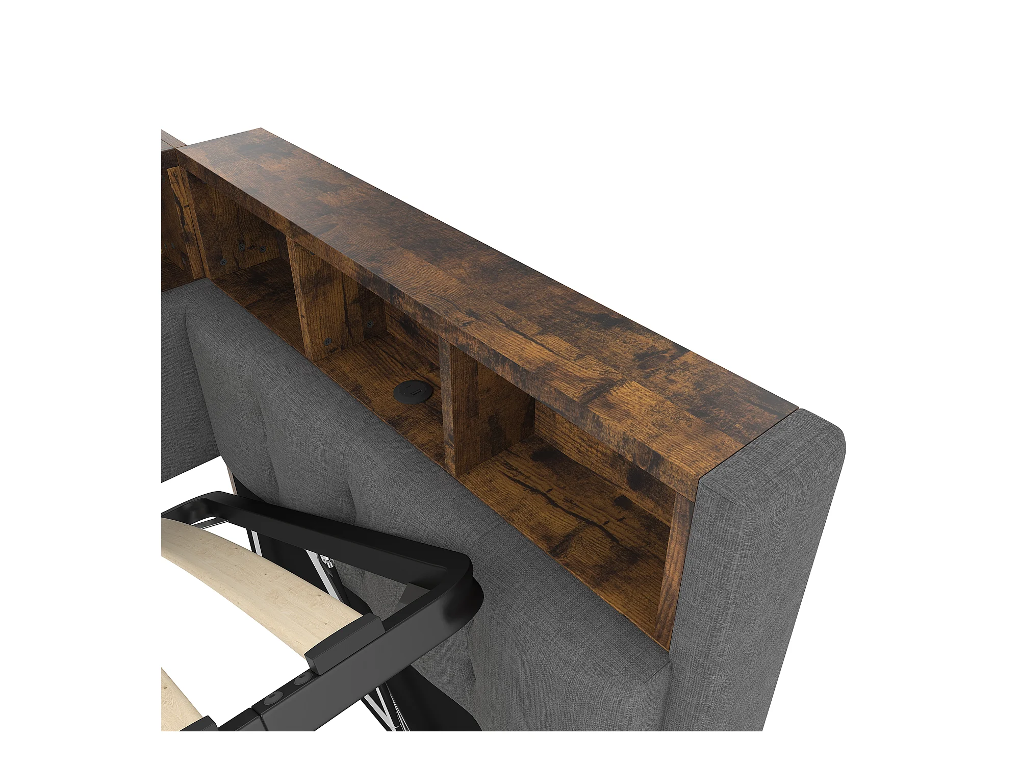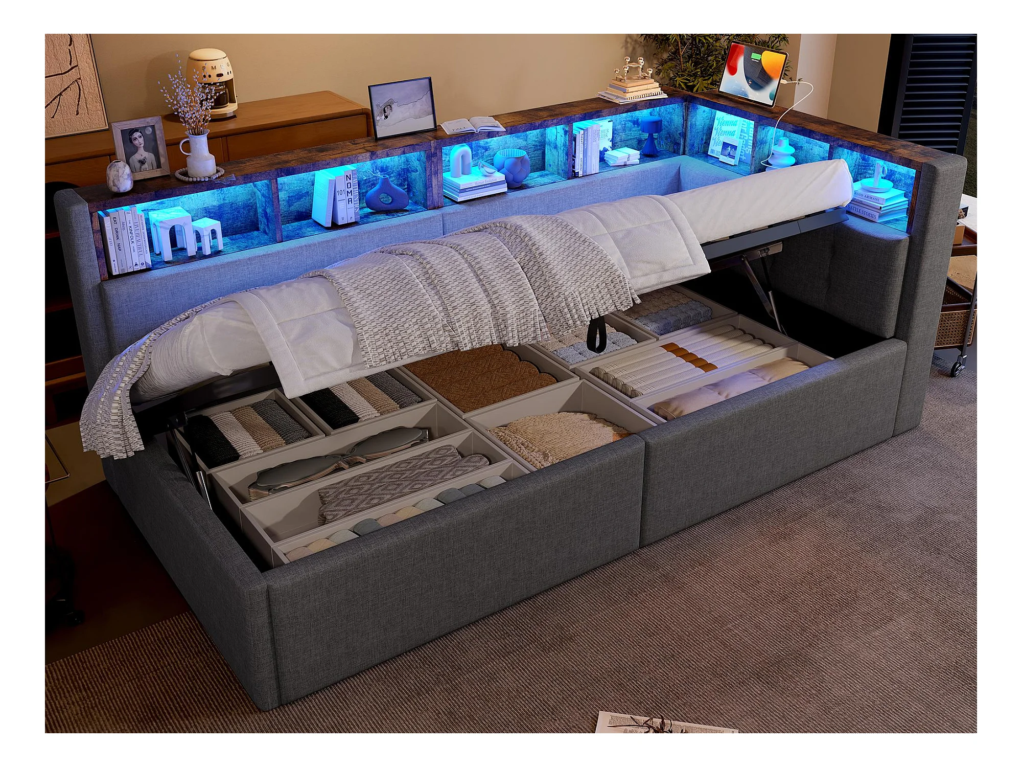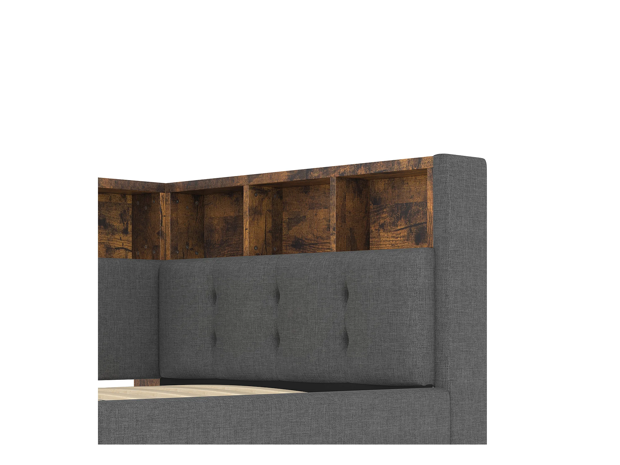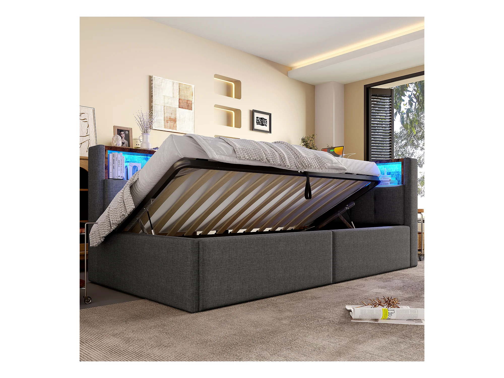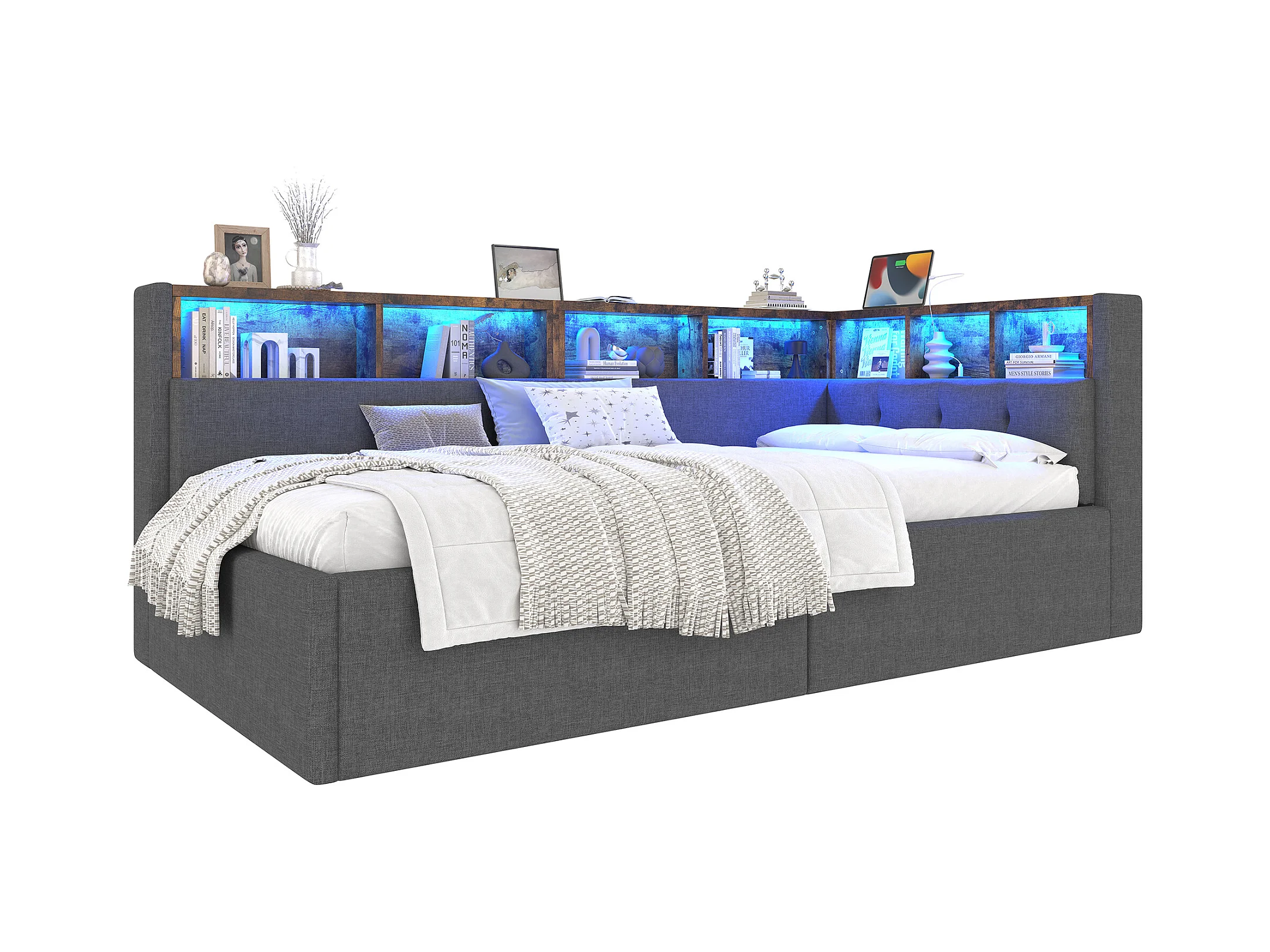Slaapbank met opbergruimte 90x200 cm - met USB + Type-C aansluitingen - meerdere opbergmogelijkheden - met LED-lichtstrip - grijs (matras niet inbegrepen)