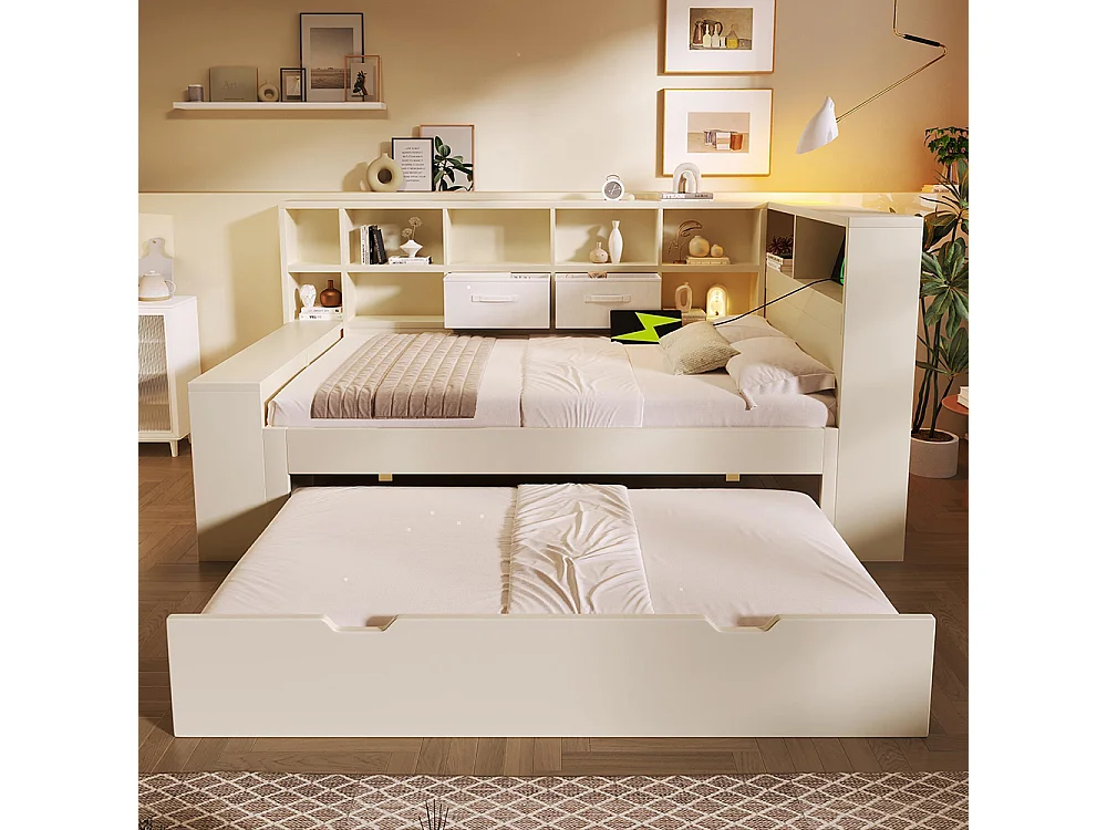 Slaapbank, met uitschuifbed, opbergplank aan drie zijden en geïntegreerde USB/Type-C-oplaadpoorten, wit - 90x200