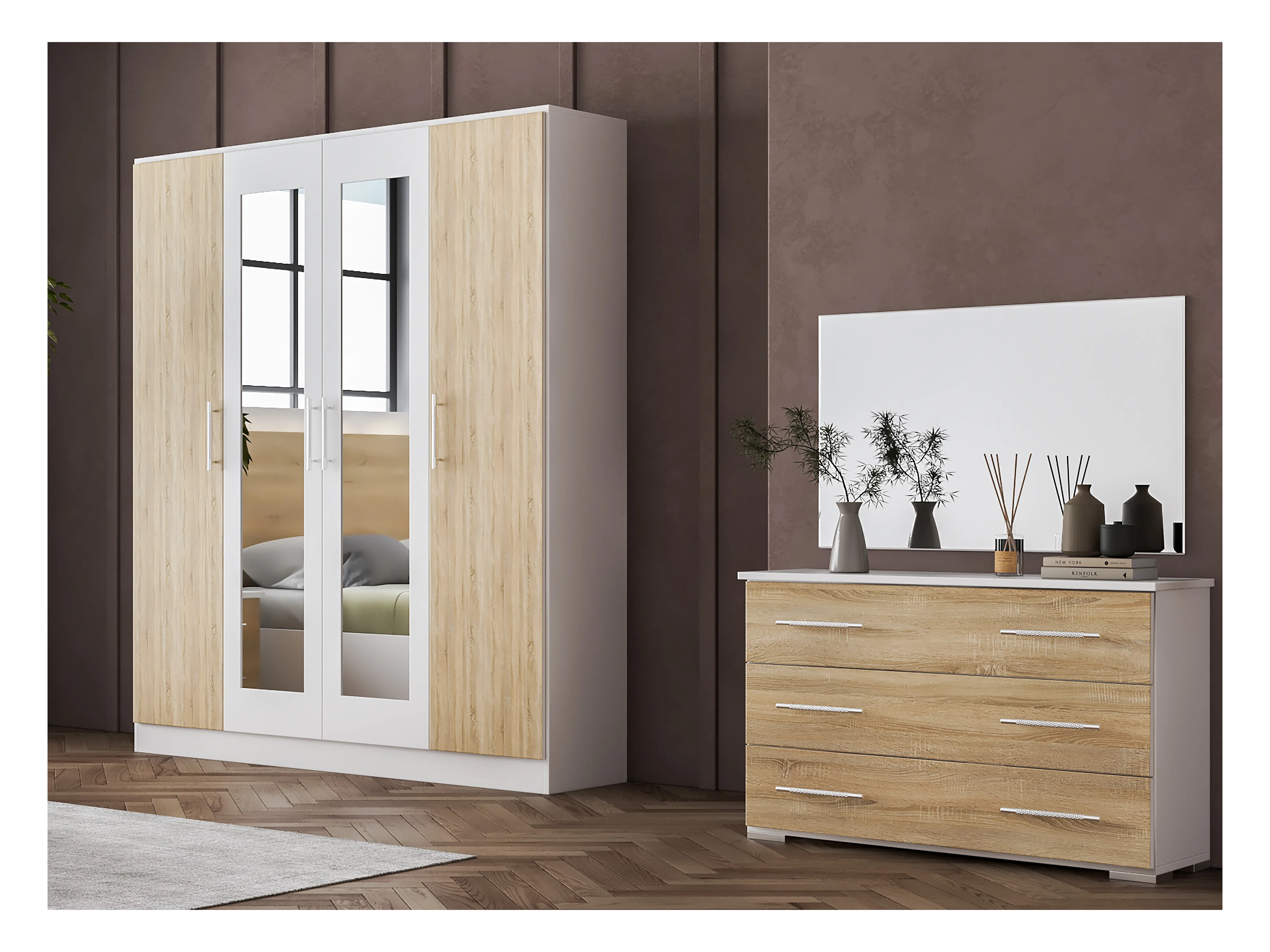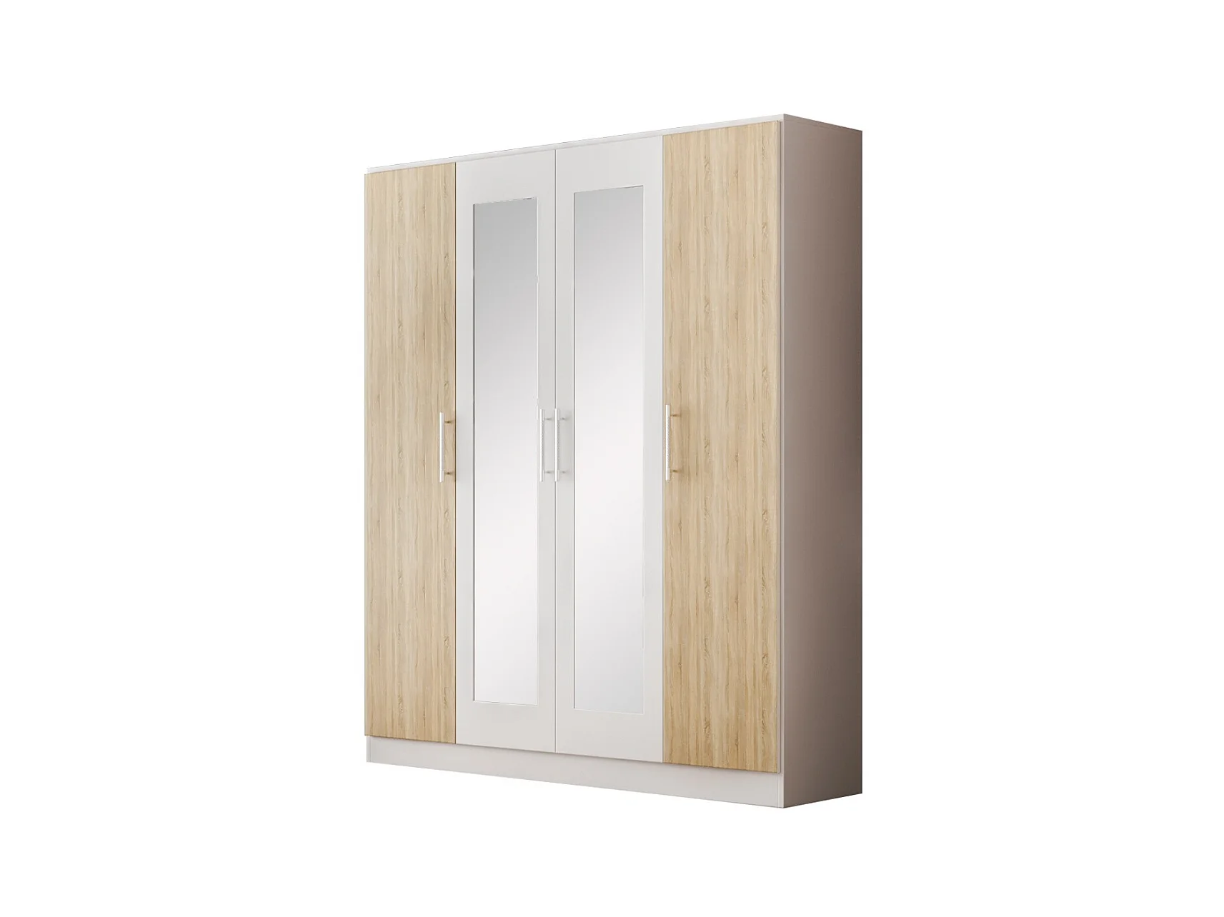Slaapkamerkast met 4 draaideuren in glanzend wit hout en mat natuurlijk hout Dova 162 cm
