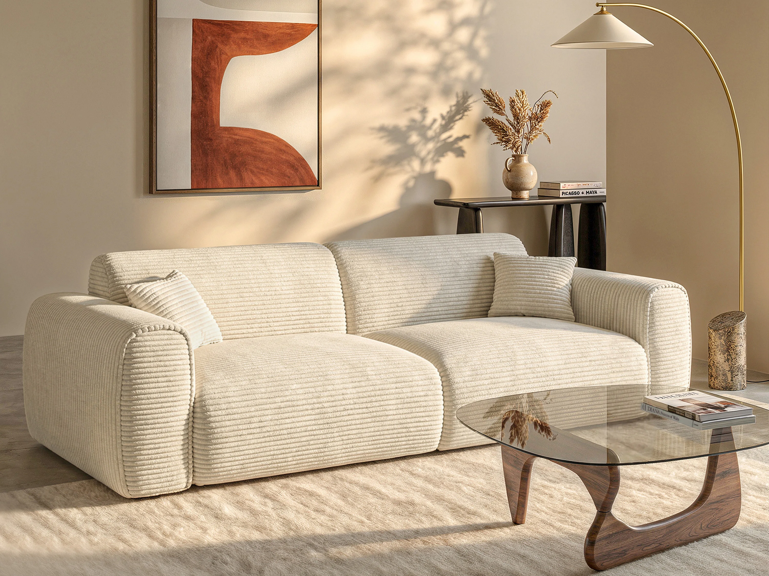 Snel om te bouwen slaapbank met 4 zitplaatsen in beige ribfluweel POGNIA