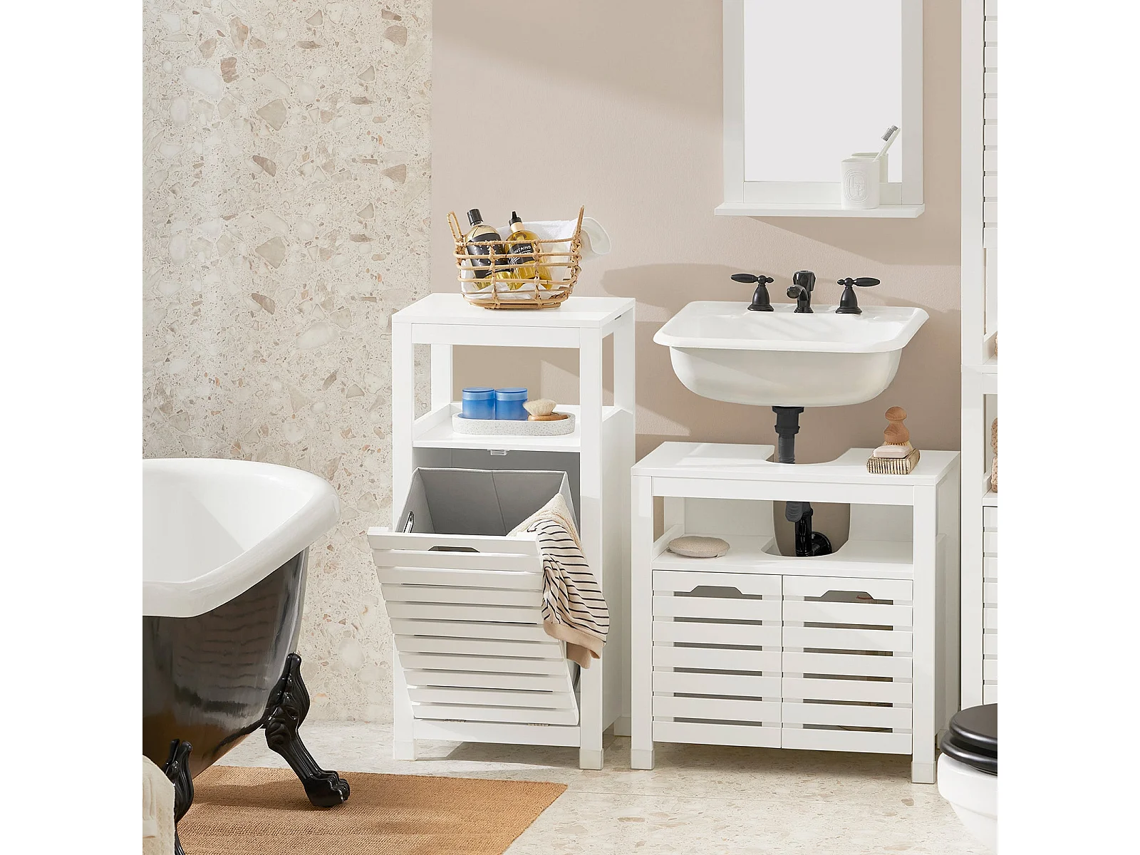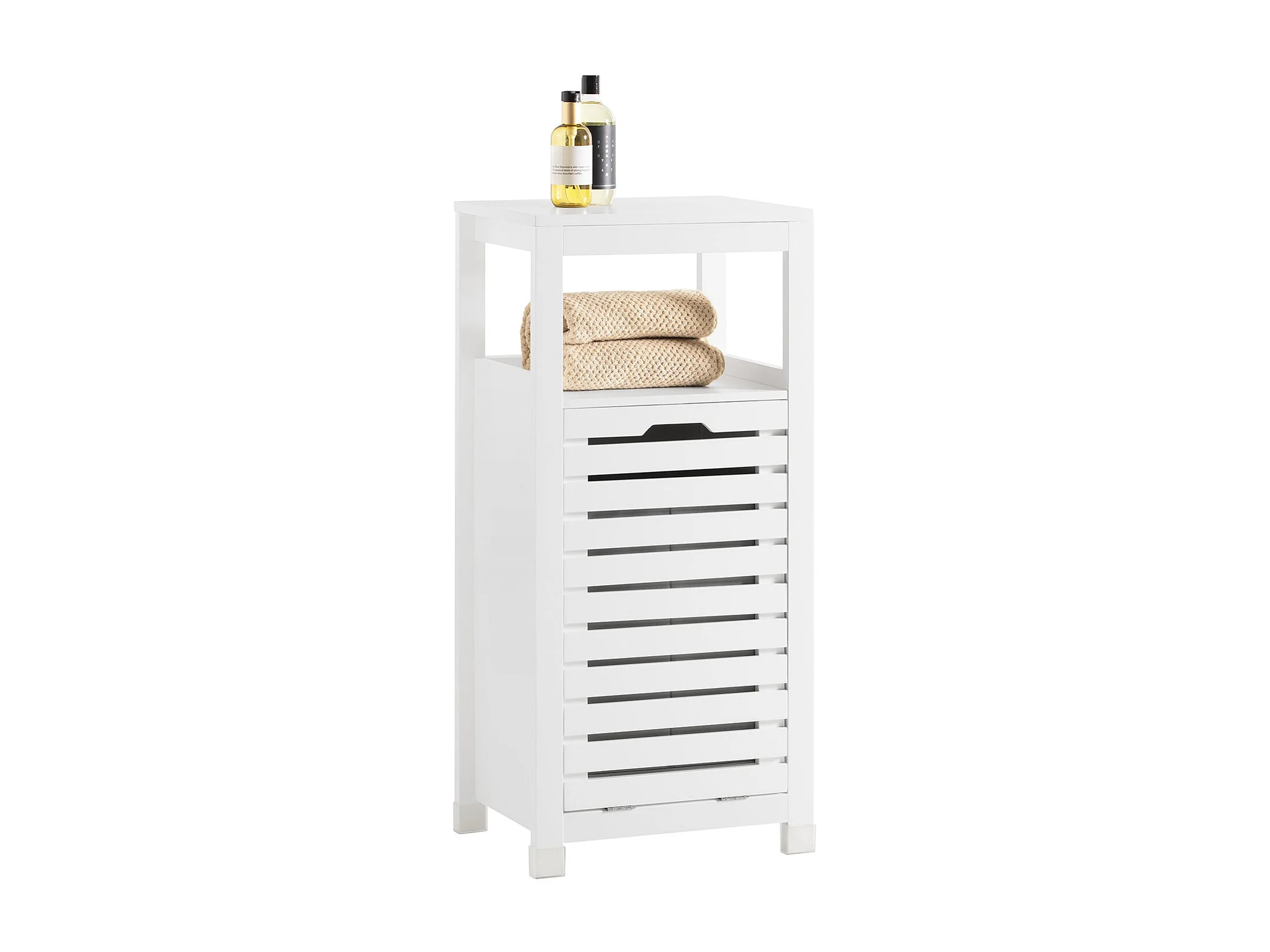SoBuy BZR67-W Badkamermeubel, Badkamerkast, Halfhoge Opbergkast, Lage Kast, Smal Badkamerkastje, Opbergkast met 1 Kantelbare Wasmand