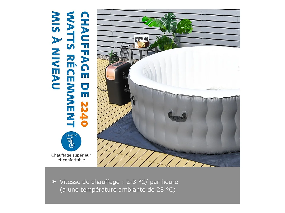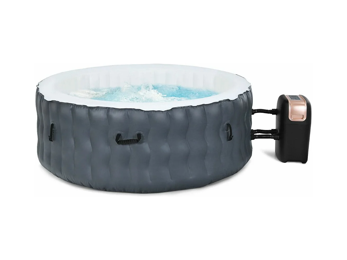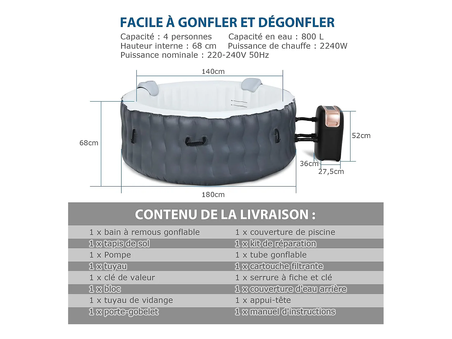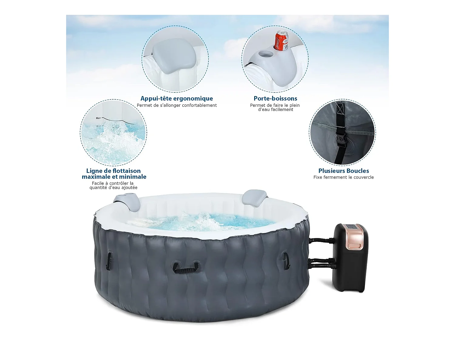 Opblaasbare spa, 2 tot 4 personen, 180 x 68 cm, draagbare ronde spa met 108 massagejets, patroonfiltratie en beschermende spa-afdekking, grijs (met hoofdsteun en bekerhouder)