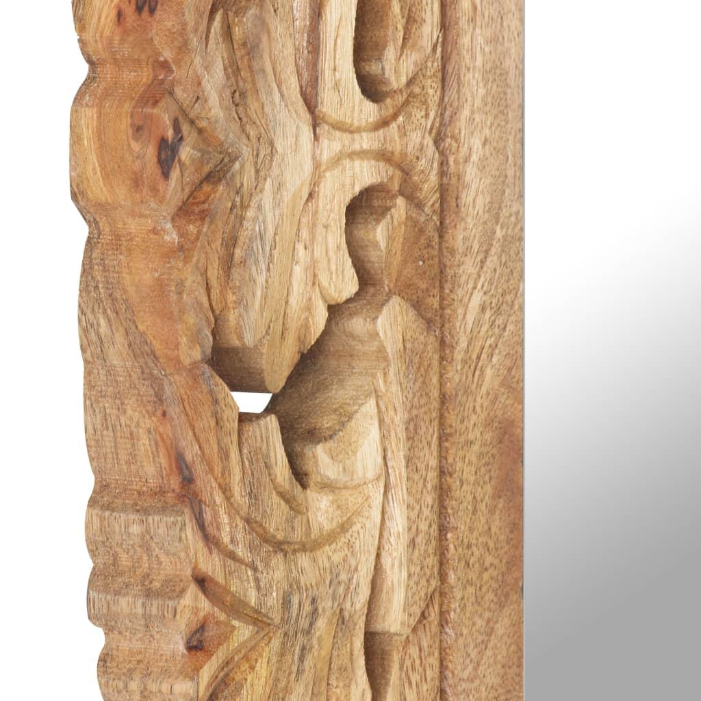 Massief mangohout is een tropisch hardhout. Het heeft de kracht om veel gewicht te dragen en is bestand tegen slijtage. Bovendien zorgen het voortreffelijke vakmanschap en de prachtige houtnerven ervoor dat elke houten spiegel net iets anders is dan de rest. Het met de hand gesneden patroon draagt bij aan de schoonheid.