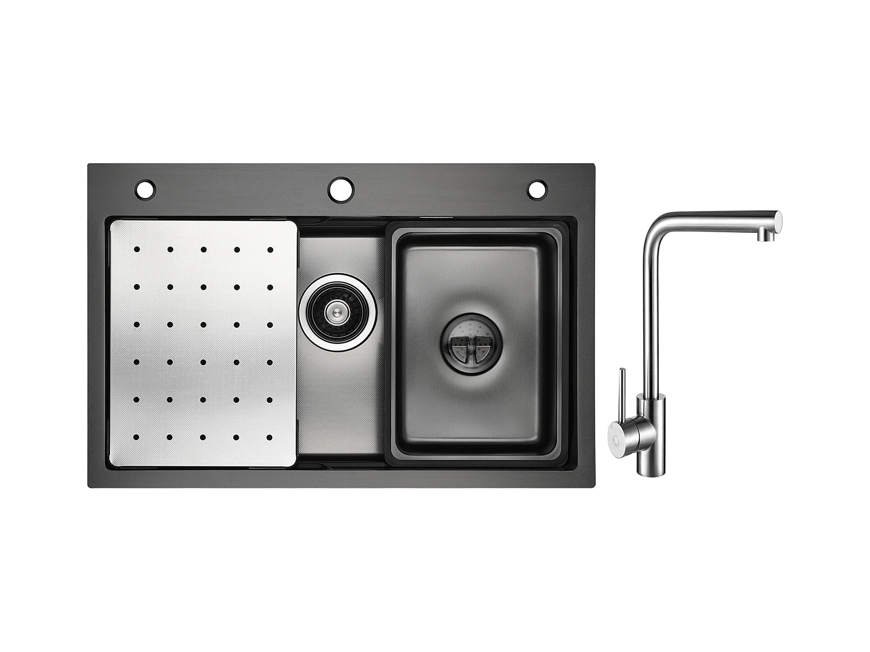 Cecipa max 1 spoelbak 70×45CM Zwart met afdruiprek, wastafel en zeepdispenser + Zwarte keukenmengkraan met uittrekbare spray
