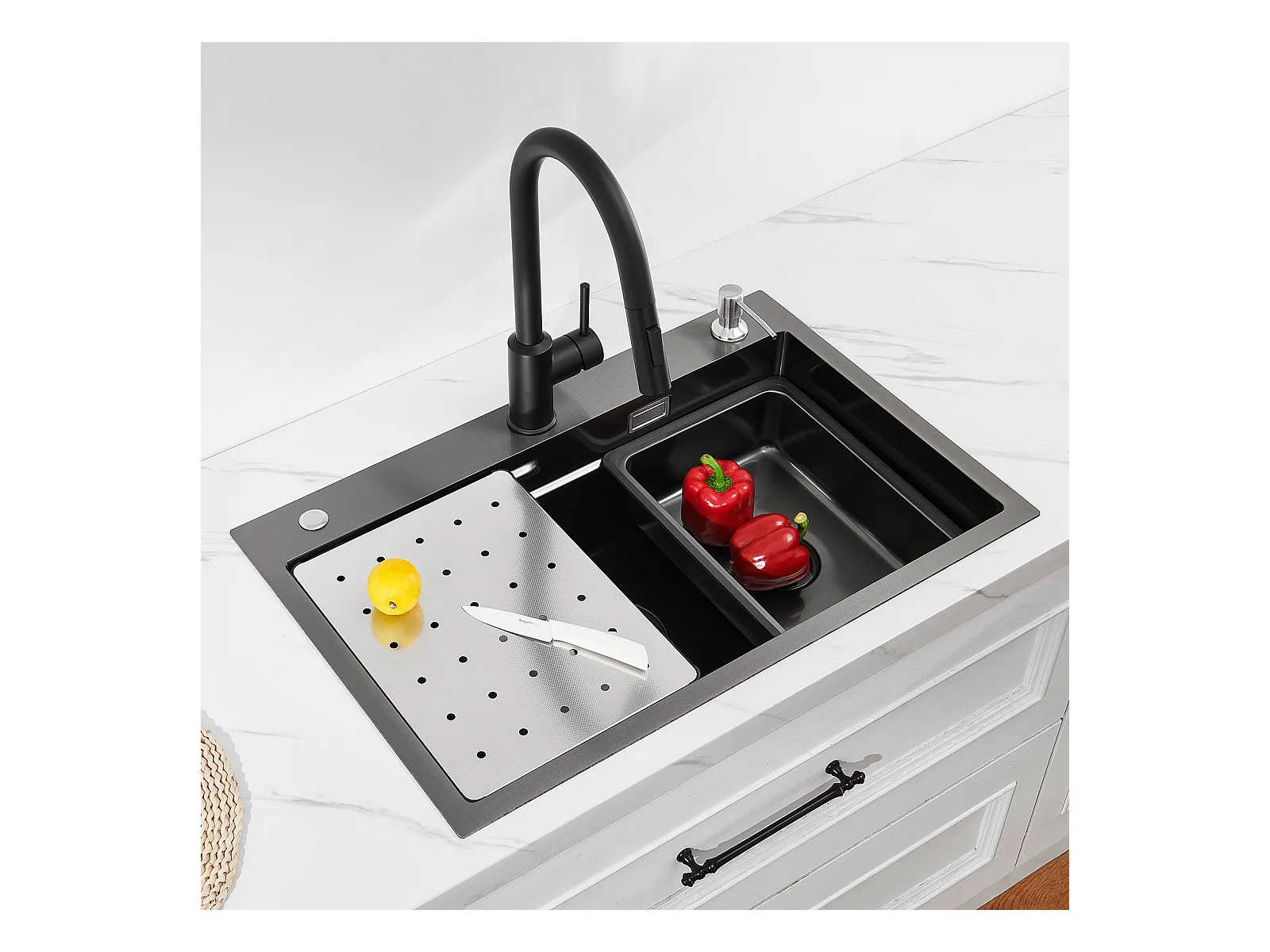 Cecipa max 1 wastafel 70×45×21,5CM zwart met afdruiprek, wastafel en zeepdispenser + mengkraan met uittrekbare spray 2 waterafvoermodi