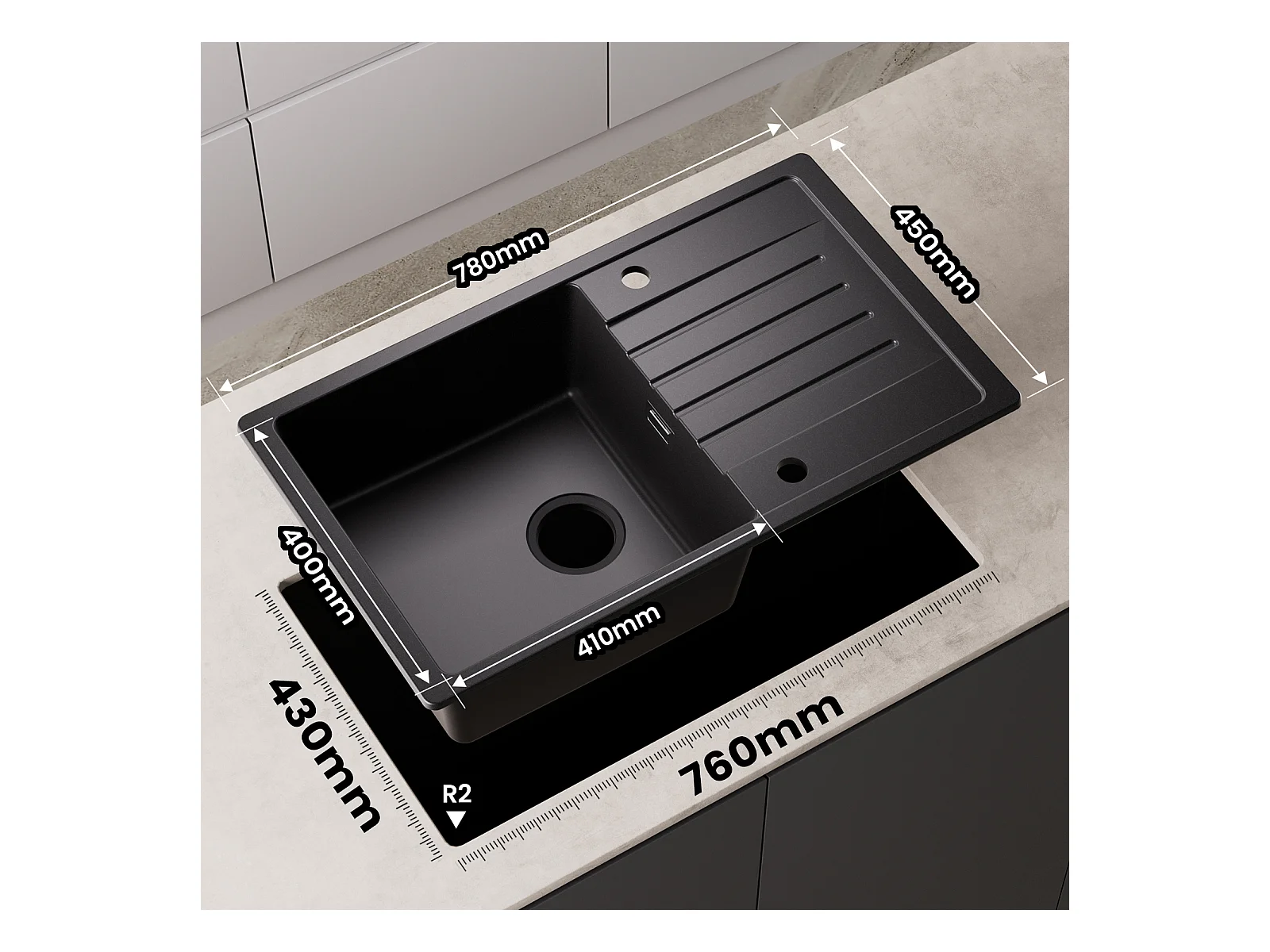 Cecipa max 1 wastafel in kwarts en hars - ingebouwde spoelbak met afdruiprek - 78x45cm 1 wastafel zwart granieten aanrecht, EU-model