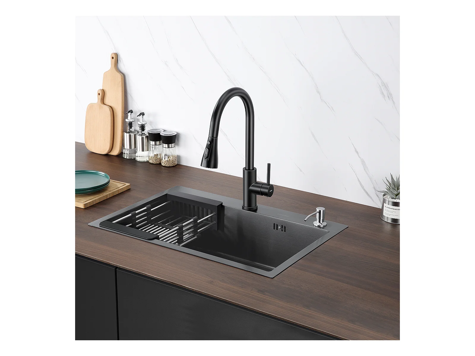2in1 Wastafel Zwart 68x45x19CM met Zeep/EgootverdelerTtoir mand + veerkeukenkraan met uitschuifbare handdouche, 2 modi, geborsteld
